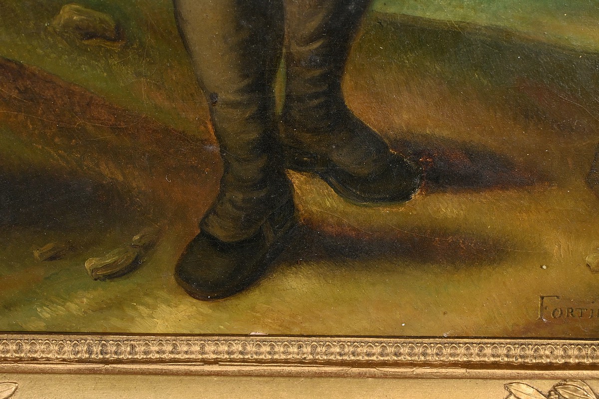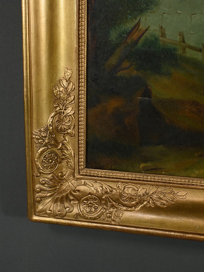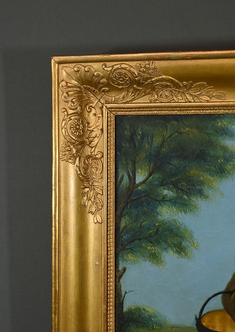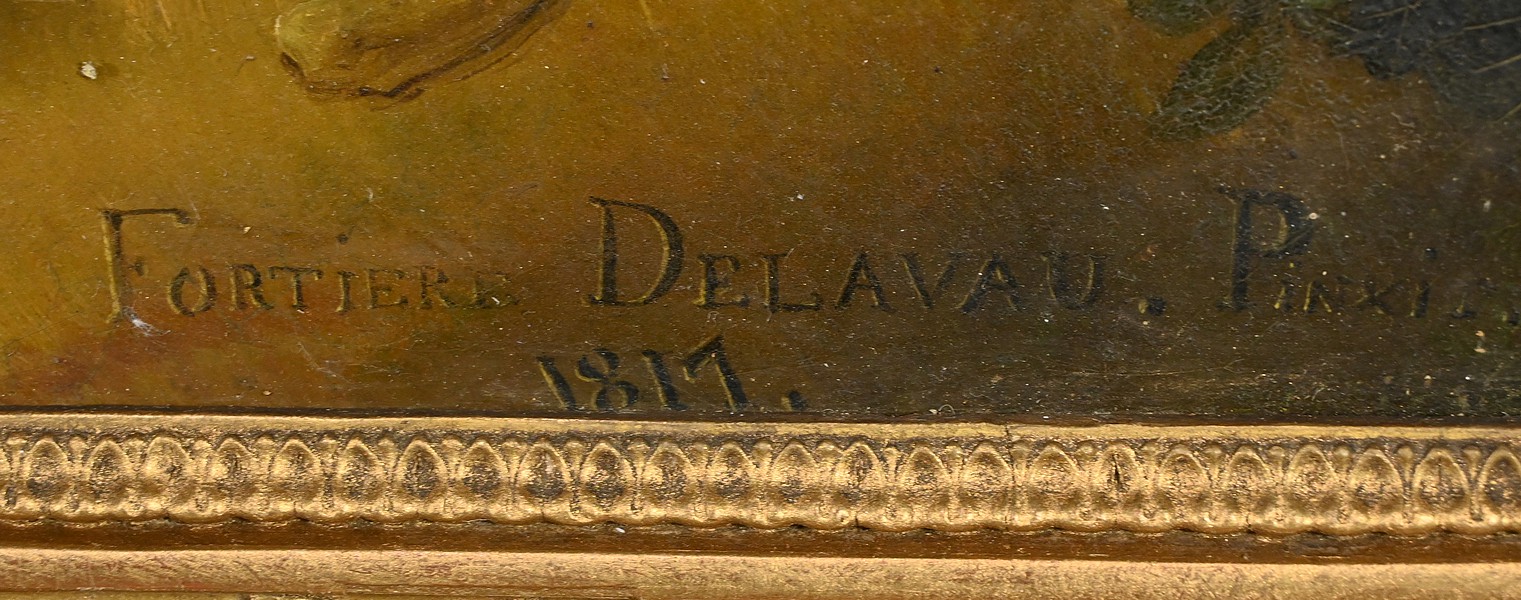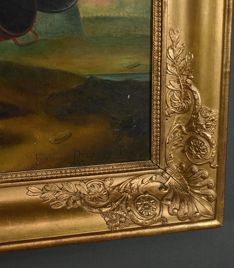 Cette œuvre signée Fortière Delavau est accompagnée d’un magnifique cadre mouluré en bois doré richement ornementé de sculptures dans chacun de ses angles.