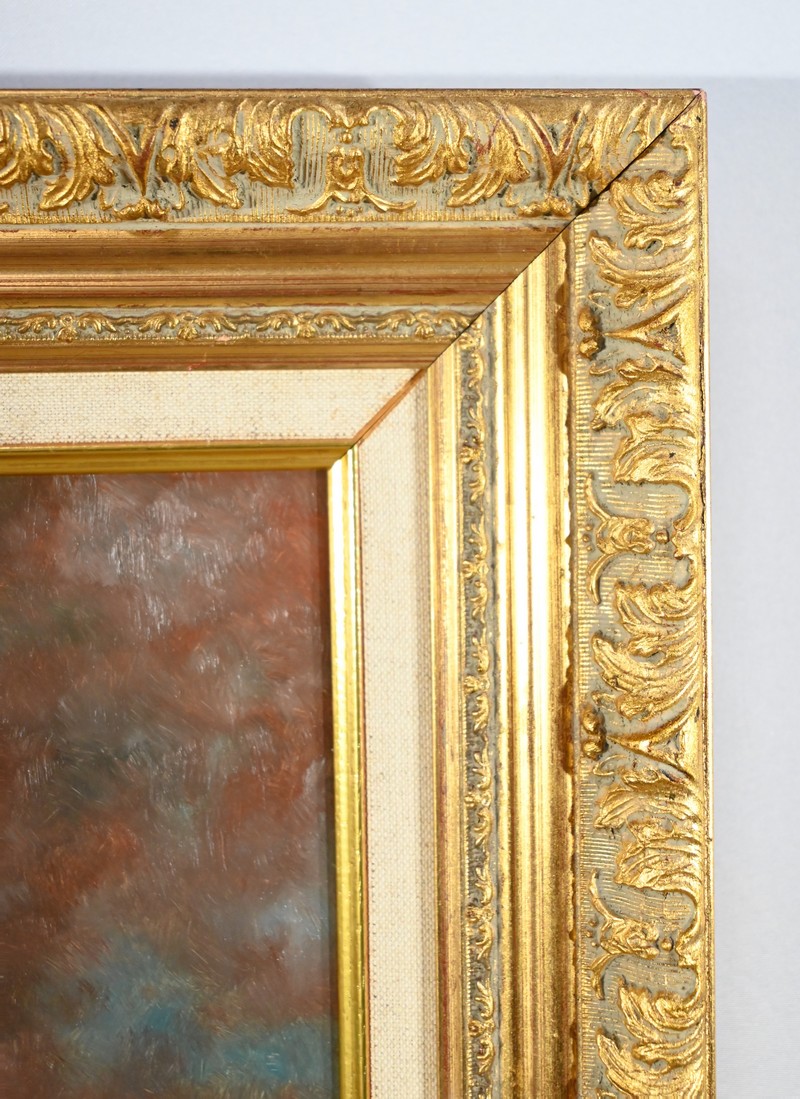 Cette toile est mise en valeur par un cadre doré à motifs de calices en frise donnant naissance à des feuillages.