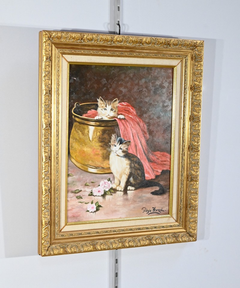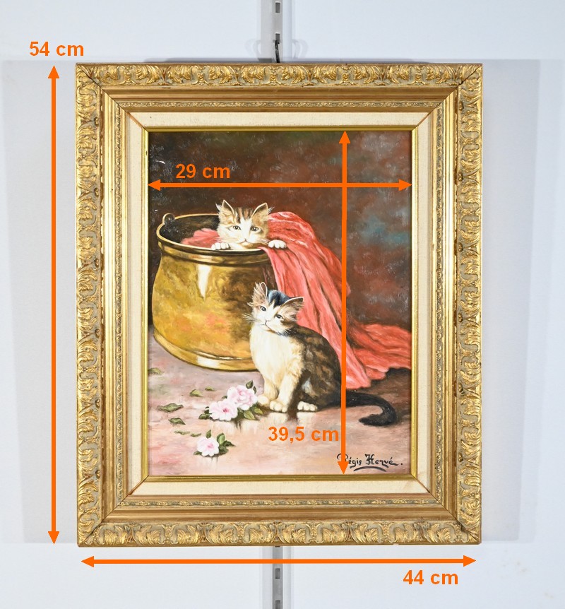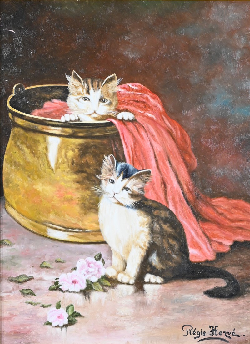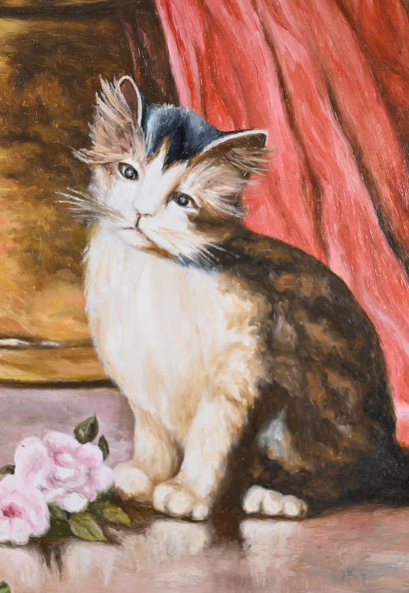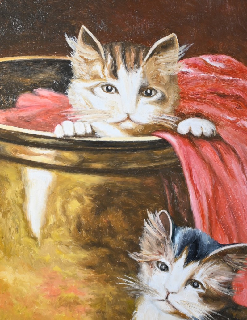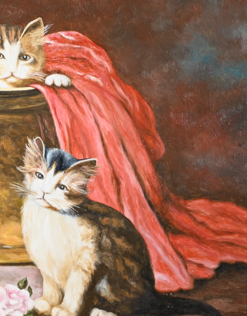 Ce tableau figure deux chatons espiègles. L’un, dans une bassine en cuivre, joue avec un long tissu tandis que l’autre s’amuse avec de malheureux lambeaux de fleurs.