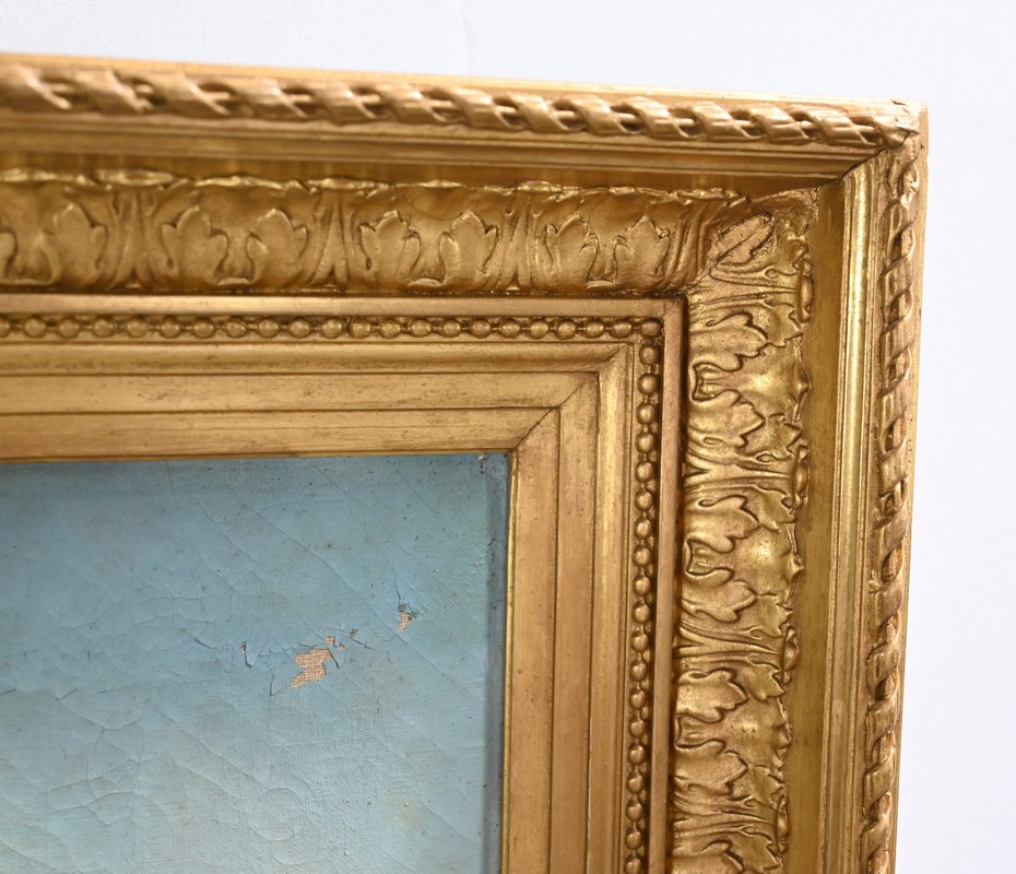 Cette toile est mise en valeur par un cadre doré à décor de cordelette, de perlé et de frise de feuilles d’acanthe.