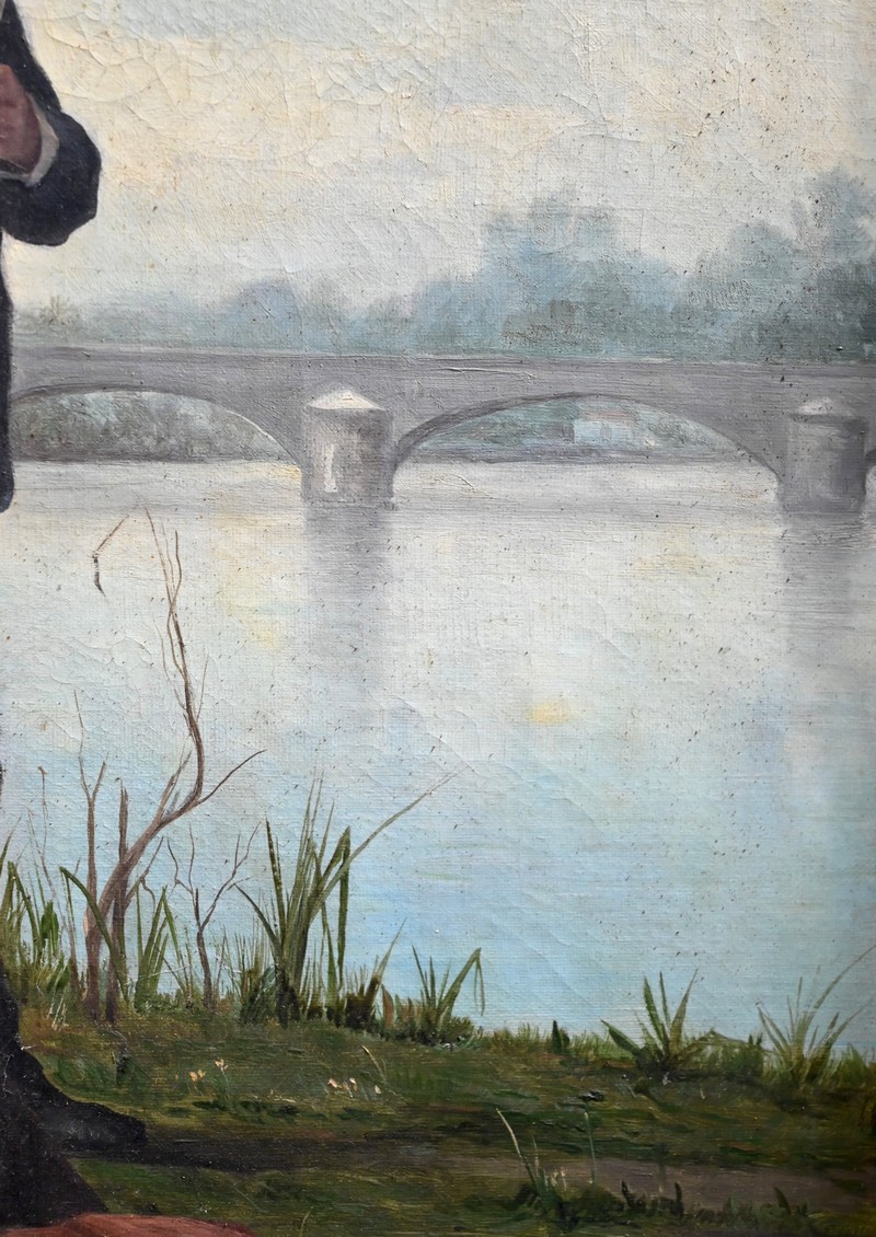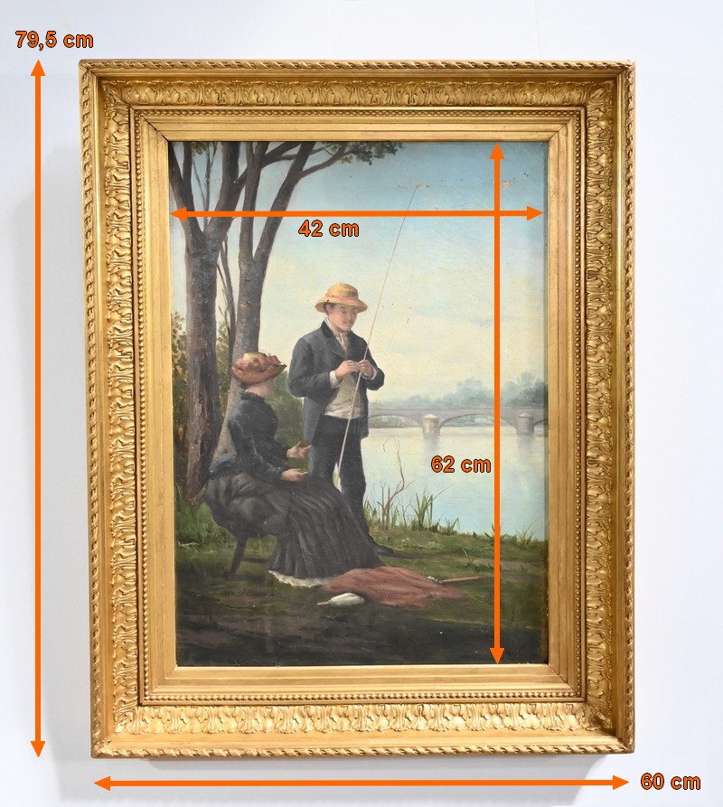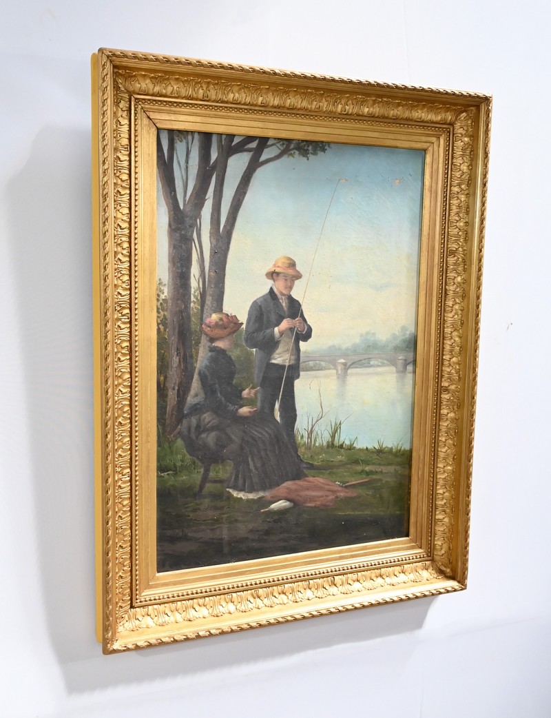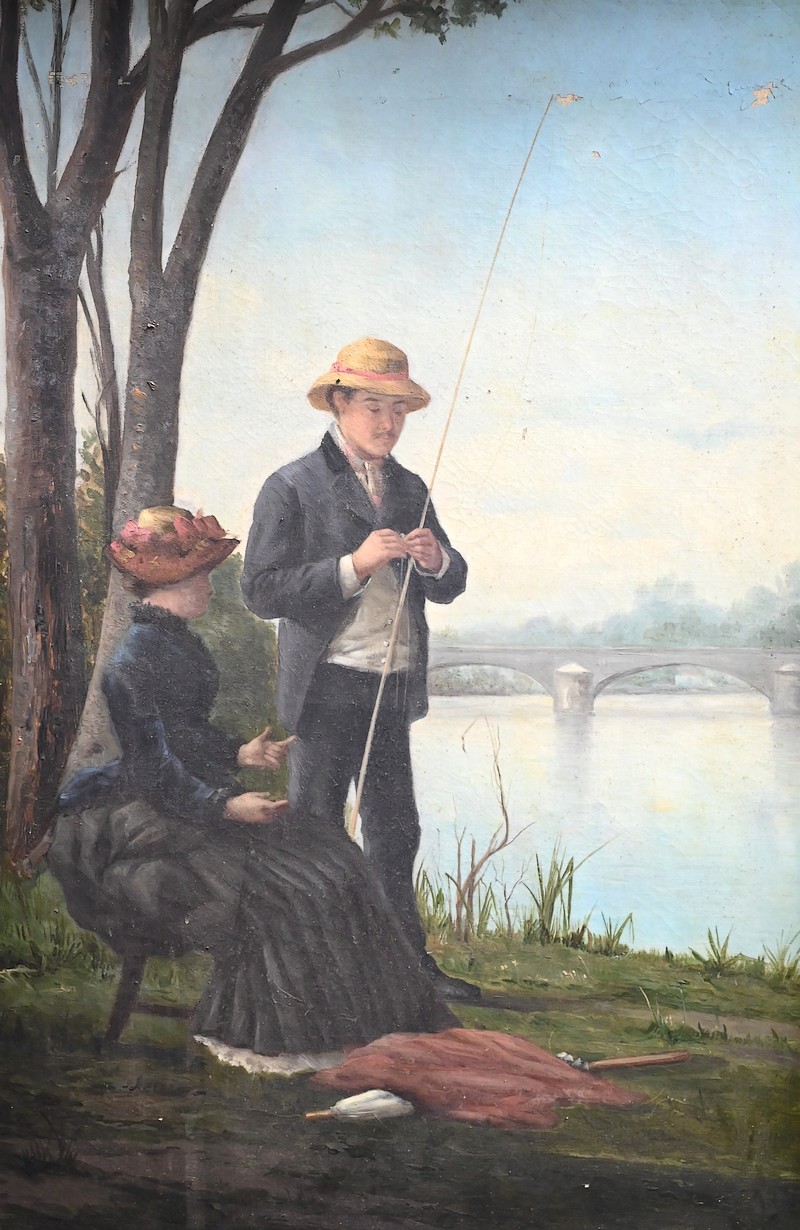 Cette œuvre figure un pêcheur à la ligne et sa femme sur les berges d’un fleuve.