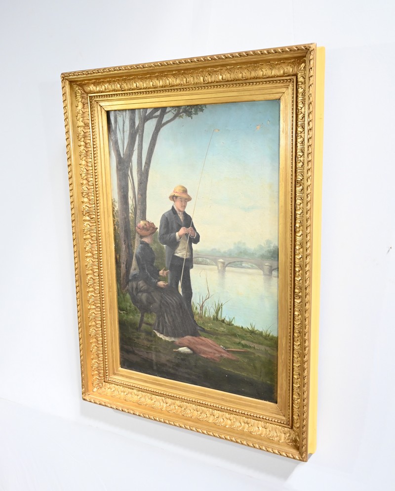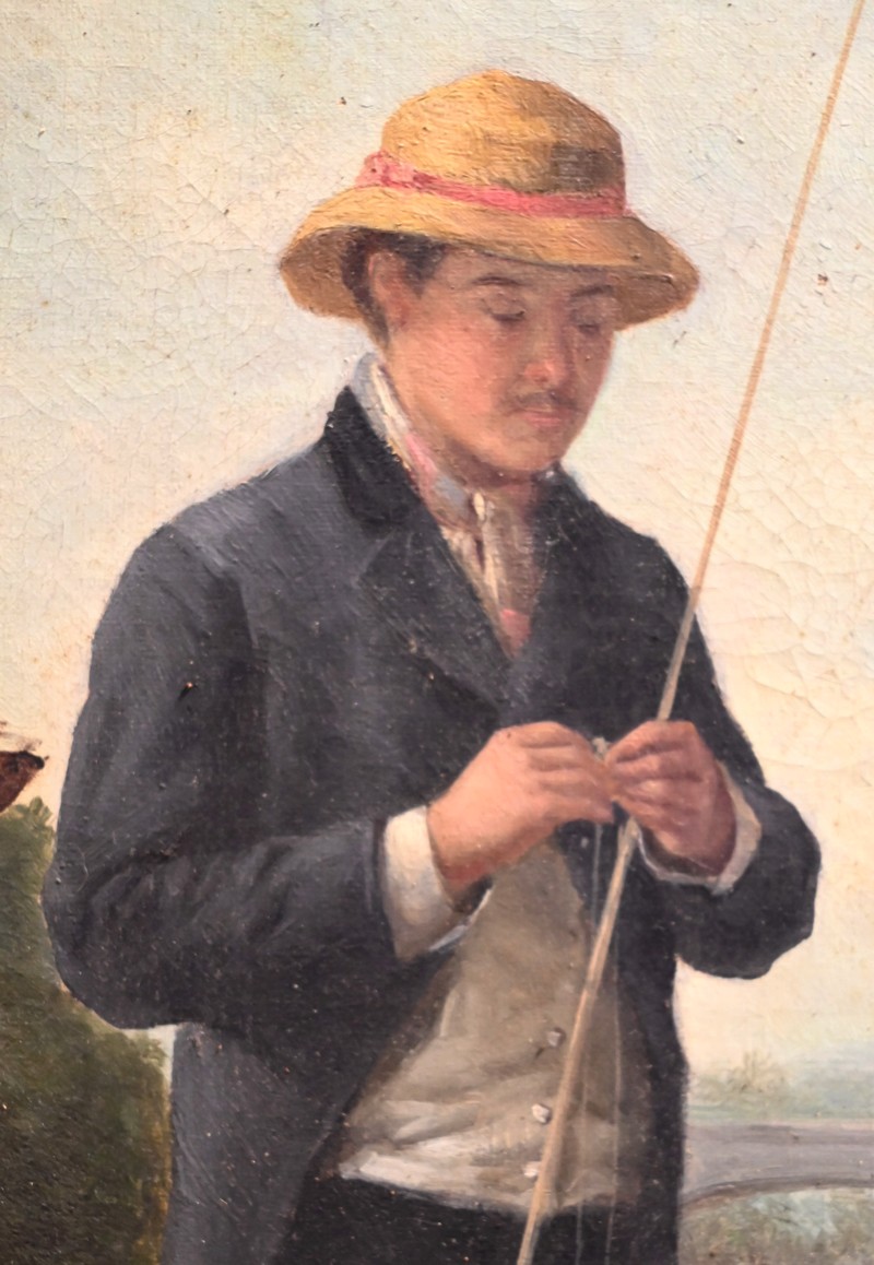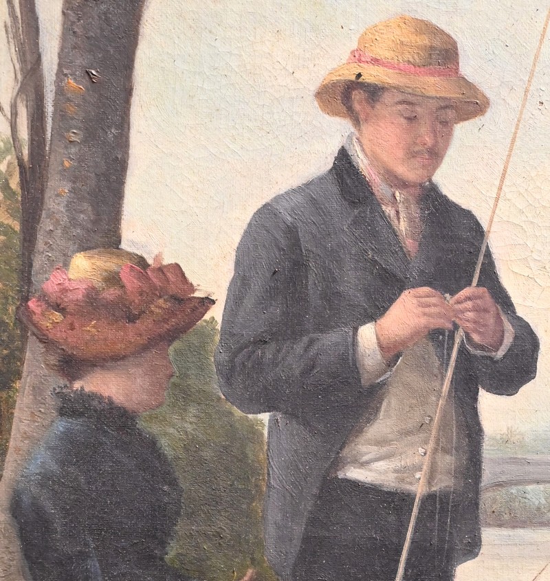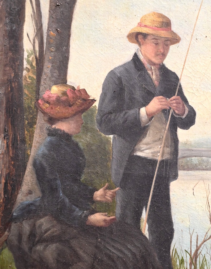 Cette dernière, assise, semble tenir une discussion avec son compagnon totalement absorbé par la préparation de sa canne à pêche.