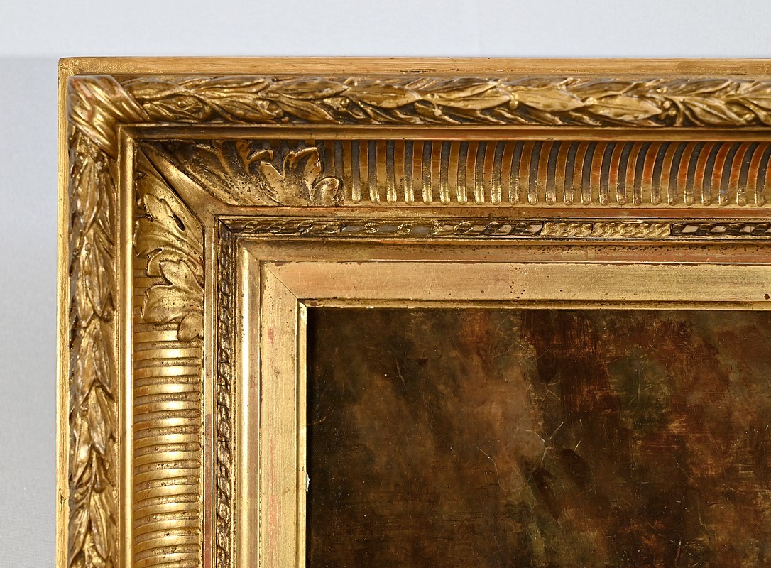 Ce tableau présente un cadre doré, sculpté de rinceaux, de fleurs d’acanthe et de frises.