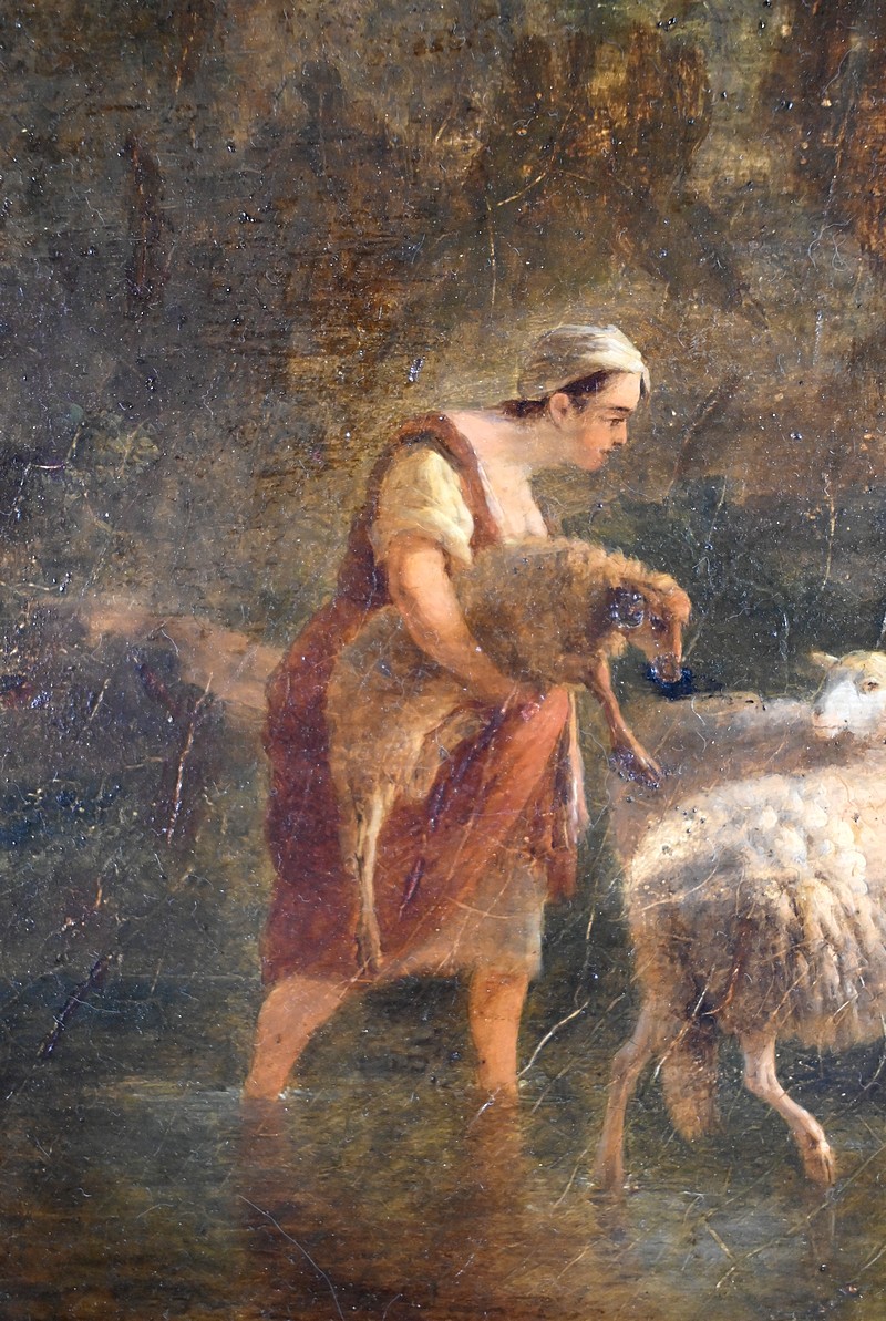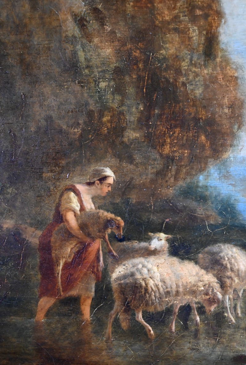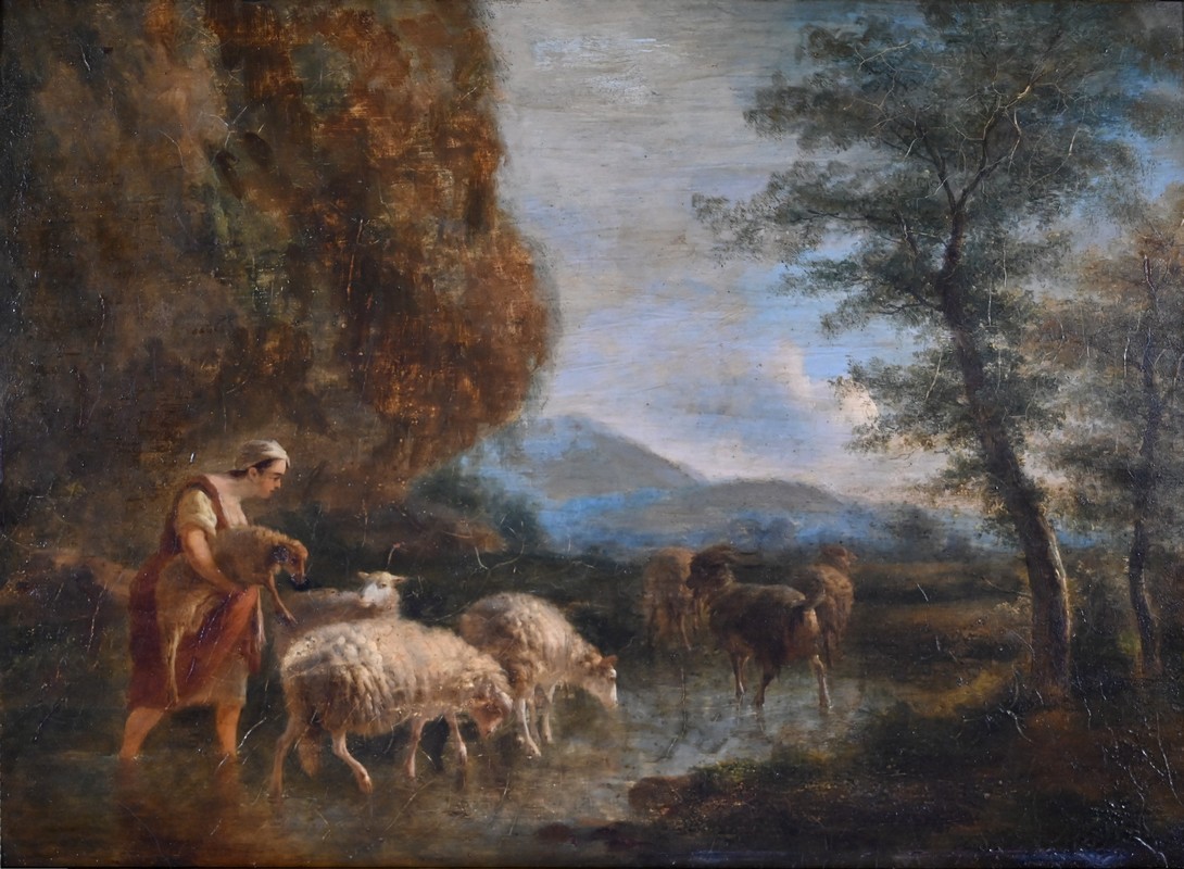 Le sujet de la bergère aux moutons abordé dans de nombreuses œuvres, est ici traité avec un jeu de luminosité très prononcé. Le troupeau sort de l’obscurité de la forêt se dirigeant vers les plaines et montagnes visibles en arrière-plan, pour y paître de longs mois.