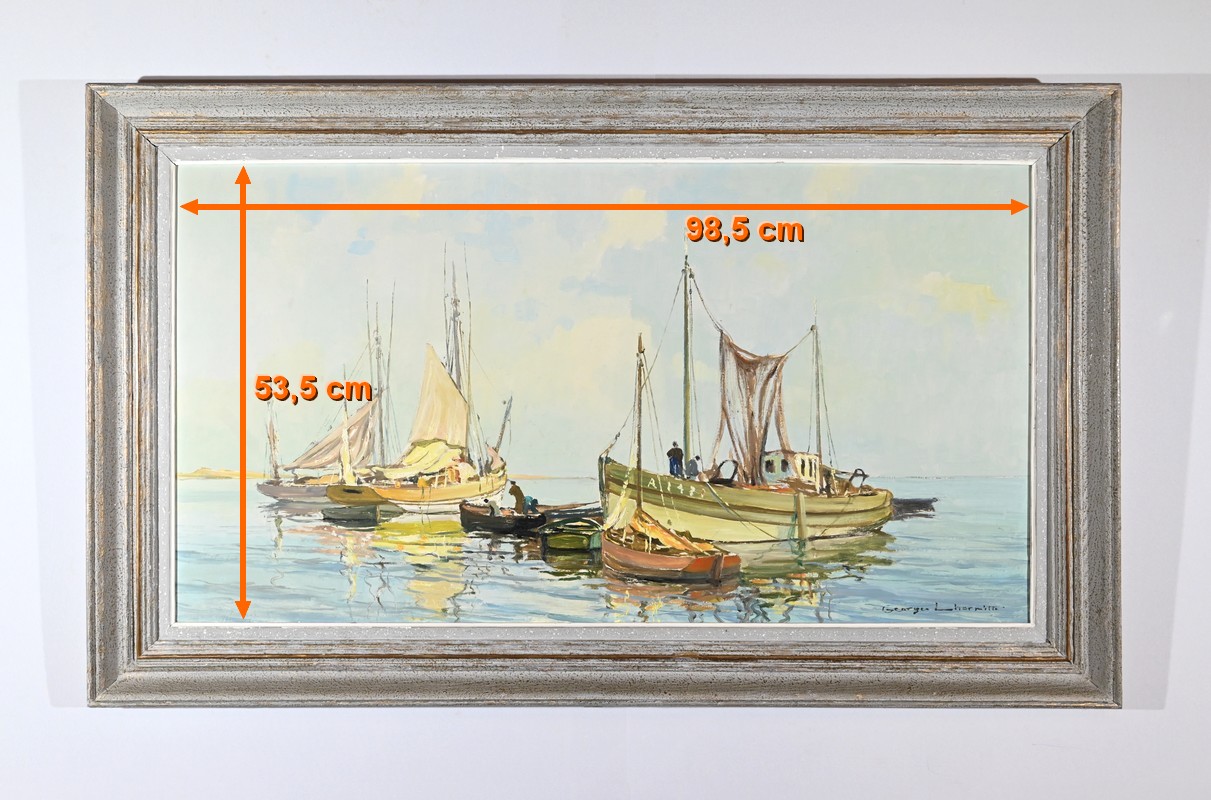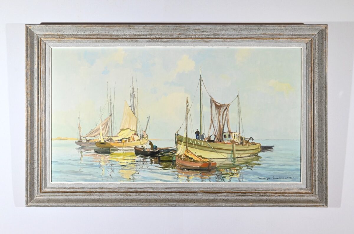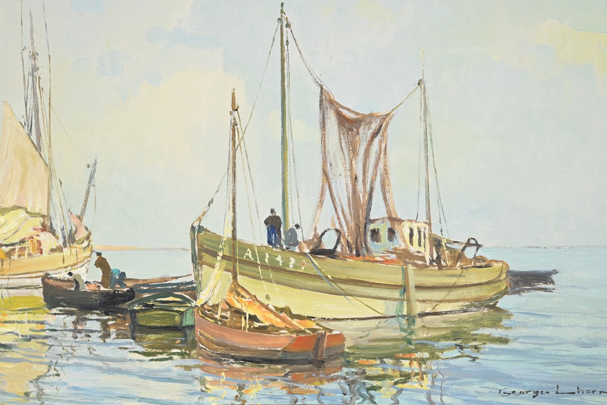 Peinture à l’huile sur Isorel, titrée au dos « Chalutier et Thoniers », signée Georges Lhermitte (1882-1967).