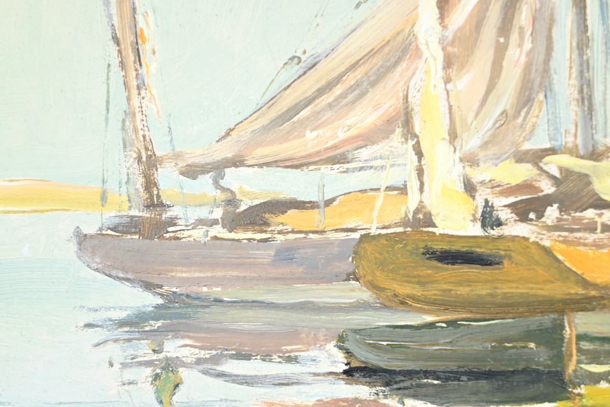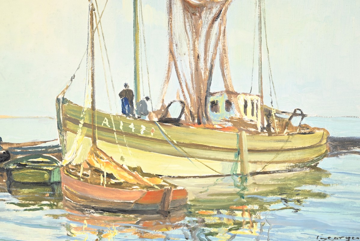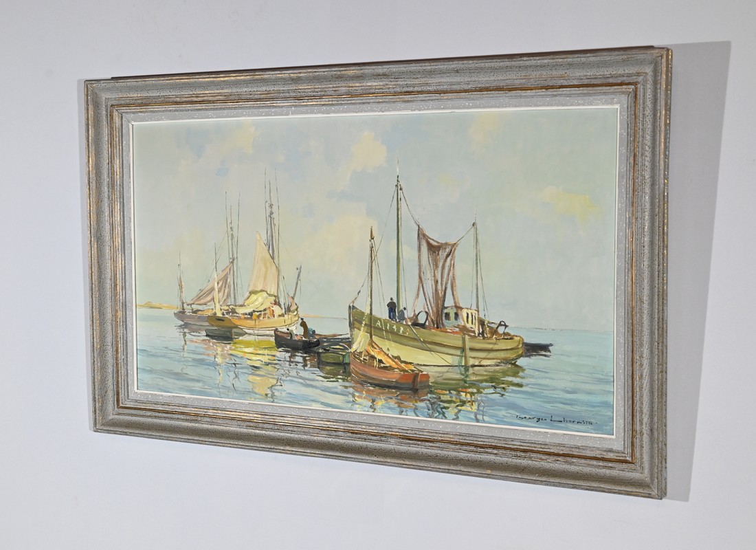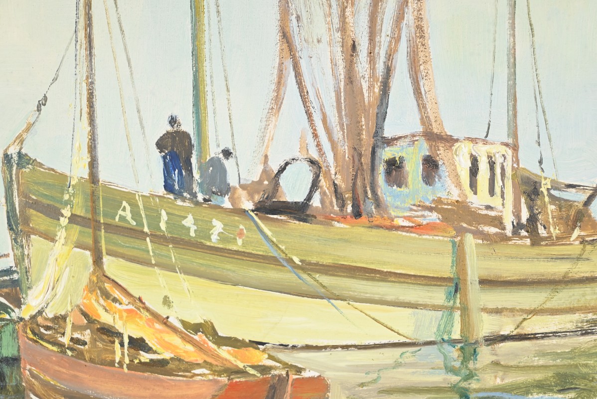 Peinture à l’huile sur Isorel, titrée au dos « Chalutier et Thoniers », signée Georges Lhermitte (1882-1967).