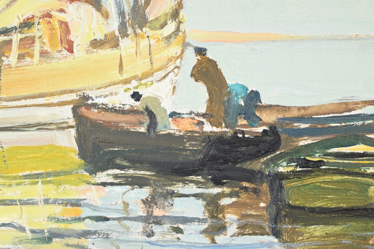 « Chalutier et Thoniers » représente une scène de pêche. En pleins préparatifs pour le départ en mer, les pécheurs gagnent leurs bateaux à l’aide de petites embarcations.