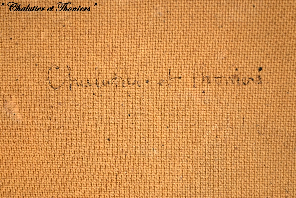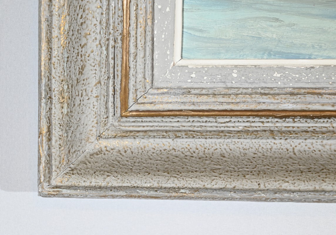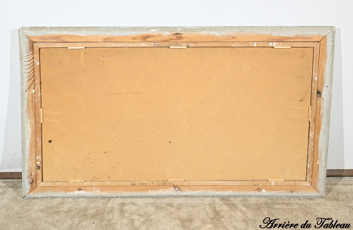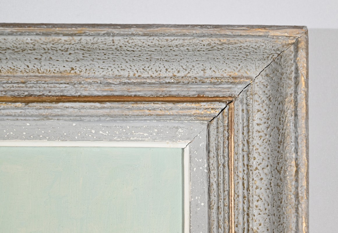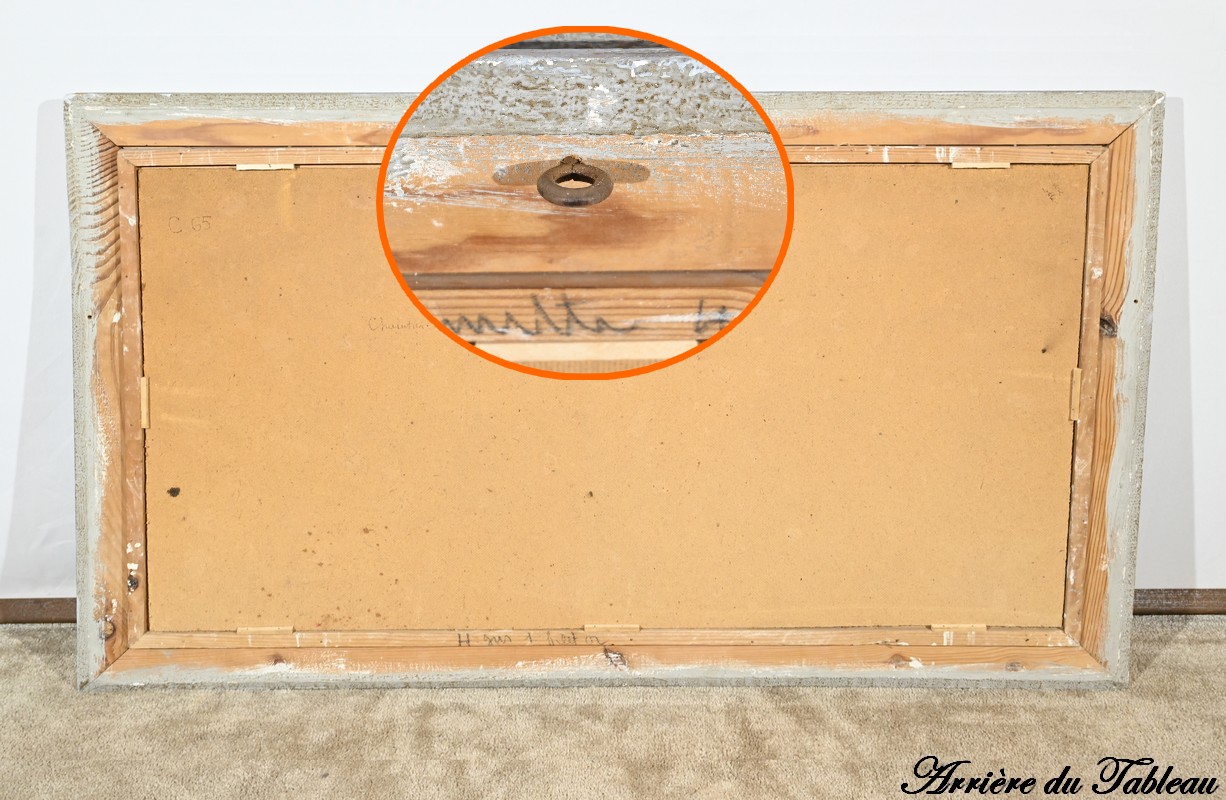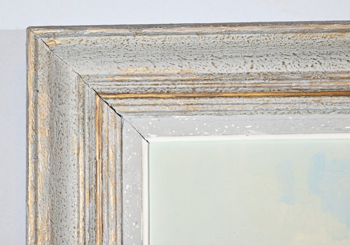 Ce panneau d’isorel peint est souligné par un cadre de couleur blanc antique avec filet doré.