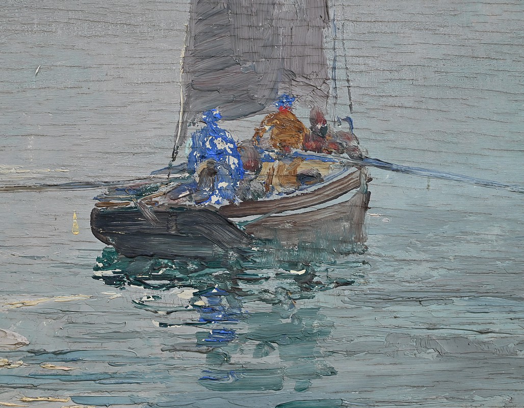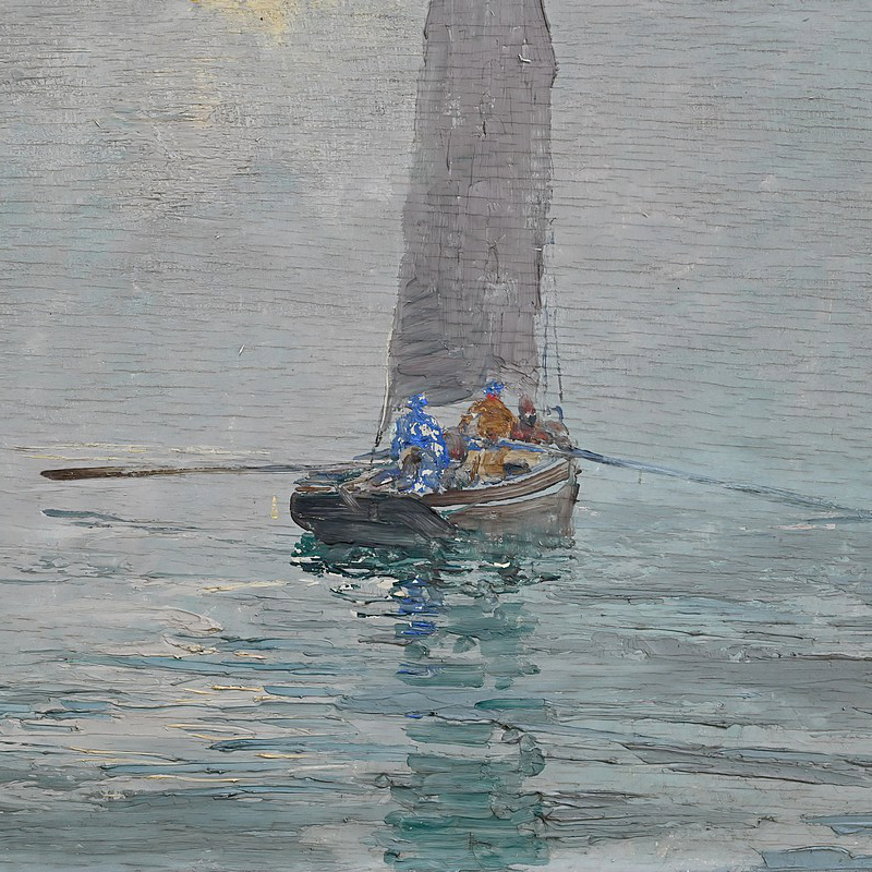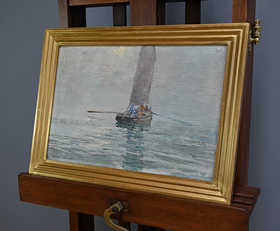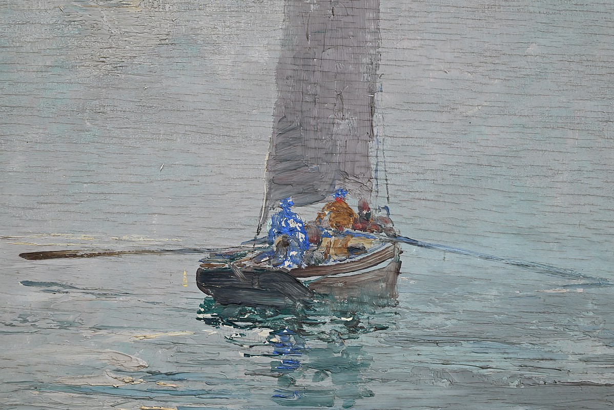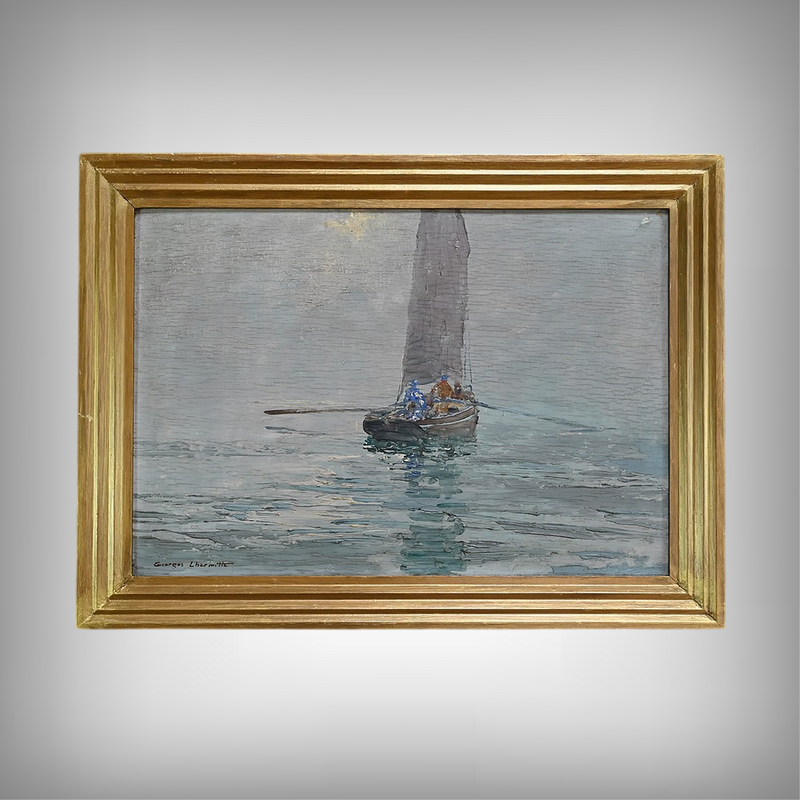 Dans cette huile sur panneau de 1934, Georges Lhermitte nous plonge dans une scène maritime d’une grande délicatesse, où le silence semble avoir pris le dessus sur le monde. Le tableau représente un voilier solitaire, glissant lentement sur une mer d’huile, enveloppée d’une brume épaisse et cotonneuse. La voile grise, tendue mais paisible, capte la lumière diffuse du ciel, tandis que des silhouettes humaines se tiennent à bord, presque figées dans l’attente ou la contemplation.