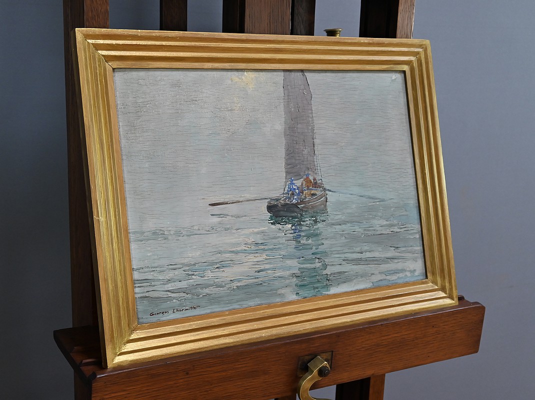 La brume est omniprésente, effaçant l’horizon, fondant le ciel et la mer dans une même étendue vaporeuse. Elle adoucit les contours, absorbe les sons, et donne à la scène une atmosphère de rêve suspendu. Le reflet du bateau dans l’eau, à peine troublé par quelques ondulations, renforce cette impression de calme absolu. La palette choisie par Lhermitte est subtile : des gris perle, des bleus froids, des verts d’eau, qui se fondent les uns dans les autres avec une grande maîtrise. Rien ne heurte le regard ; tout invite à la contemplation. Le cadre doré qui entoure l’œuvre ajoute une touche de solennité, comme pour souligner la noblesse silencieuse de cette scène. Ce tableau n’est pas seulement une marine : c’est une méditation visuelle sur le temps, la solitude, et la beauté fragile des instants suspendus. Il évoque le voyage intérieur autant que le déplacement physique, et nous laisse, nous aussi, un peu perdus… dans la brume.