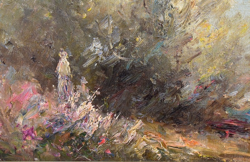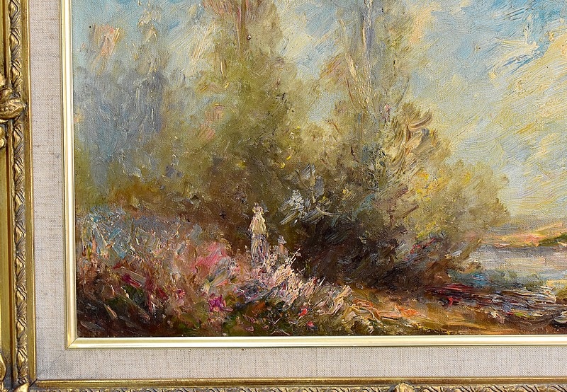 Il représente une femme se promenant dans une nature printanière ou estivale, très colorée et baignée de lumière, bordant un point d’eau.