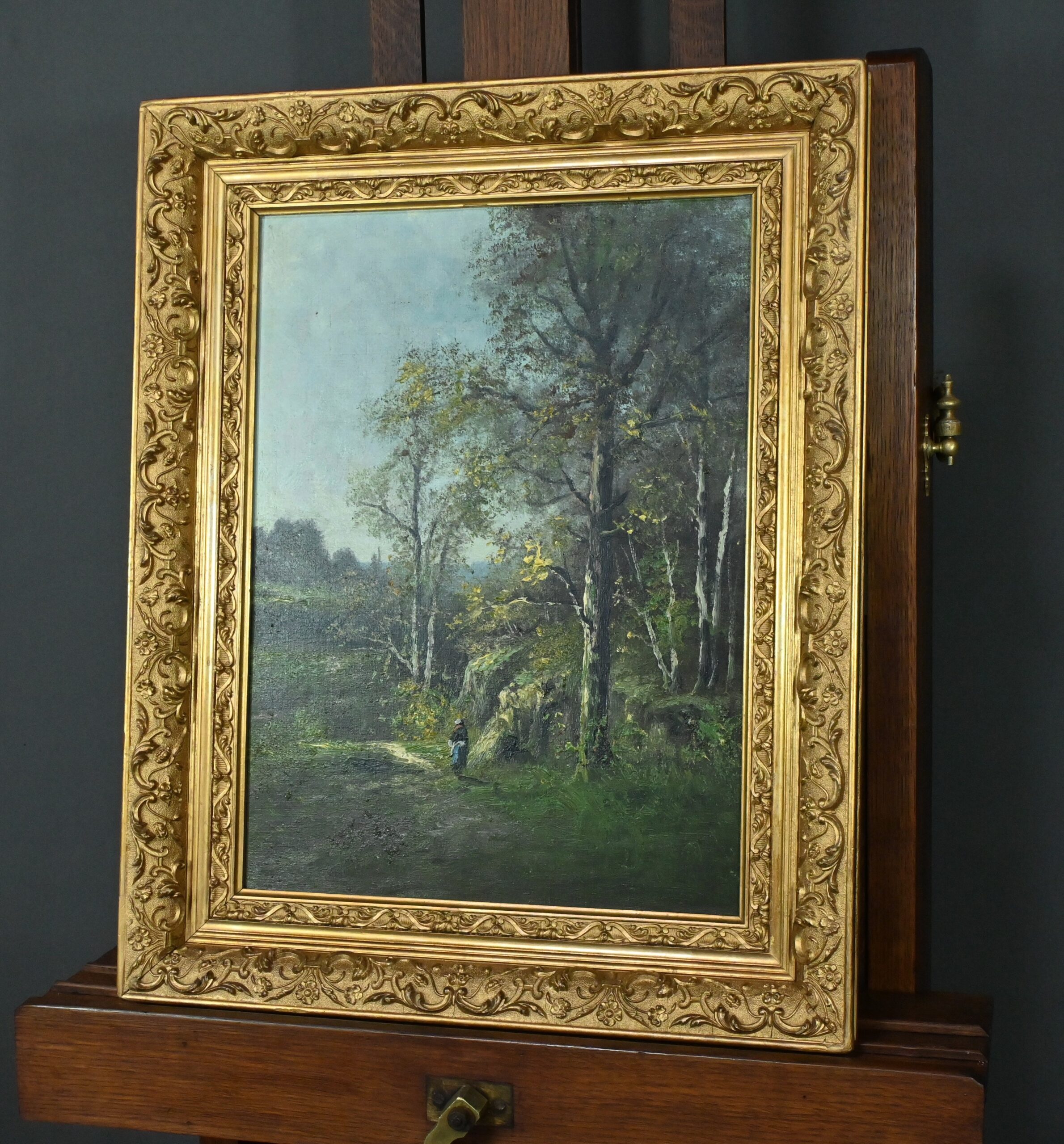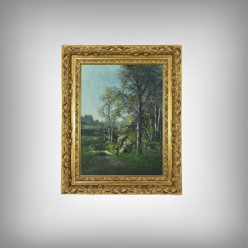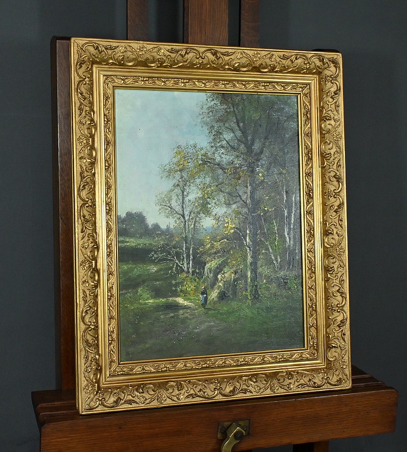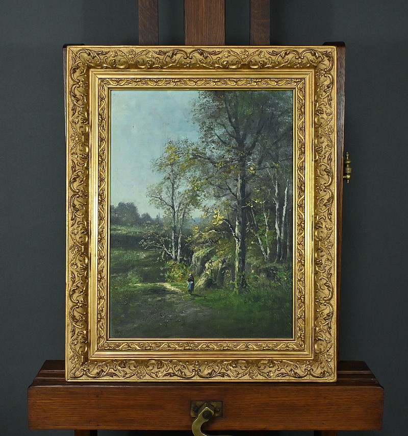 Le ciel, légèrement nuageux, ajoute une touche de réalisme sans assombrir la scène. Tout dans cette composition invite à la tranquillité : la lumière, les couleurs naturelles, la posture du promeneur. Le cadre doré, richement orné et mouluré, souligne le soin apporté cette œuvre.