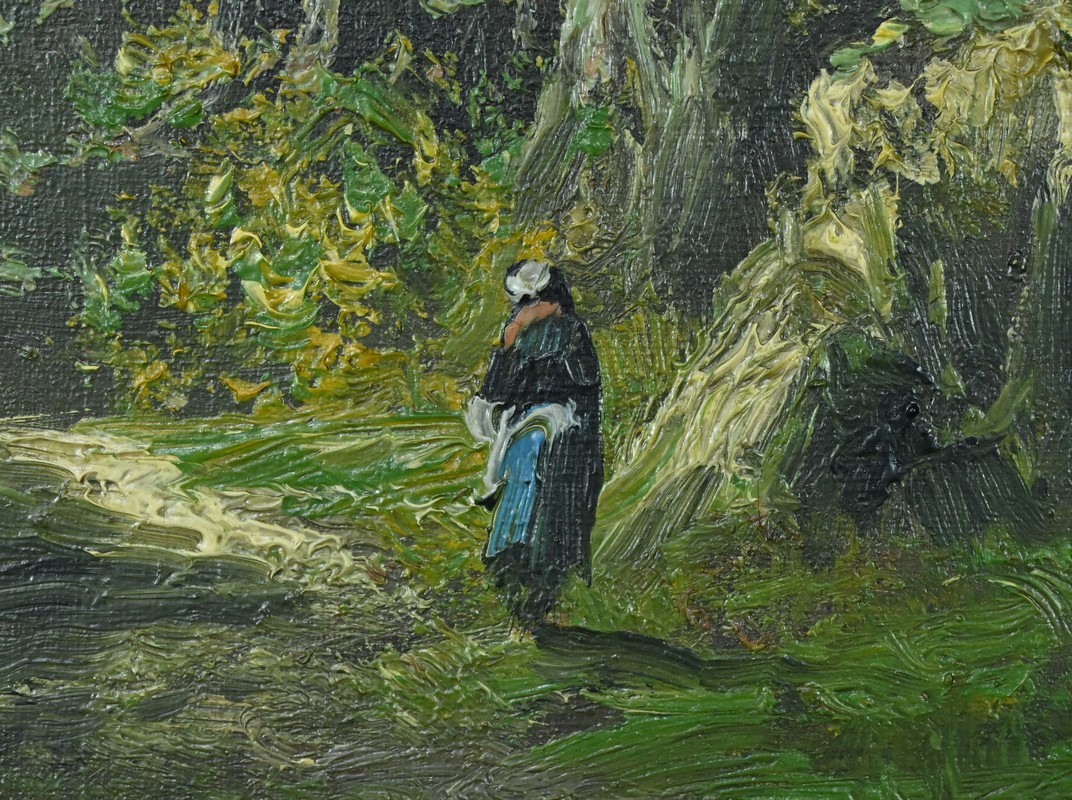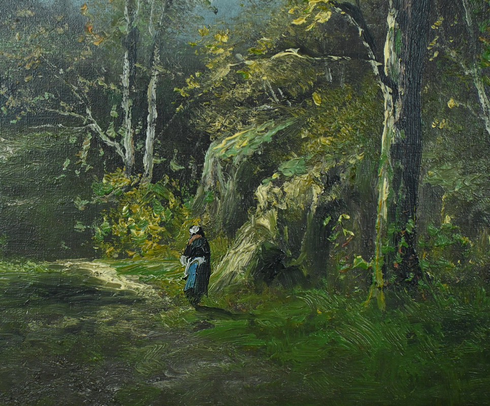 Au centre du tableau, un personnage solitaire marche sur le sentier. La femme vêtu d’habits traditionnels avance, entourée par la beauté silencieuse de la nature qui l’entoure. Les arbres, aux troncs élancés et aux feuillages nuancés, accentuent l’effet de profondeur et de sérénité qui se dégage de ce tableau.