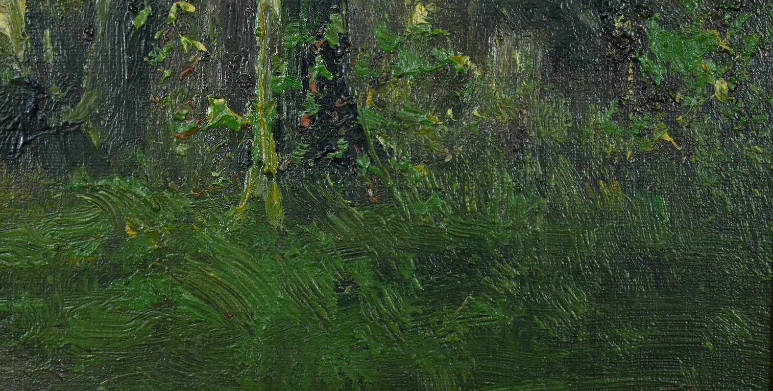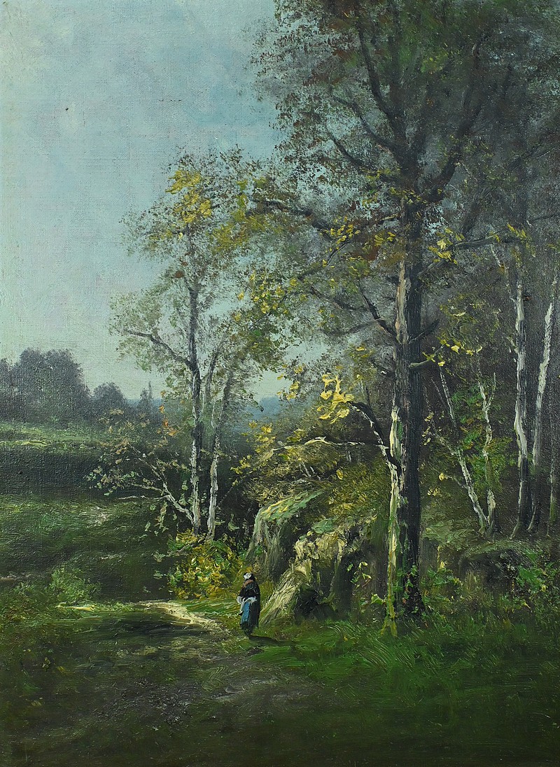 Cette huile sur toile représente un chemin forestier bordé d’arbres, baigné d’une lumière douce qui filtre à travers les feuillages. La scène semble se dérouler en fin d’après-midi, lorsque le soleil rase les cimes et adoucit les couleurs.