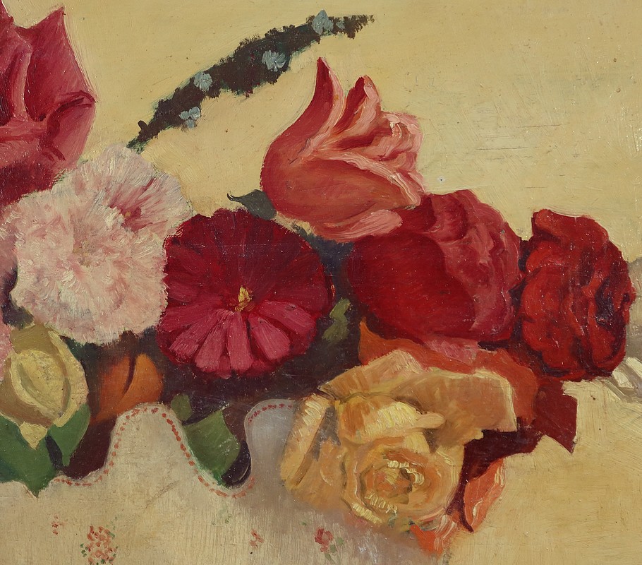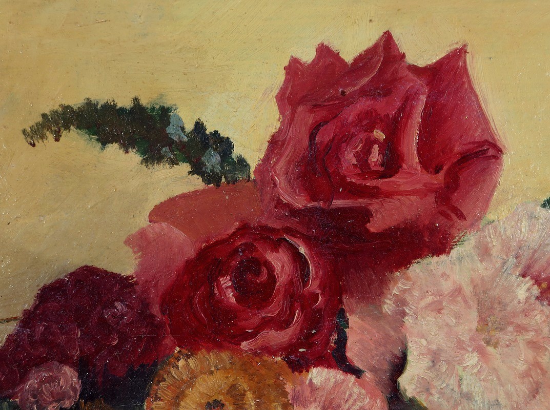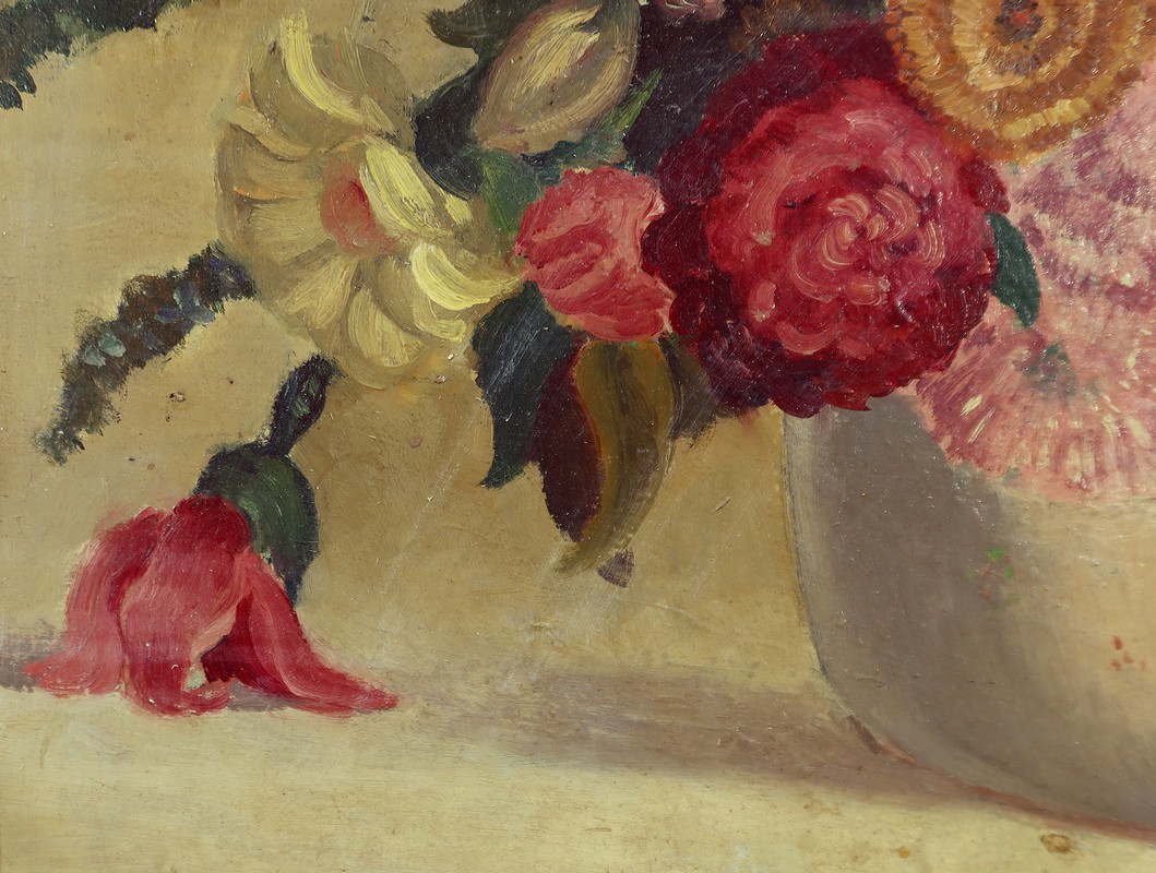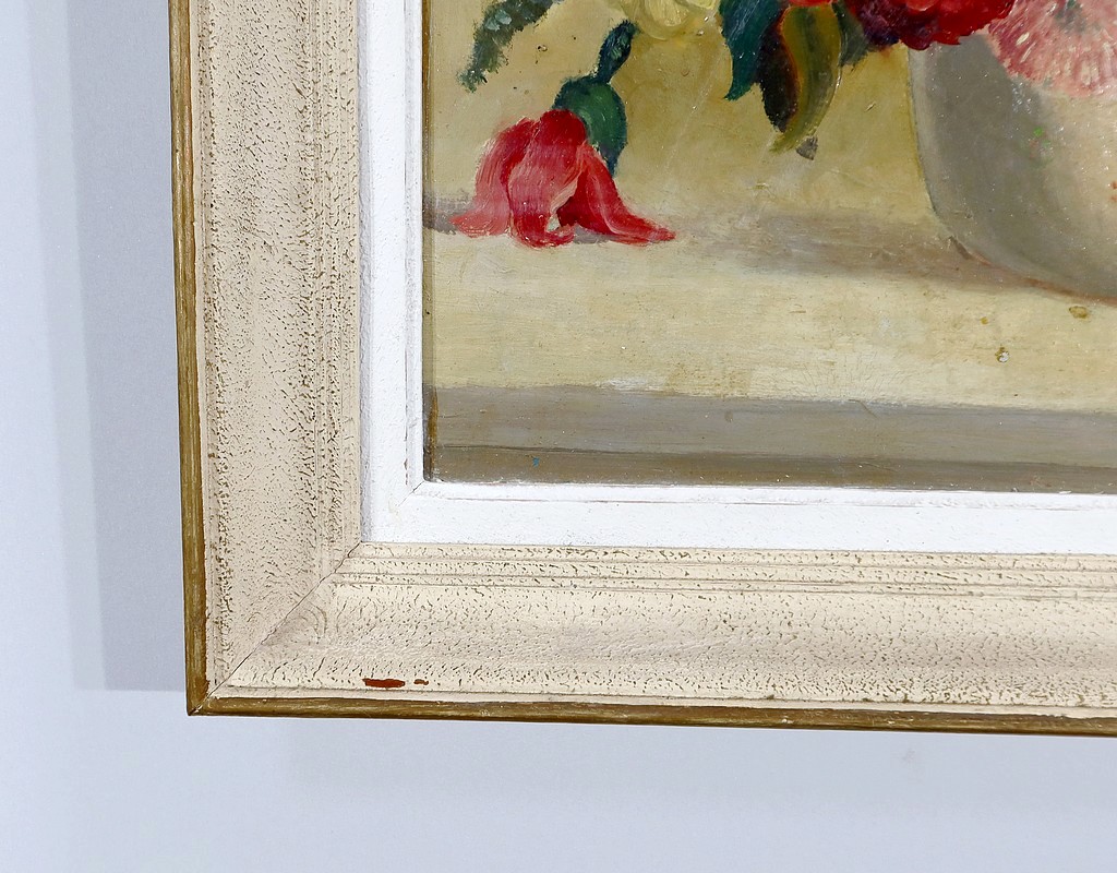 Grande Huile sur Panneau représentant une nature morte figurant un bouquet de fleurs dans un pot.