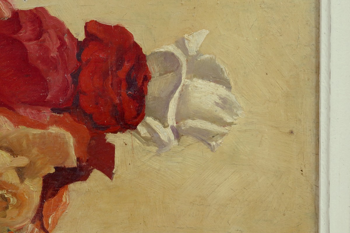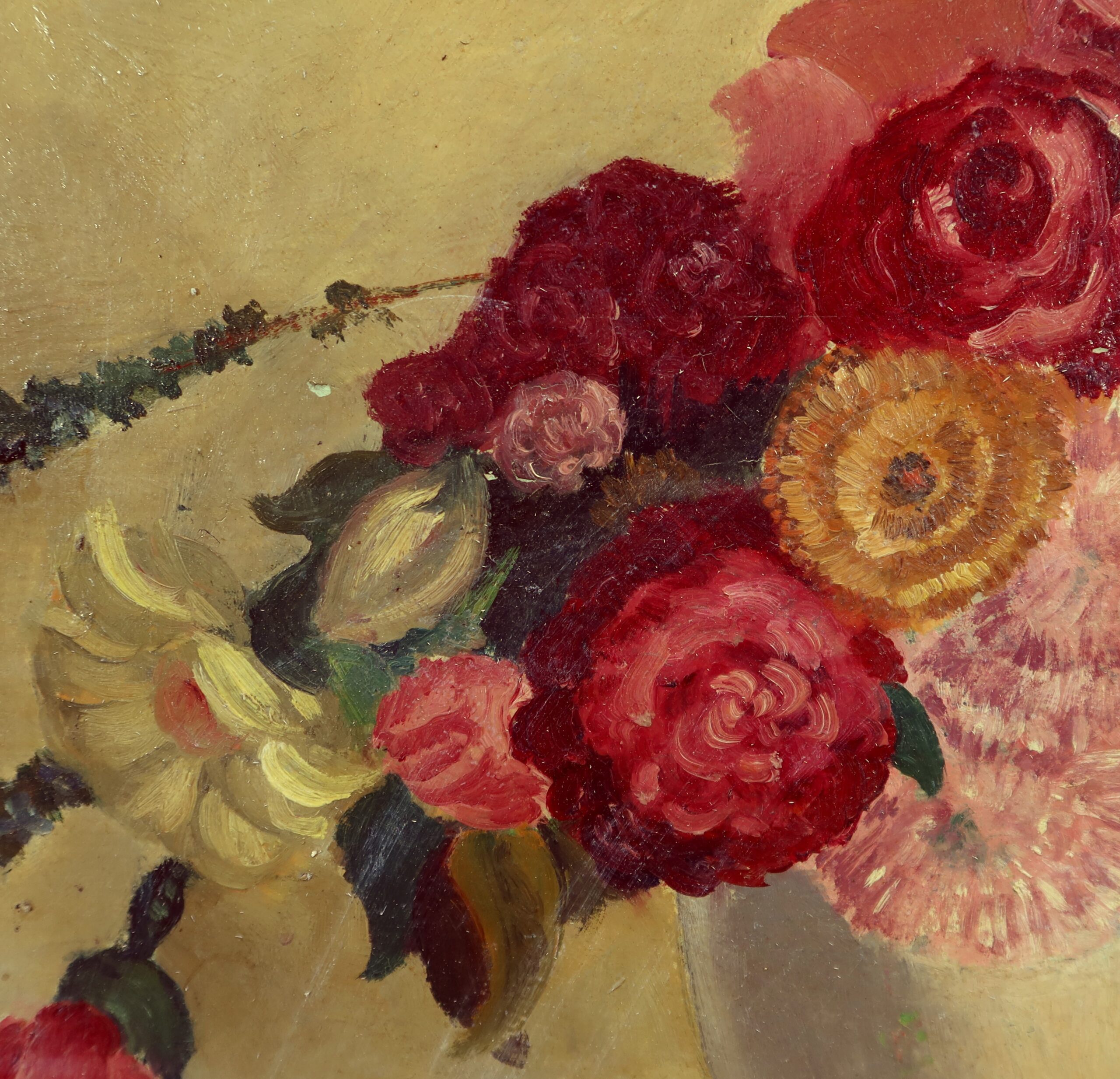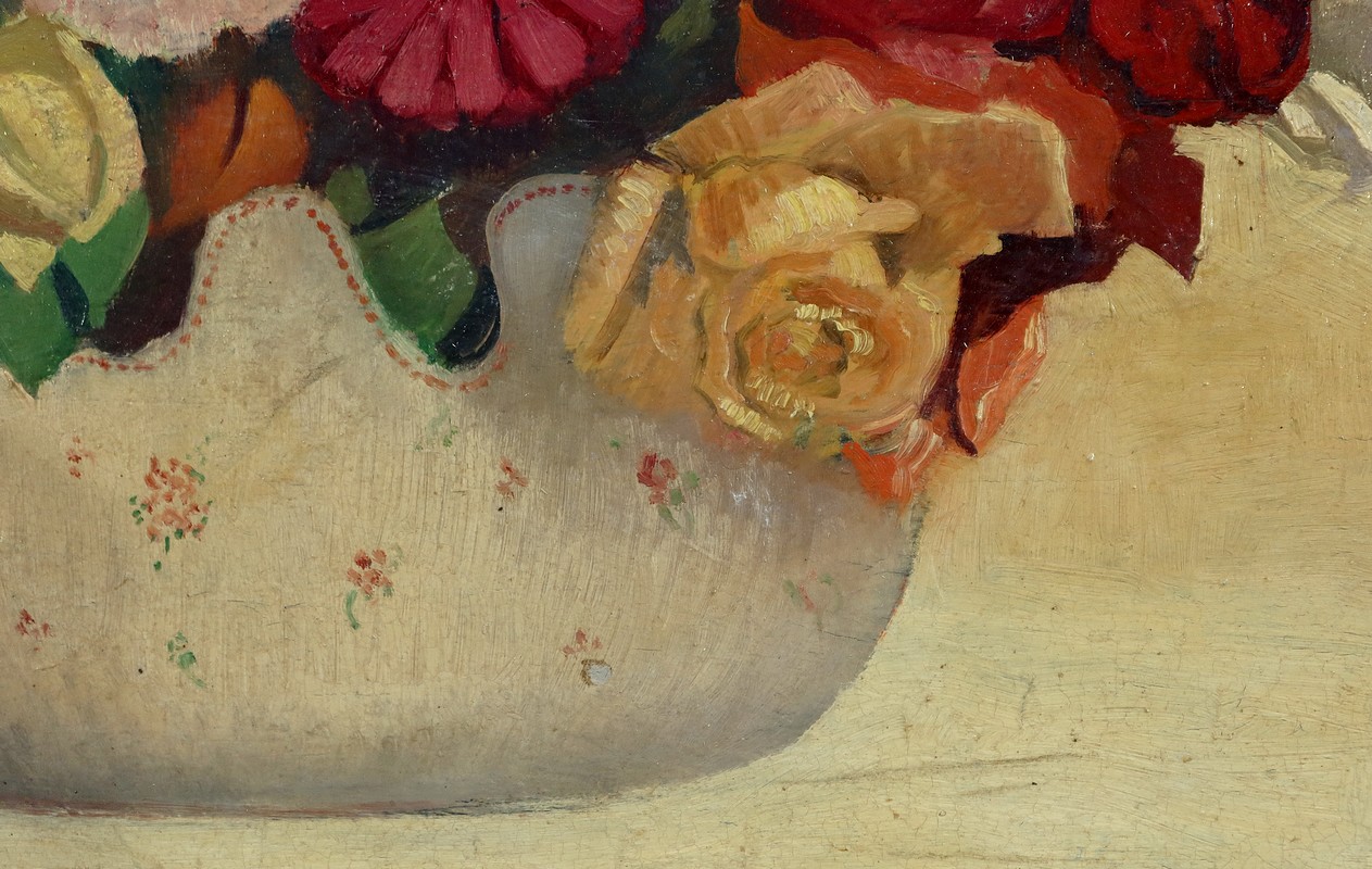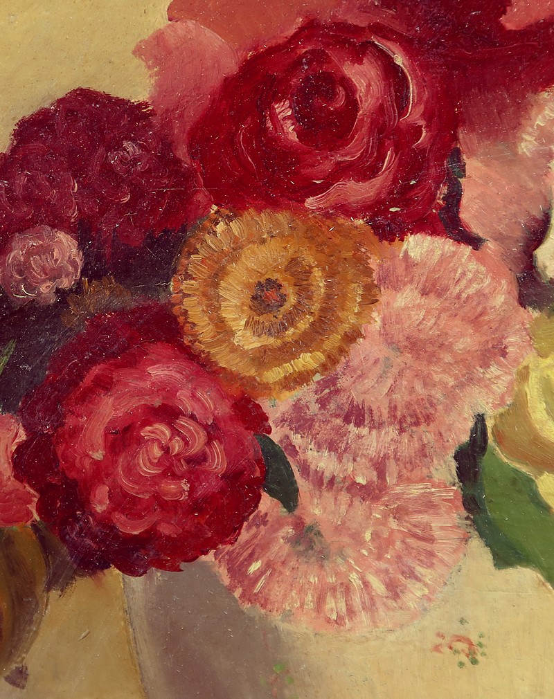 Grande Huile sur Panneau représentant une nature morte figurant un bouquet de fleurs dans un pot.