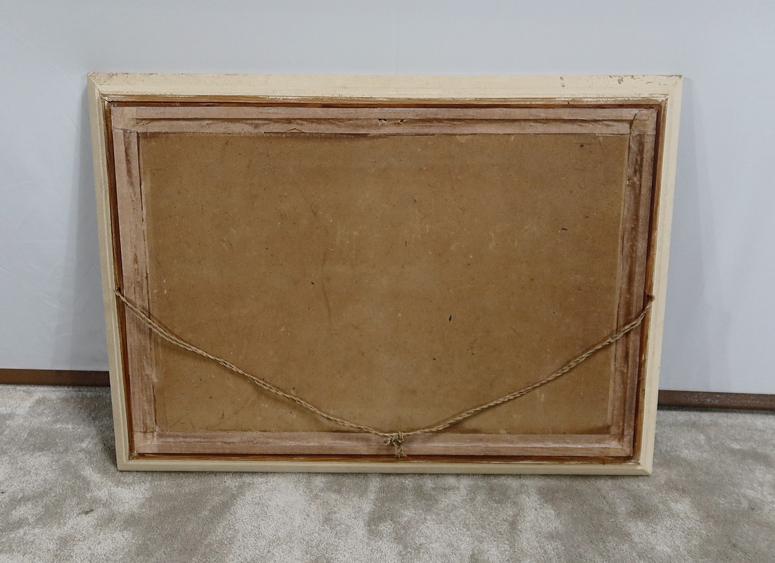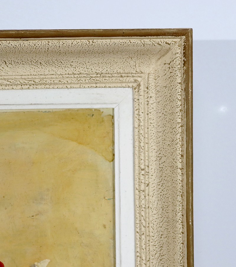 Cette grande huile sur panneau est entourée sobrement d’un cadre en bois peint mouluré.