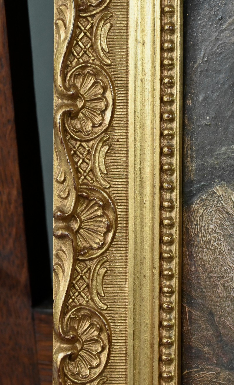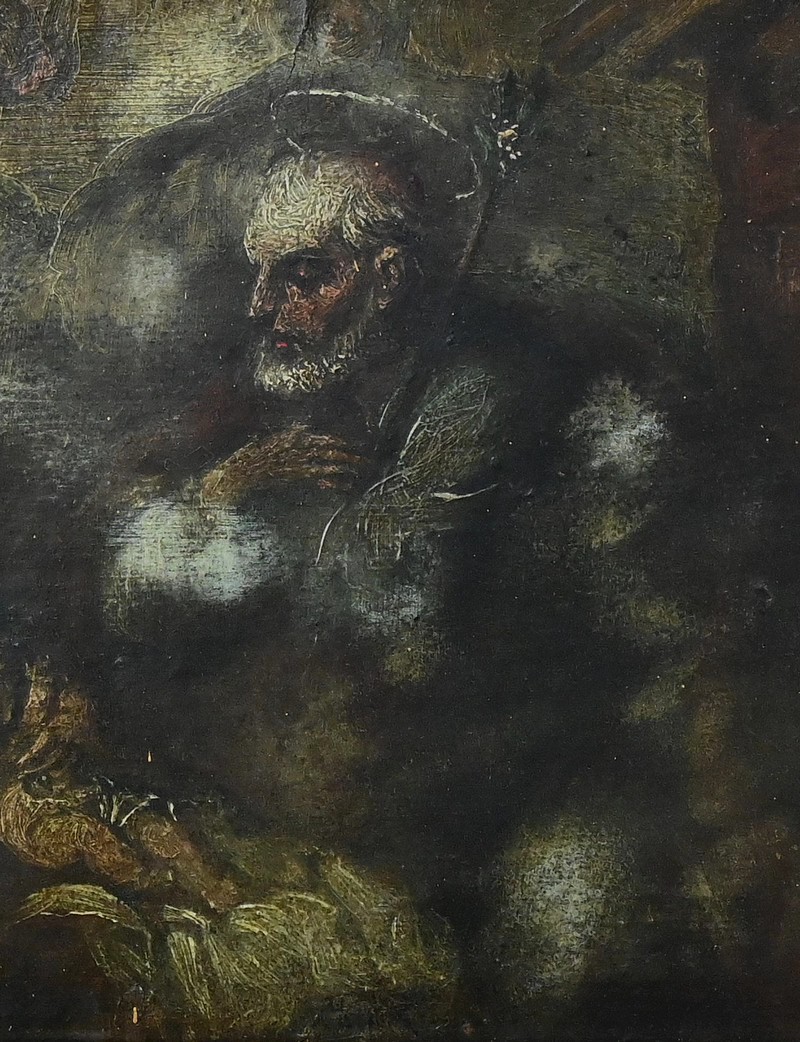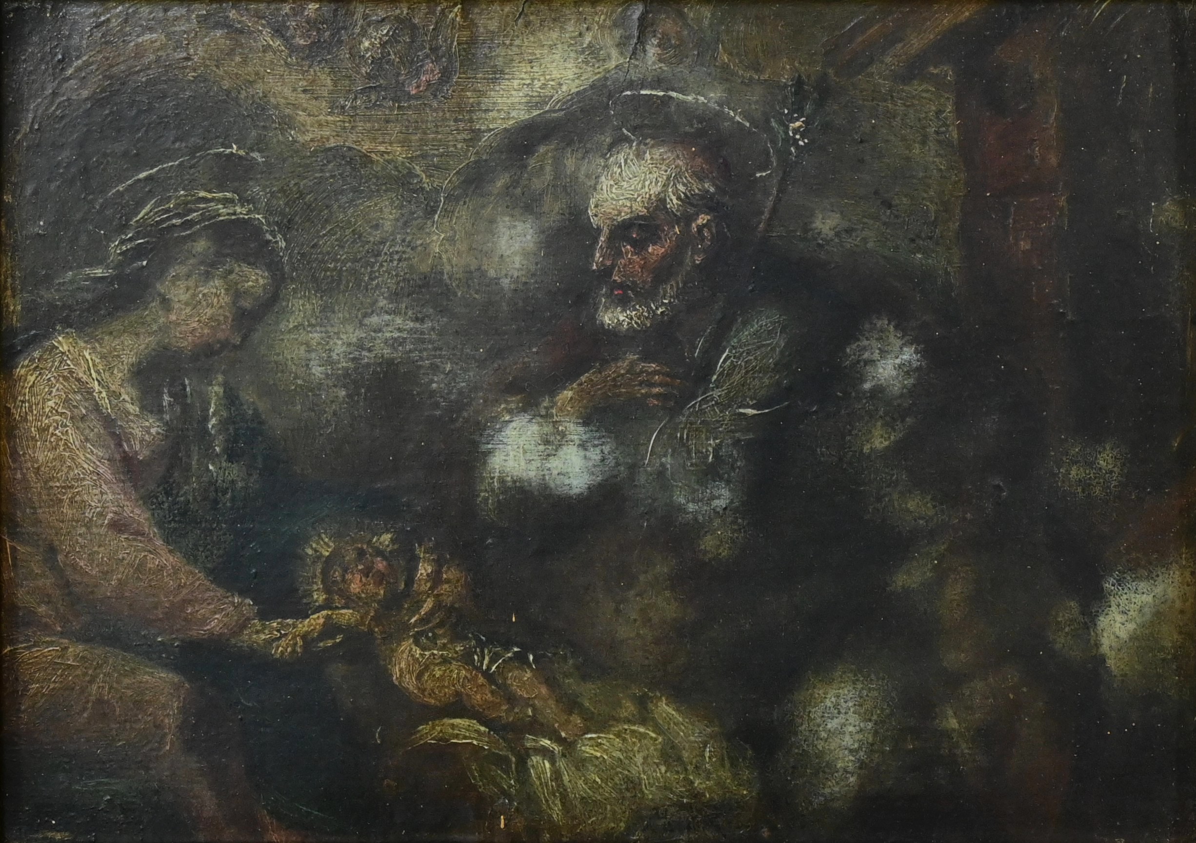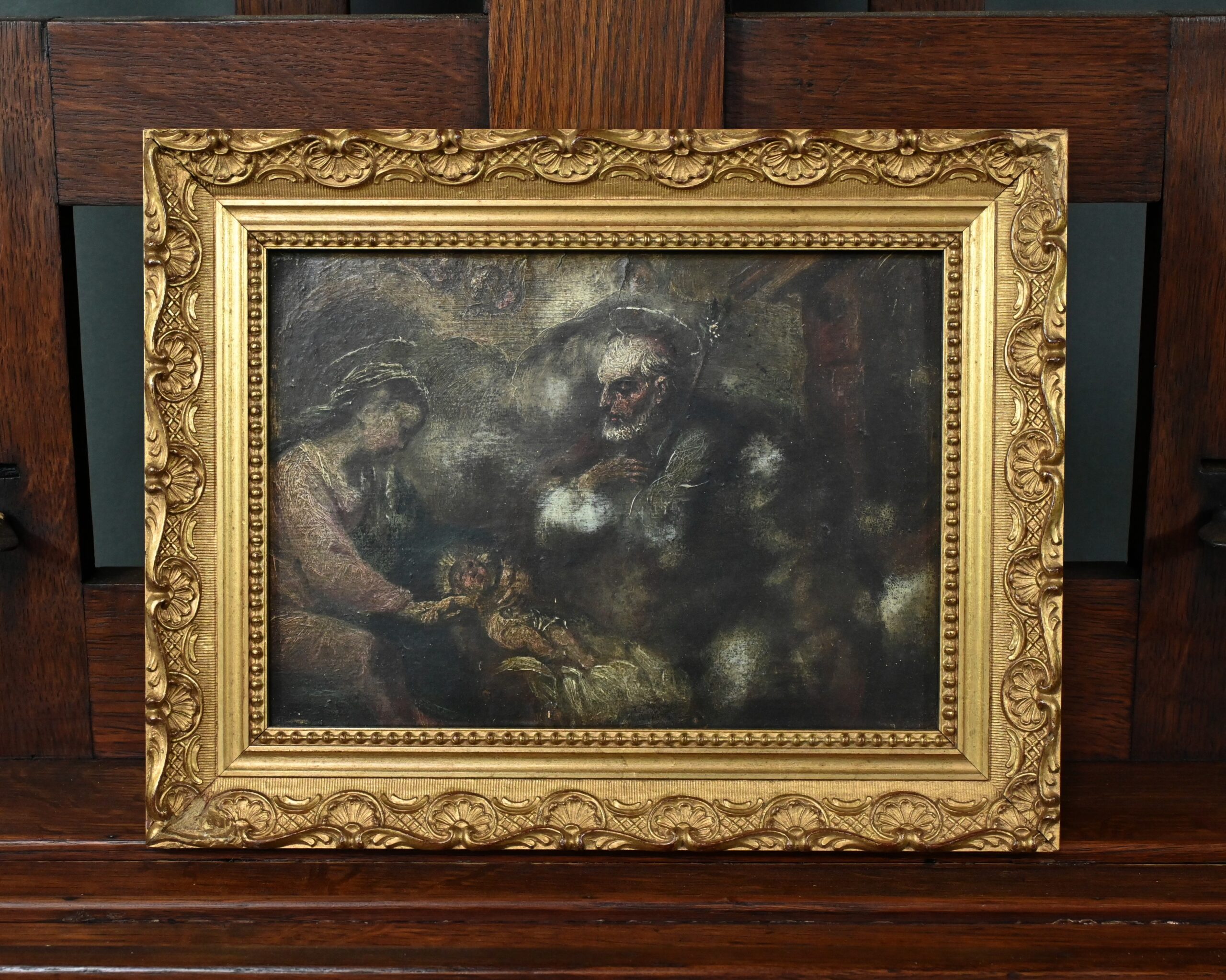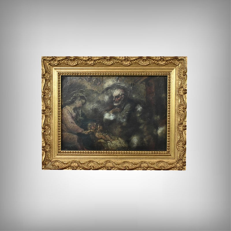 Marie, assise à gauche, est drapée d’une tunique rose, sa main droite délicatement posée sur son enfant qu’elle regarde avec tendresse. Une auréole légère nimbe sa tête, soulignant sa sérénité maternelle. À droite, Joseph se tient assis tenant un bâton, le regard protecteur, sa barbe fine et ses vêtements aux tons profond évoquant sa force tranquille. Il est également auréolé. La palette de couleurs mêle terres d’ombre naturelles, bruns et verts profonds contrastant avec les tons plus clairs composant les personnages de la scène. Ce clair obscur invite à la méditation. L’œuvre est mise en valeur par un cadre doré mouluré avec guirlande de perles, coquilles et rinceaux en relief.