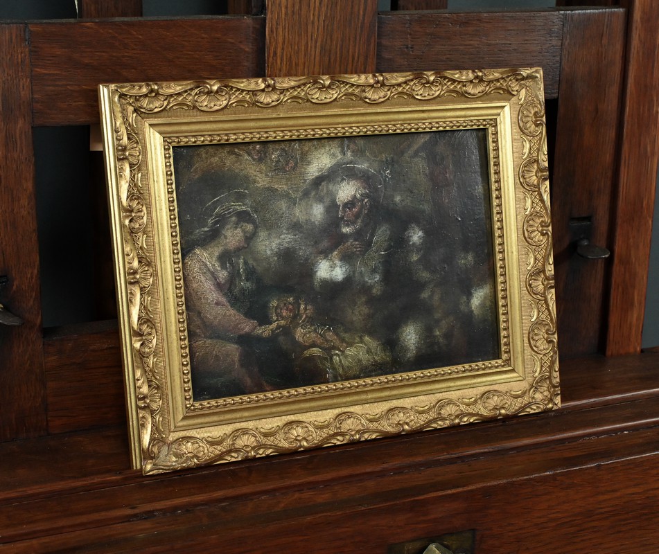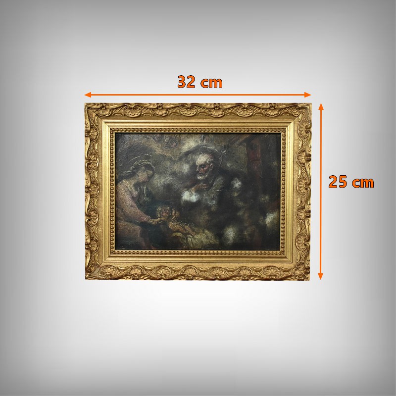 Petite huile sur panneau figurant la scène de la nativité. Au centre, l’Enfant Jésus repose paisiblement sur un lit de paille, offrant déjà un regard plein de douceur et d’innocence.