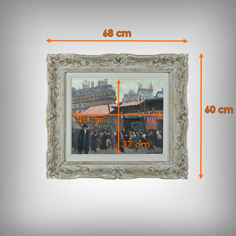 Le cadre ornementé, riche en motifs sculptés et patinés, encadre avec élégance cette œuvre pleine de vie, entre réalisme poétique et regard attendri sur une scène de rue intemporelle.