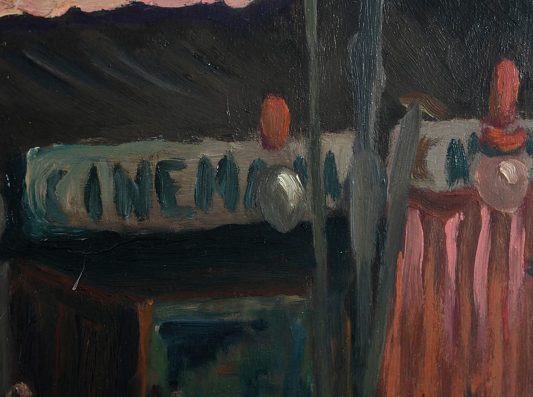 Cette huile sur panneau signée C. Subileau dépeint une scène urbaine vivante et empreinte de nostalgie, évoquant l’atmosphère d’un début de XXe siècle en effervescence. Dans une rue bordée d’enseignes, dont l’une proclame « Cinéma», suggérant l’essor du spectacle populaire, se pressent des passants habillés de manteaux et de chapeaux, témoins d’une époque révolue.