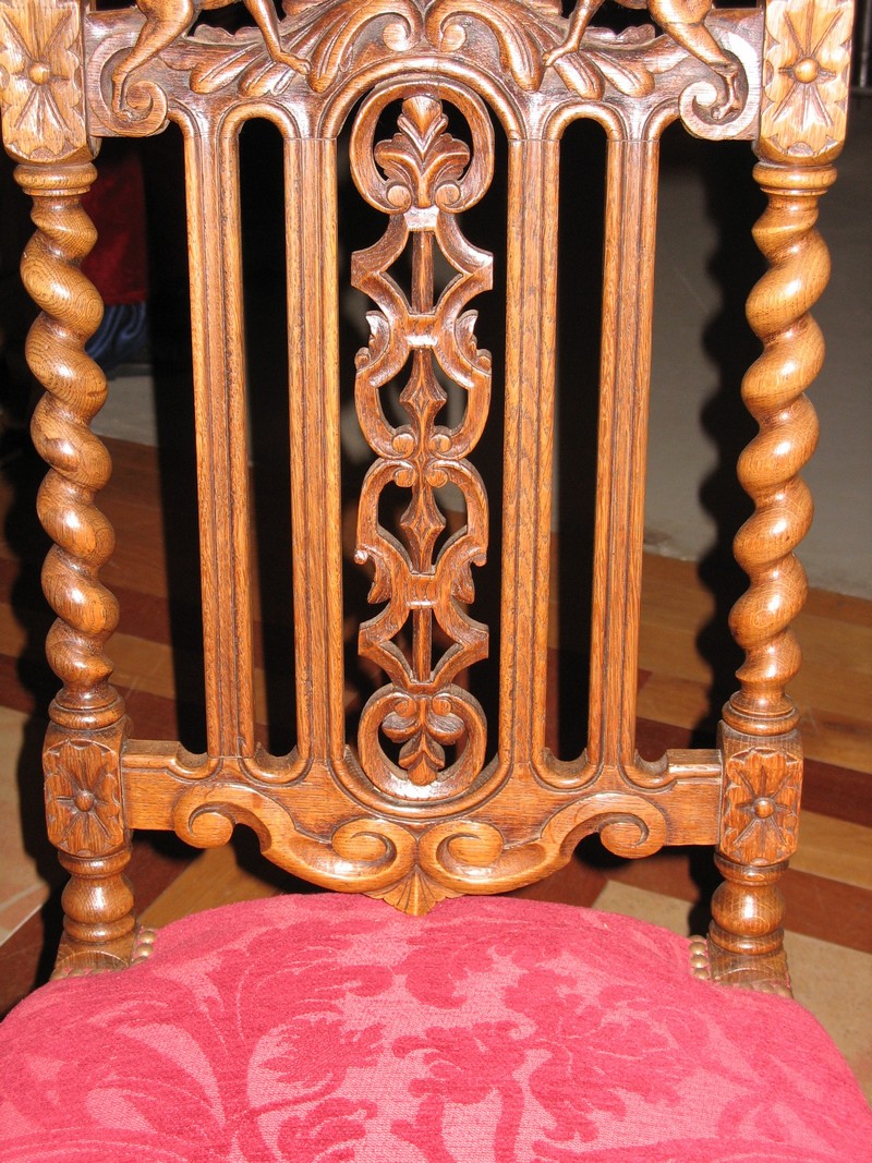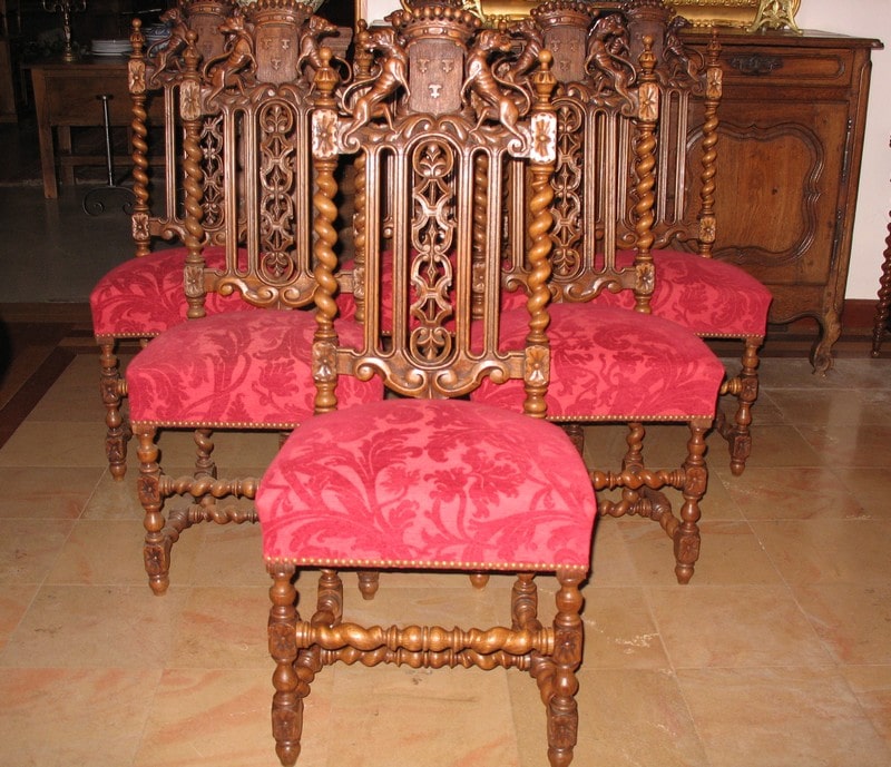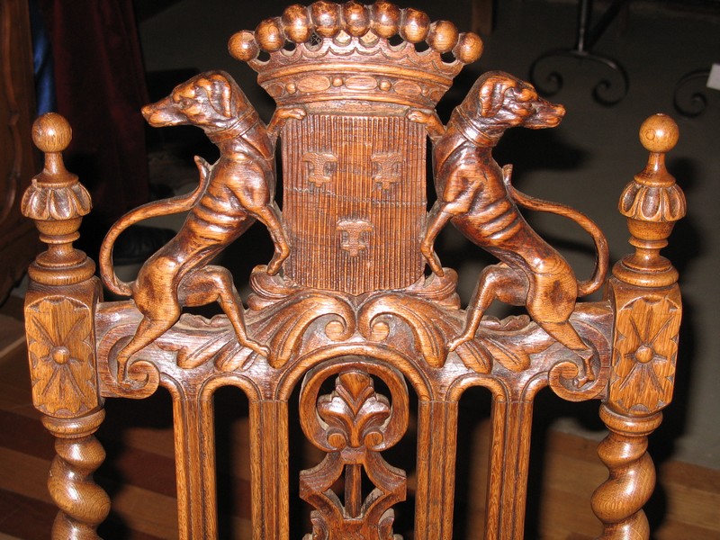 Suite de 6 chaises de propriété de style Louis XIII en chêne. Décor de lévriers et armoiries.