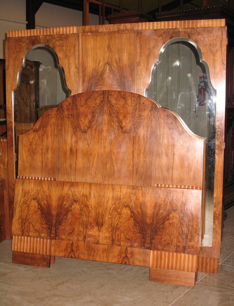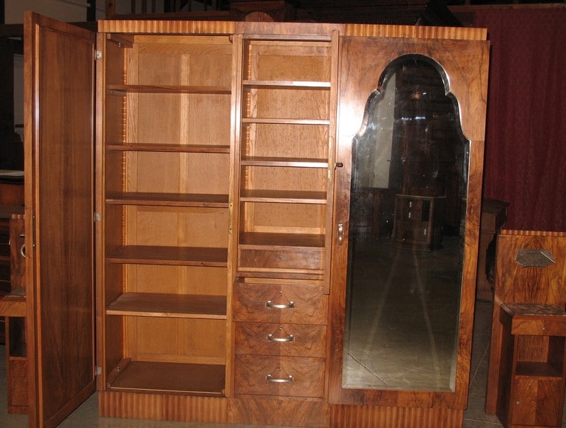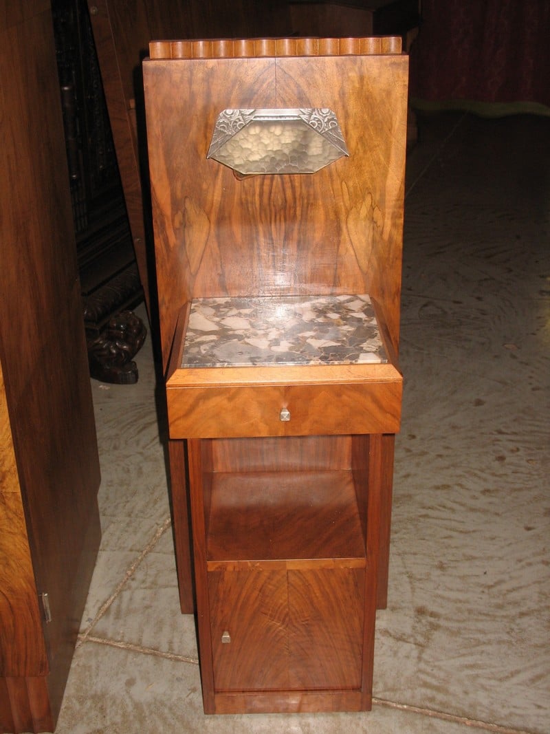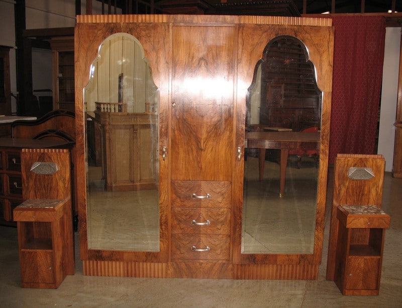 Chambre Art Déco en très belle ronce de noyer composée d’une armoire, d’un lit et de 2 chevets. L’armoire ouvre à 3 portes dont 2 grandes à glace et une rangée de 3 tiroirs. Le lit mesure 150cm de large. Les chevets ont un dessus de marbre.