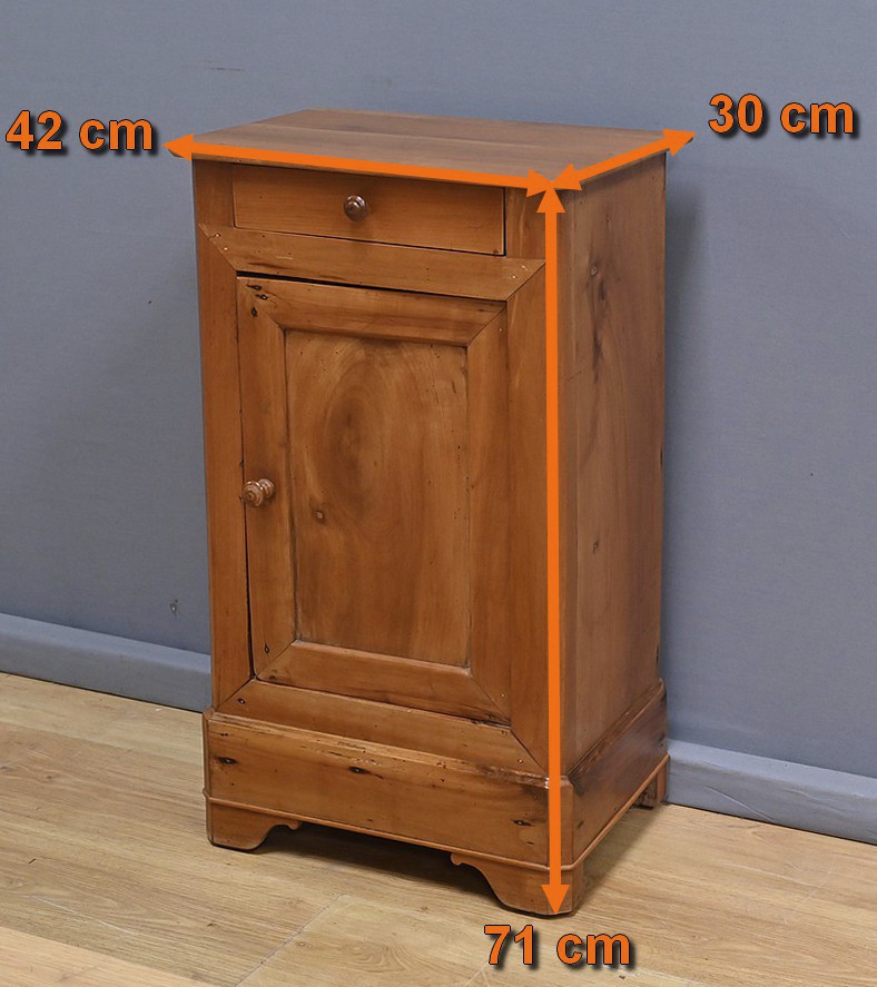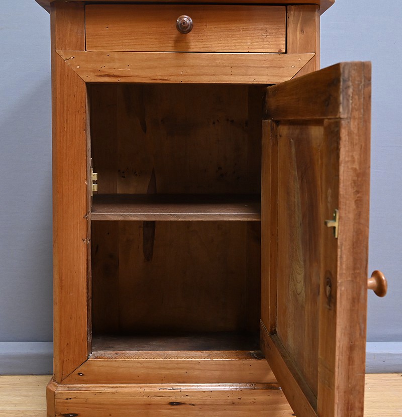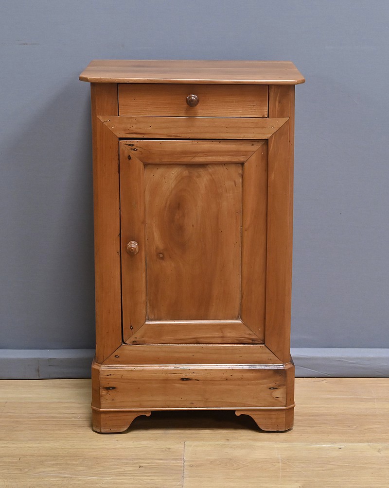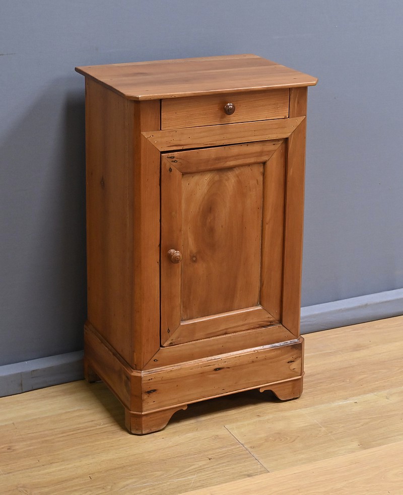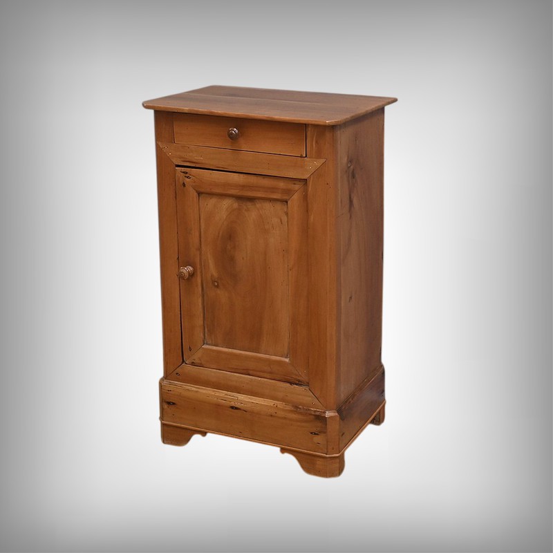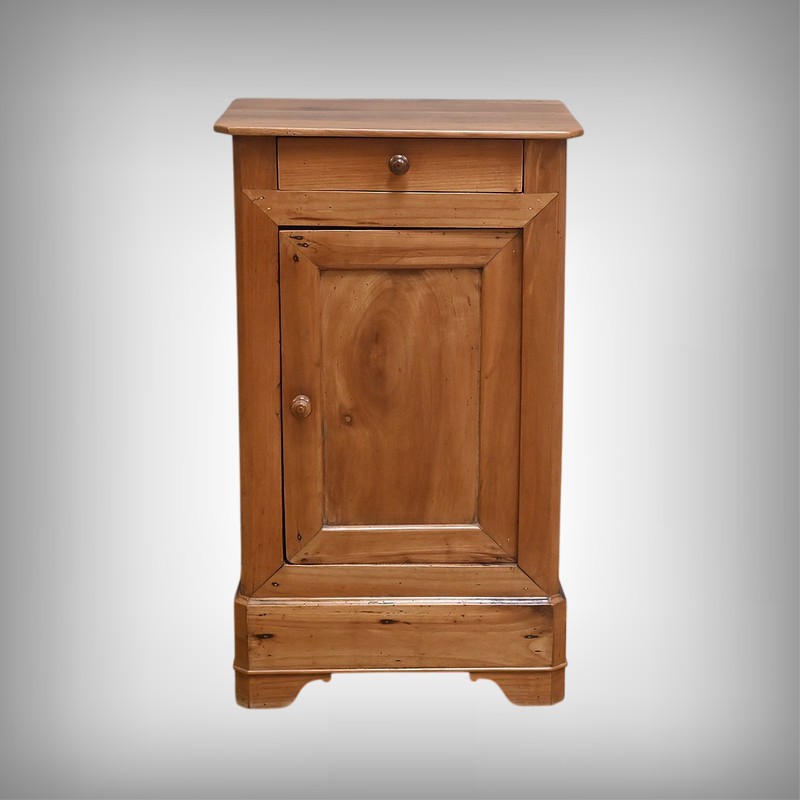 Ce chevet en merisier massif, datant du début du XXe siècle, séduit par son authenticité. Il s’ouvre par un tiroir en ceinture doté d’un bouton en bois tourné. Sous ce dernier, une porte garnie d’un panneau entouré d’un cadre à coupe d’onglet est munie d’un bouton de tirage en bois tourné assorti qui complète harmonieusement l’ensemble. Son intérieur intègre une étagère pour un rangement optimisé. Les montants à pans coupés discrets, renforcent son allure structurée, tandis que la plinthe moulurée apporte une finition épurée. L’ensemble repose sur des pieds dit console, lui conférant stabilité et élégance.