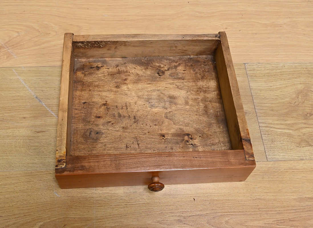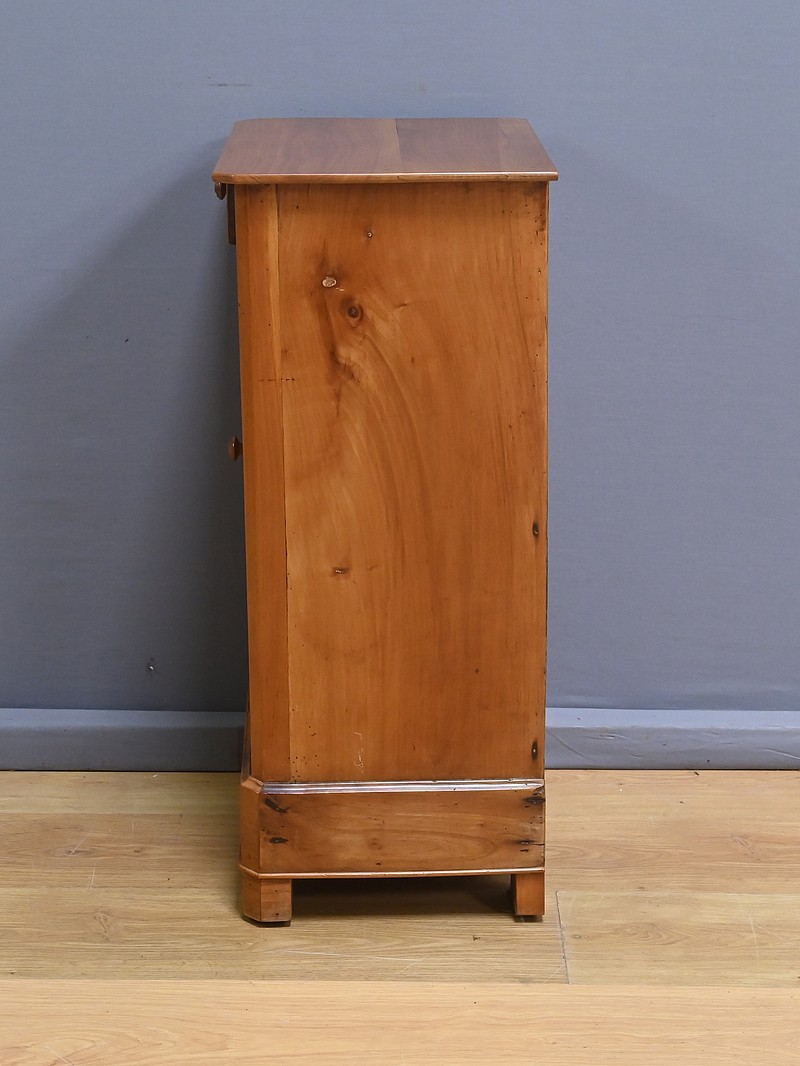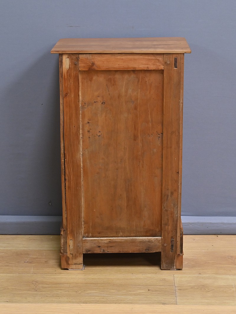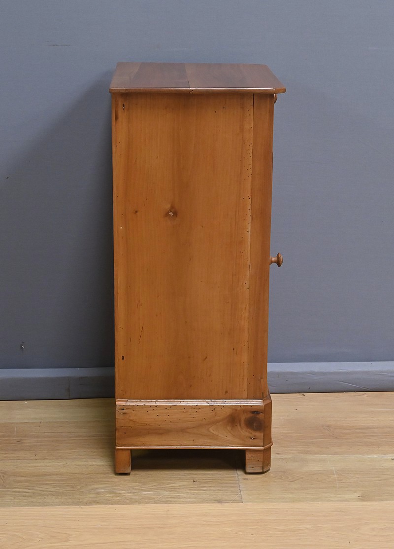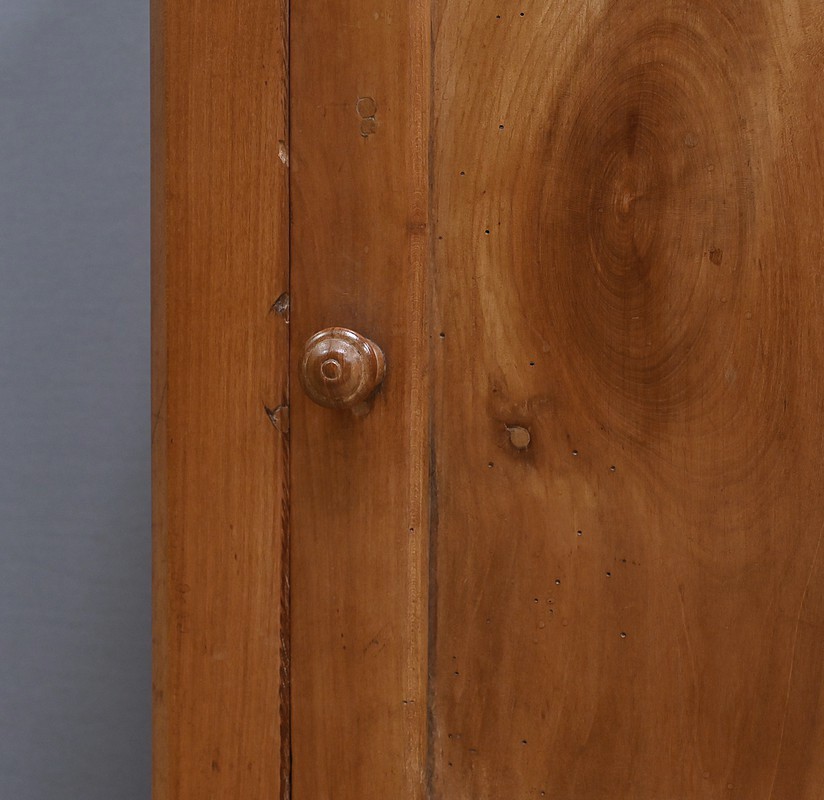 Ce chevet en merisier massif, datant du début du XXe siècle, séduit par son authenticité. Il s’ouvre par un tiroir en ceinture doté d’un bouton en bois tourné. Sous ce dernier, une porte garnie d’un panneau entouré d’un cadre à coupe d’onglet est munie d’un bouton de tirage en bois tourné assorti qui complète harmonieusement l’ensemble. Son intérieur intègre une étagère pour un rangement optimisé. Les montants à pans coupés discrets, renforcent son allure structurée, tandis que la plinthe moulurée apporte une finition épurée. L’ensemble repose sur des pieds dit console, lui conférant stabilité et élégance.