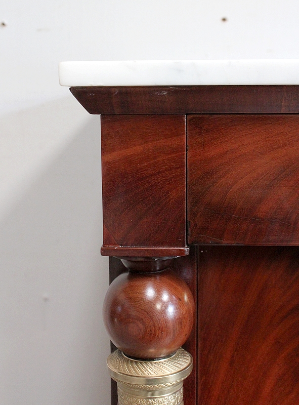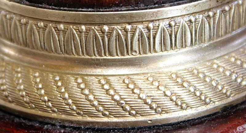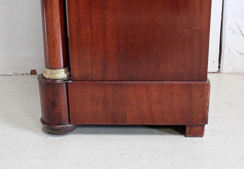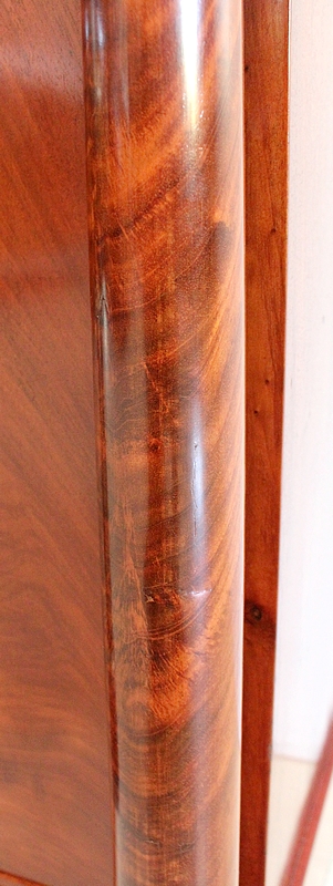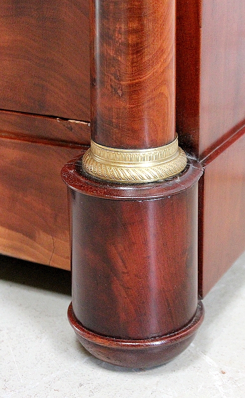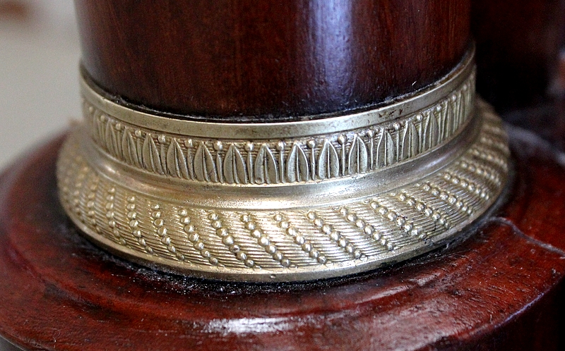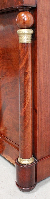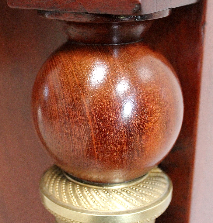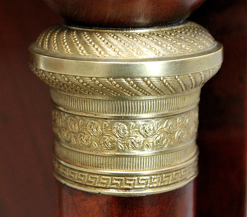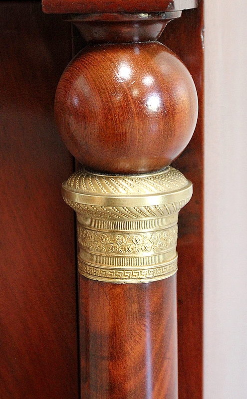 La Façade de ce Mobilier est flanquée de chaque côté, de deux Colonnes Cylindriques en Ronce d’Acajou. Sommées d’une belle Boule en Acajou massif, elles s’embellissent d’élément en Bronze finement ciselé, dont celui en partie haute est bagué d’une Collerette plus large. À l’avant, dans le prolongement des Colonnes, les montants reposent sur deux petits pieds Écrasés, presque Cylindriques tandis qu’à « l’arrière », ils sont droits.