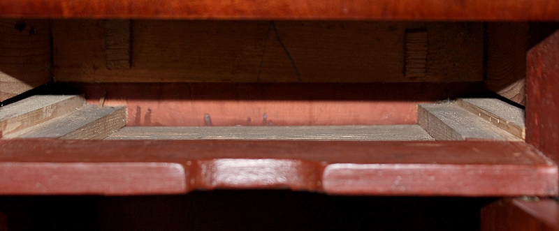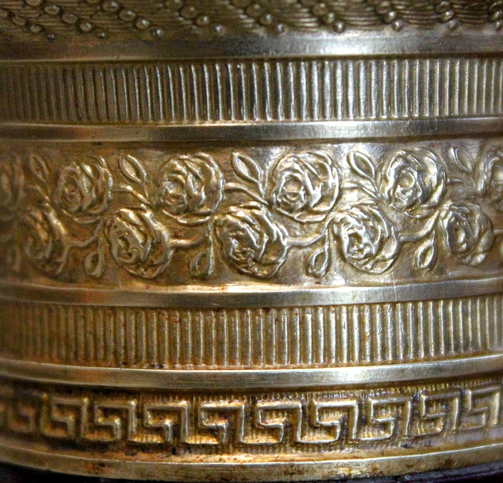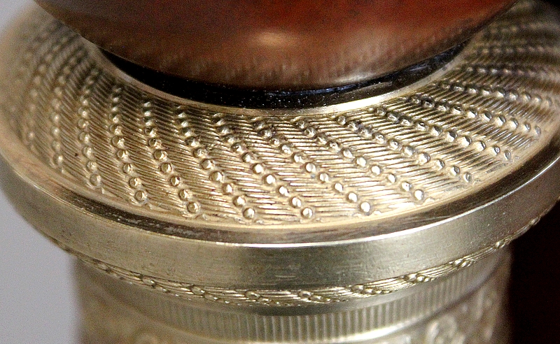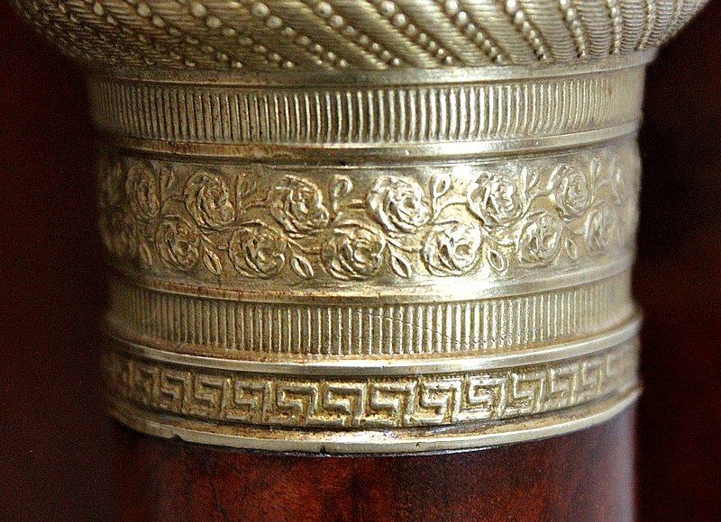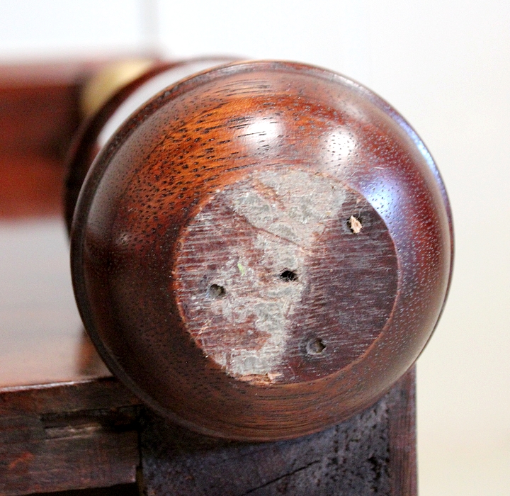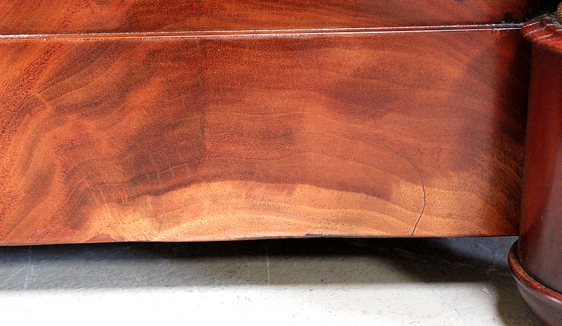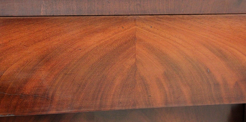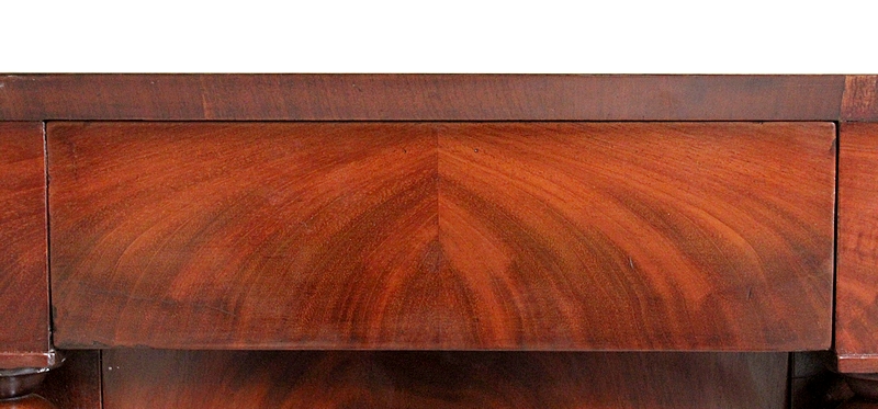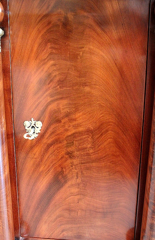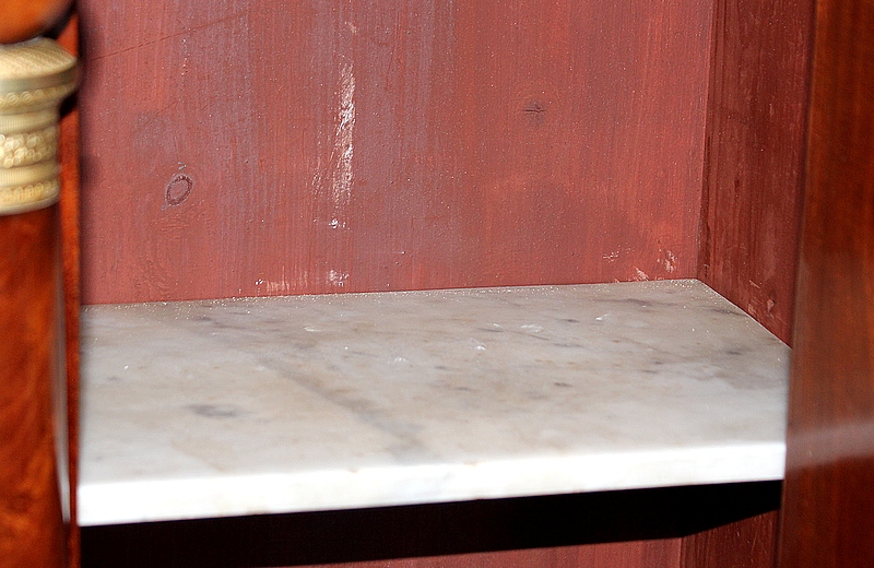 La Façade de ce Mobilier est flanquée de chaque côté, de deux Colonnes Cylindriques en Ronce d’Acajou. Sommées d’une belle Boule en Acajou massif, elles s’embellissent d’élément en Bronze finement ciselé, dont celui en partie haute est bagué d’une Collerette plus large. À l’avant, dans le prolongement des Colonnes, les montants reposent sur deux petits pieds Écrasés, presque Cylindriques tandis qu’à « l’arrière », ils sont droits.