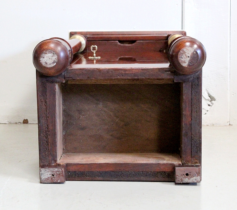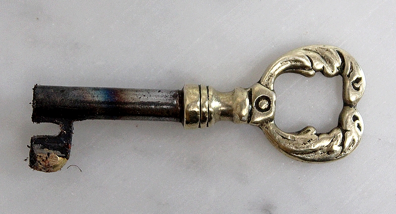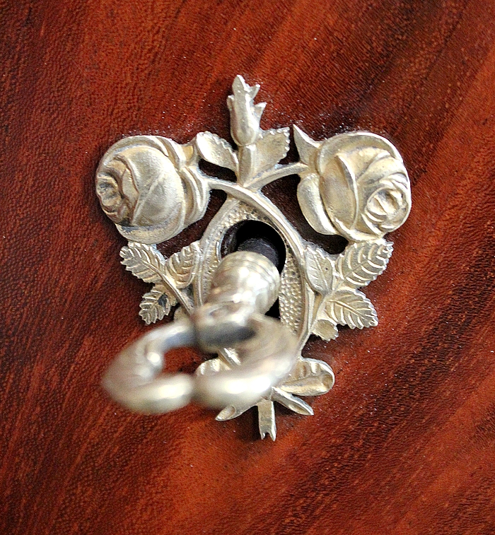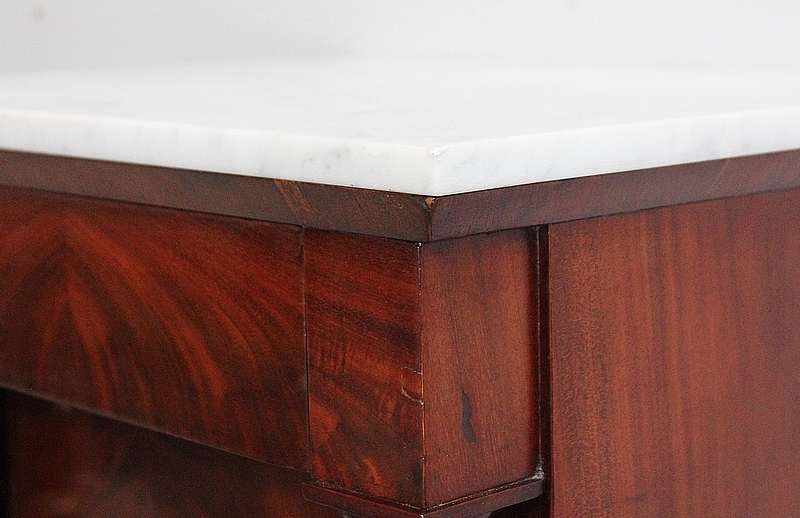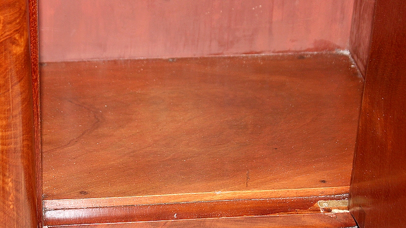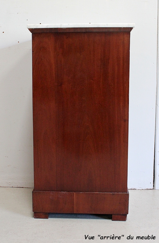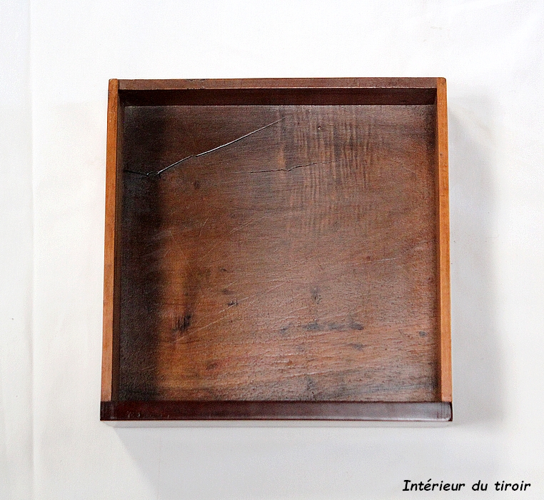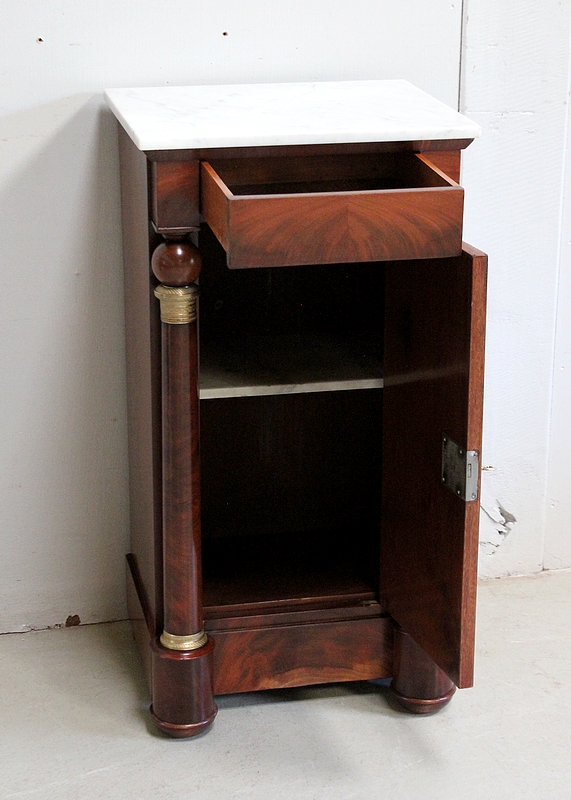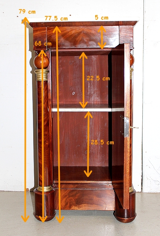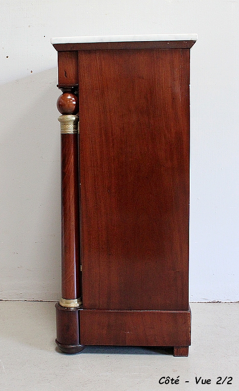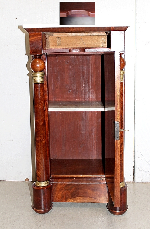 Ce Petit meuble possède deux ouvrants en Ronce d’Acajou. En ceinture, un Tiroir, doté d’une encoche en dessous pour faciliter son ouverture. Plus bas, une petite Porte donnant accès à un intérieur garni d’une Tablette fixe, du même Marbre. Ce battant est équipé d’une Serrure en état de Fonctionnement accompagnée de sa Clé, le tout est d’Origine.