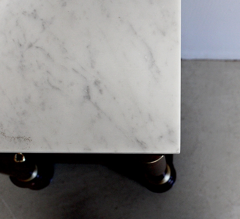 Un Chic Marbre de Carrare, Blanc Veiné de Gris, agrémente son Dessus.