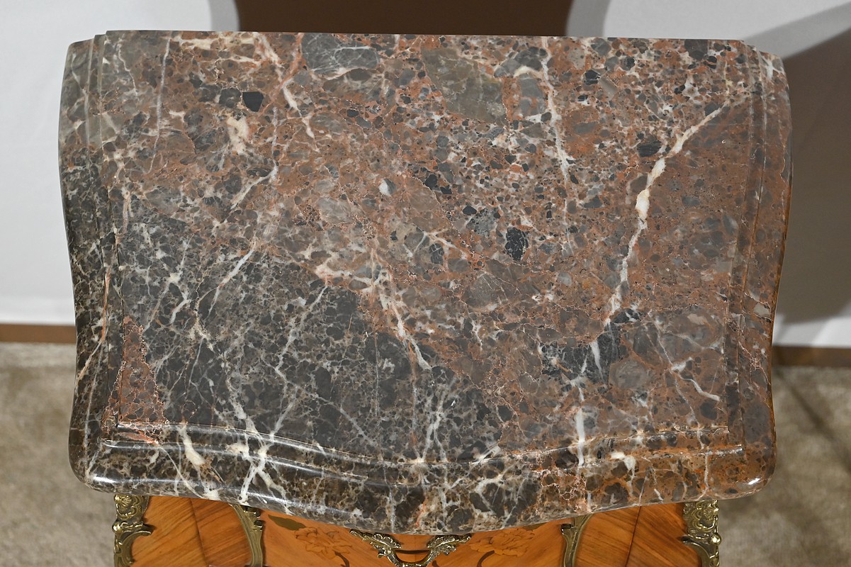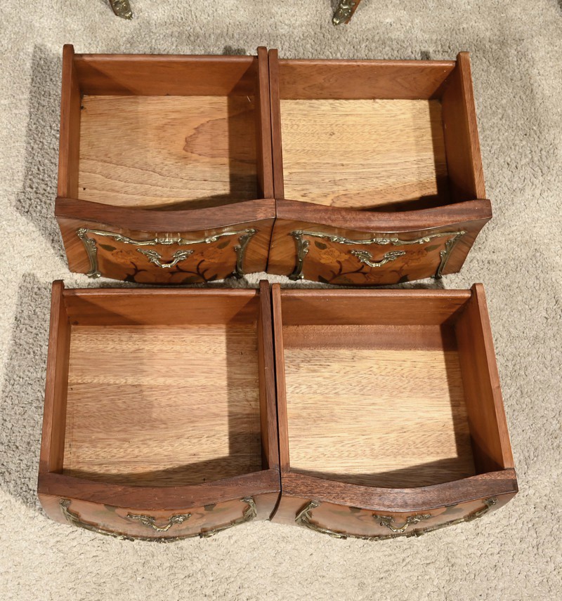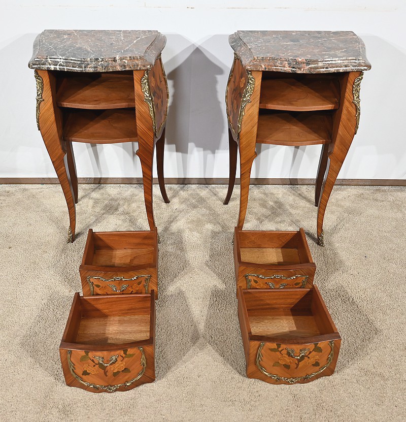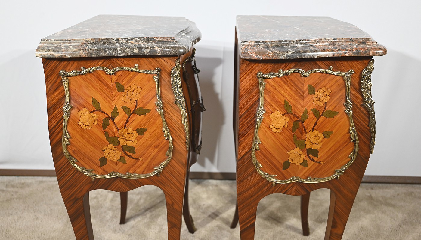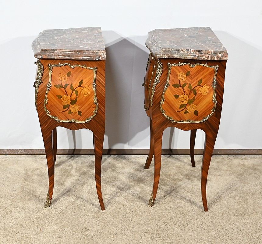 Belle paire de chevets galbés en façade ainsi que sur les côtés, sommés d’un marbre brèche des Pyrénées d’origine avec bec de corbin et disposant de deux tiroirs. La façade de ceux-ci est en placage de bois de rose disposé en diagonal et agrémenté d’incrustations de marqueteries de bois clair et teinté formant un charmant bouquet de fleurs. Cette marqueterie est entourée de garnitures en bronze figurant des branchages et des fleurs. Une poignée en bronze finement ciselée permet l’ouverture de chaque tiroir.