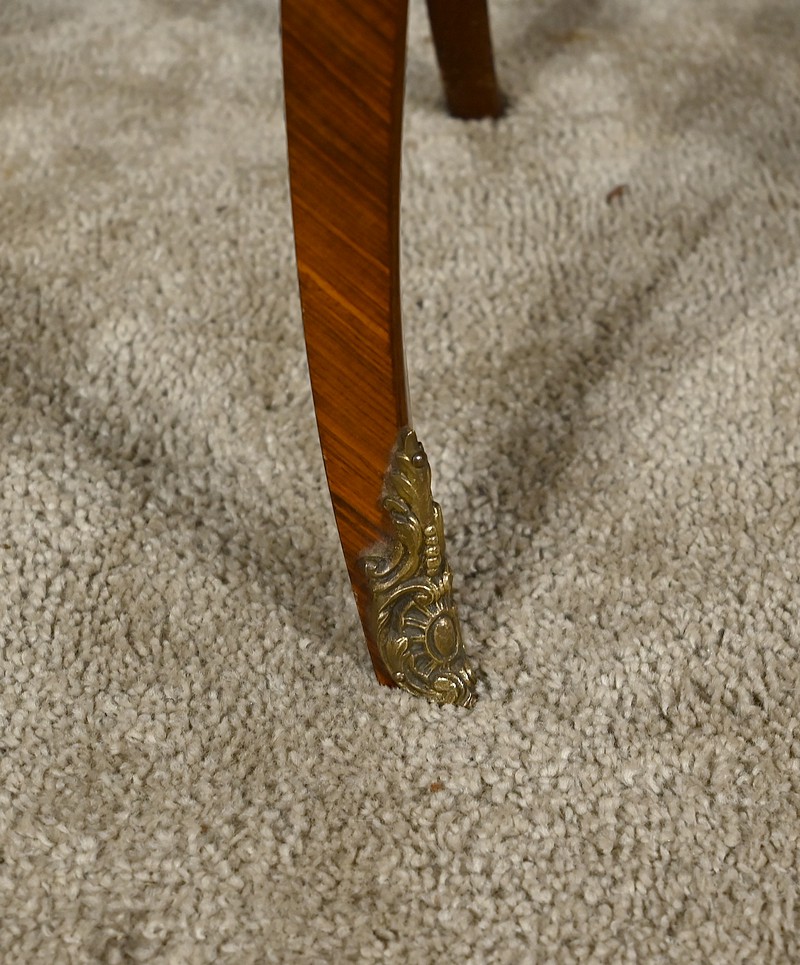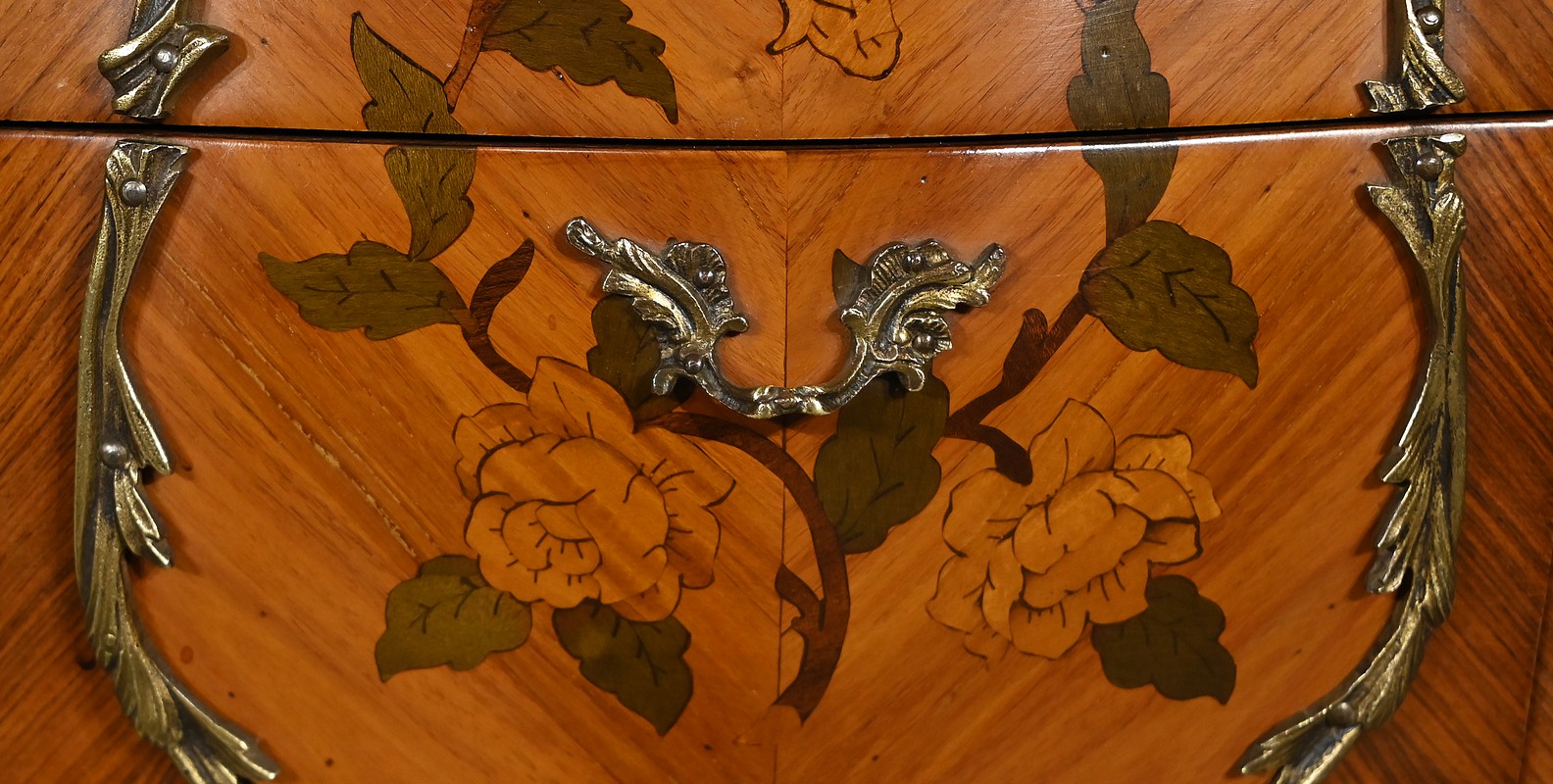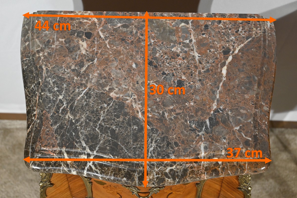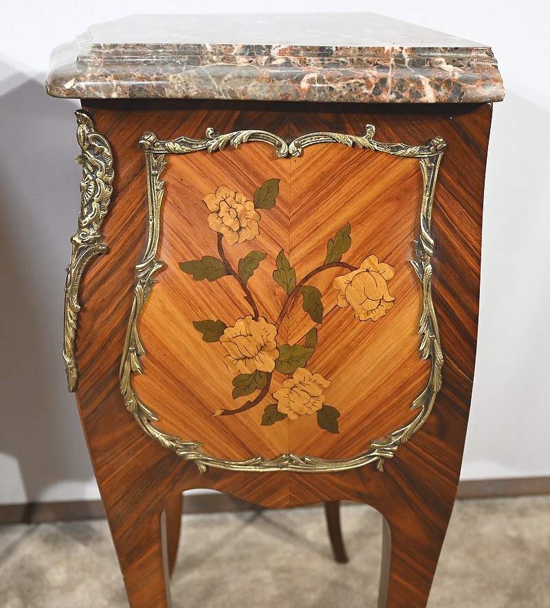 Belle paire de chevets galbés en façade ainsi que sur les côtés, sommés d’un marbre brèche des Pyrénées d’origine avec bec de corbin et disposant de deux tiroirs. La façade de ceux-ci est en placage de bois de rose disposé en diagonal et agrémenté d’incrustations de marqueteries de bois clair et teinté formant un charmant bouquet de fleurs. Cette marqueterie est entourée de garnitures en bronze figurant des branchages et des fleurs. Une poignée en bronze finement ciselée permet l’ouverture de chaque tiroir.
