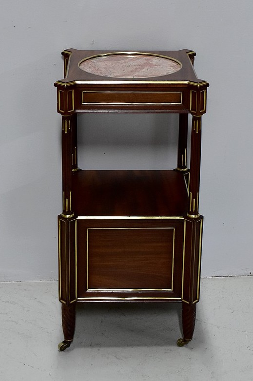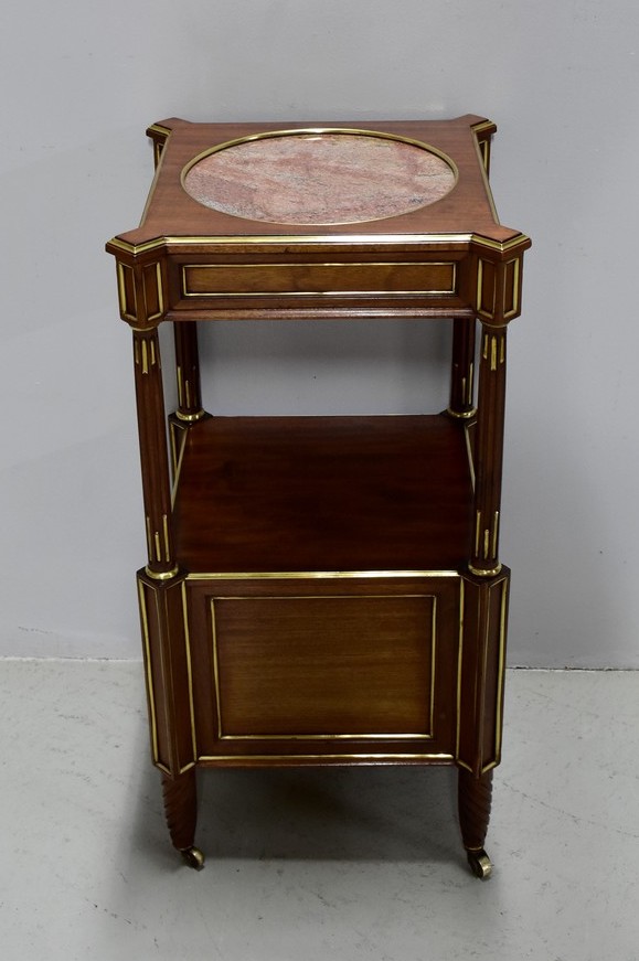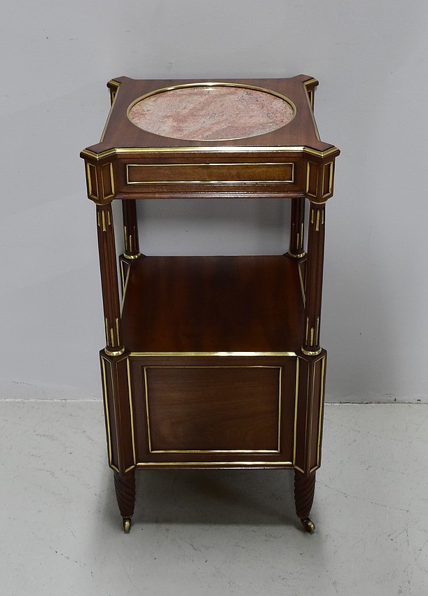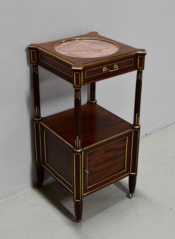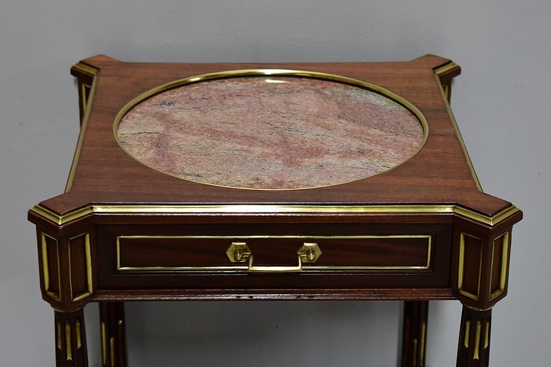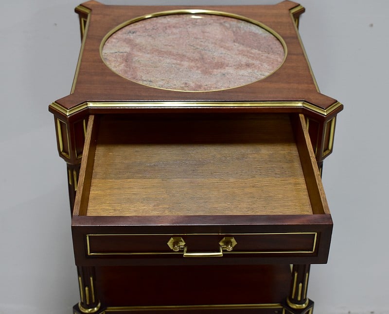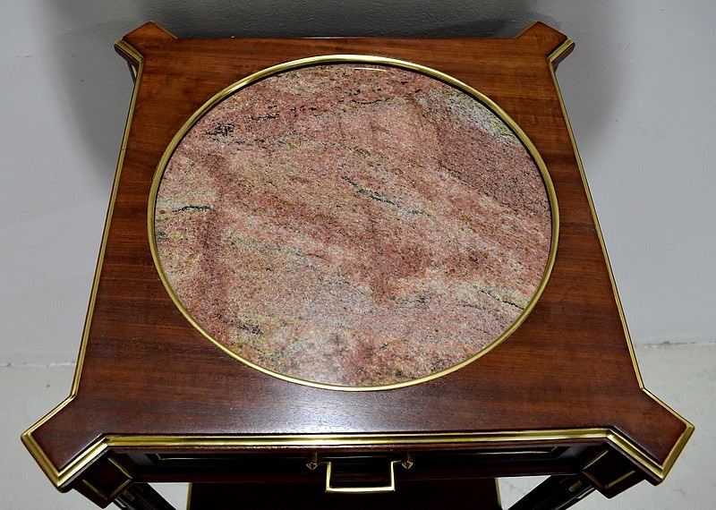 Élégante et originale petite table de chevet de style Louis XVI en Acajou massif et placage d’Acajou, panneautée et incrusté de laiton toutes faces.