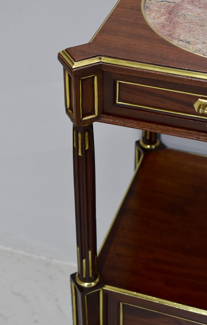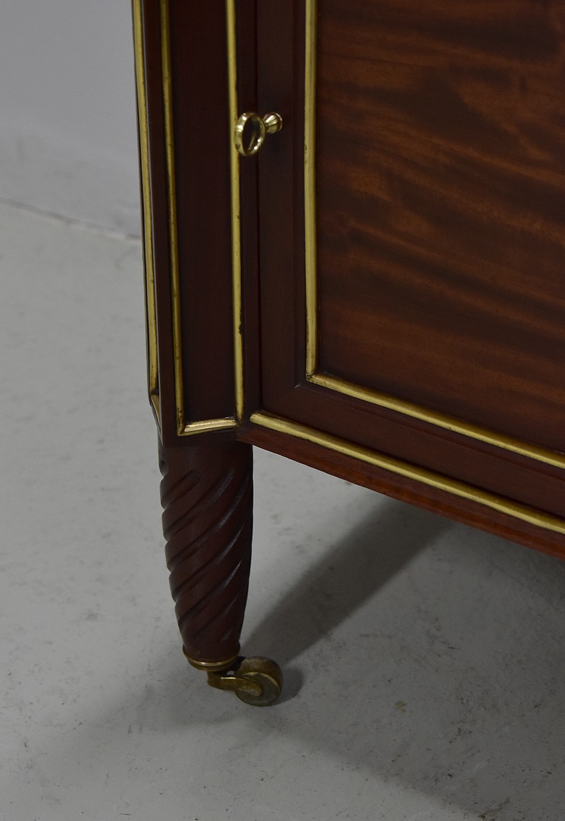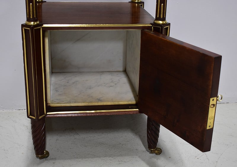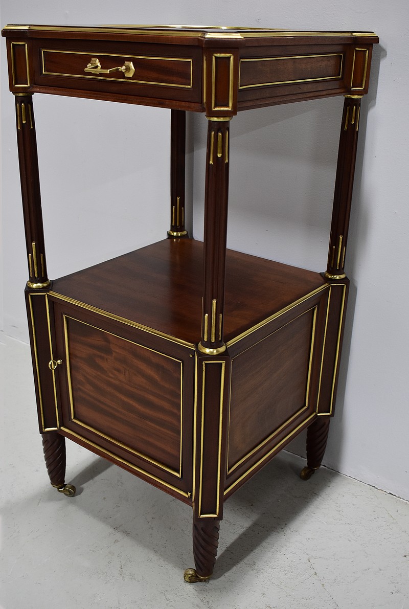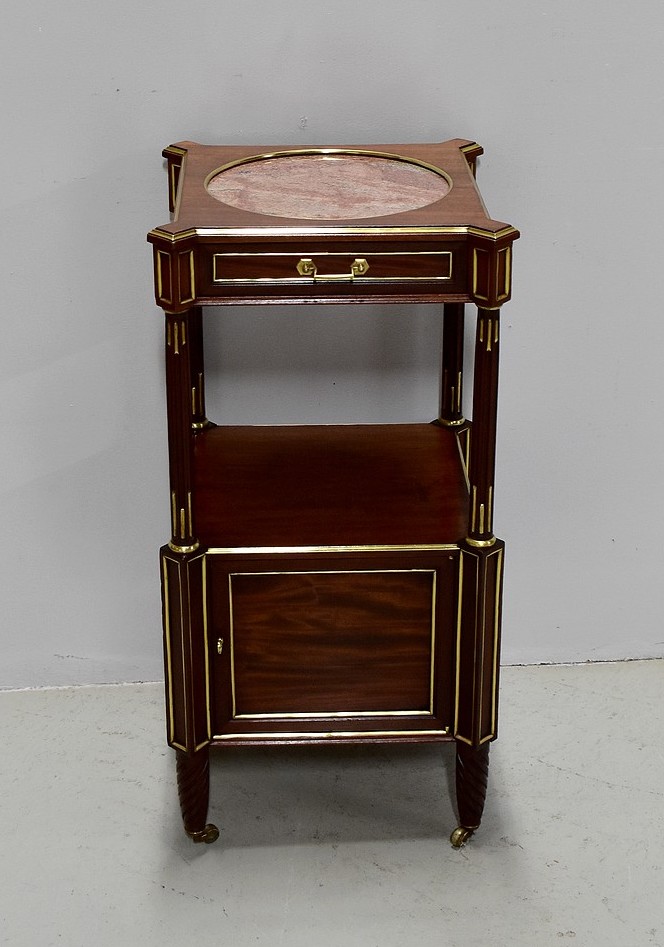 Élégante et originale petite table de chevet de style Louis XVI en Acajou massif et placage d’Acajou, panneautée et incrusté de laiton toutes faces.