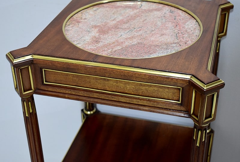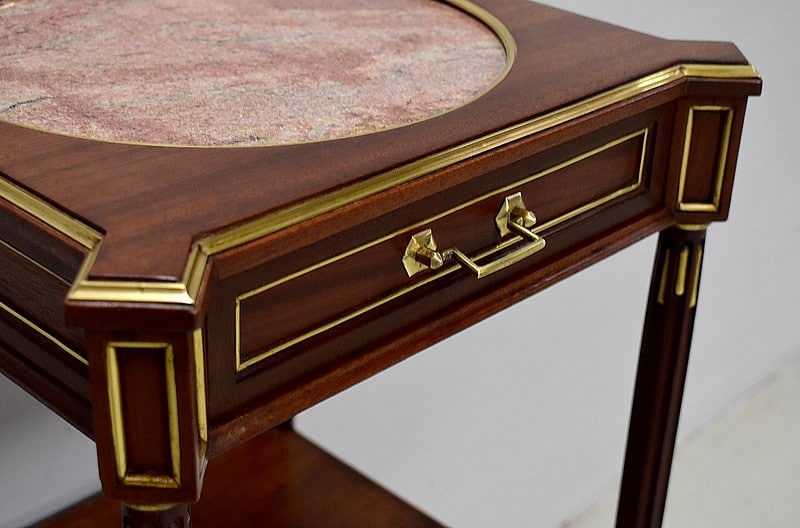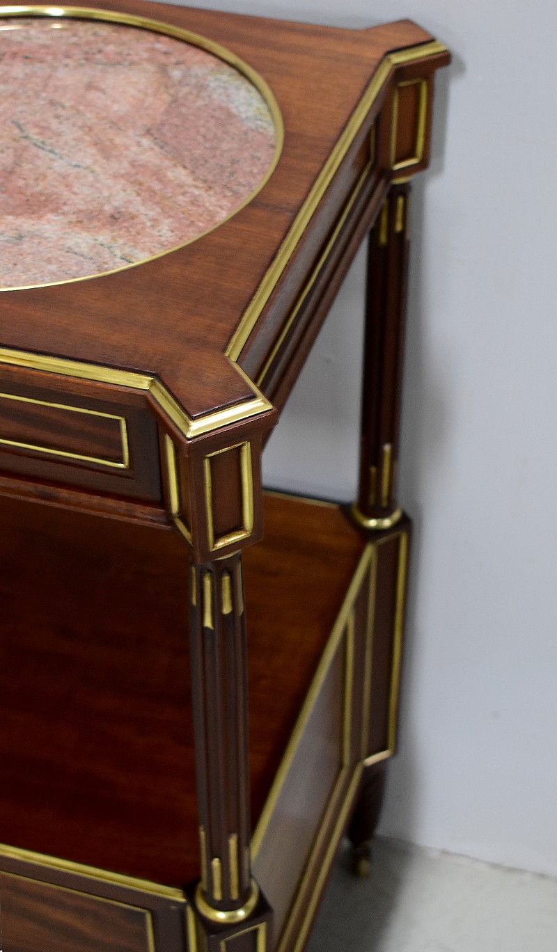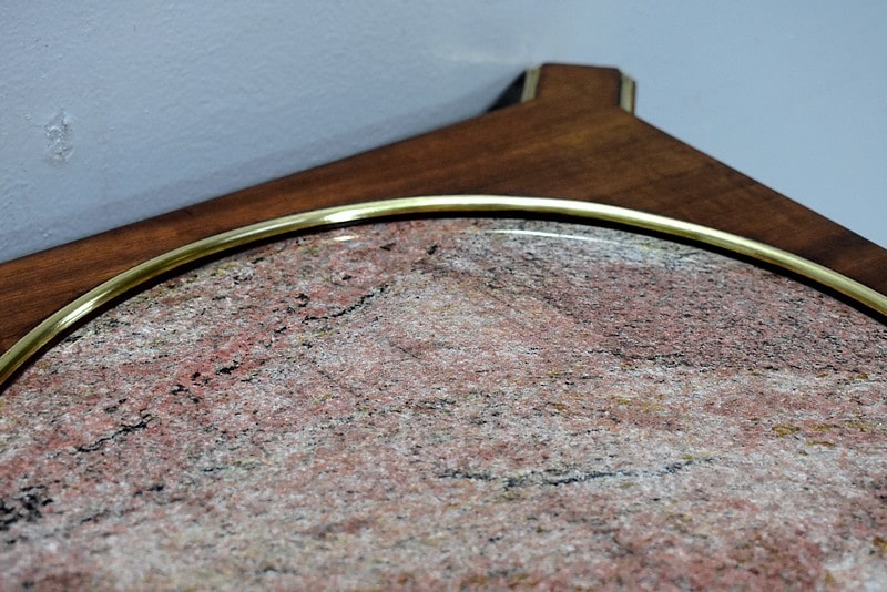 Son dessus arbore un marbre rose encastré dans une forme circulaire cerclée de laiton.