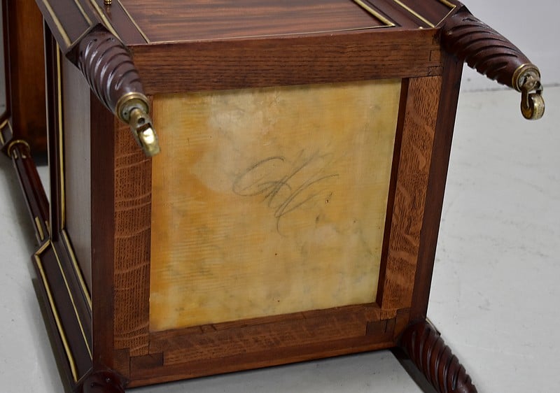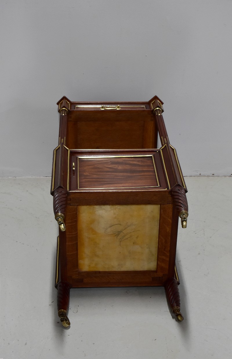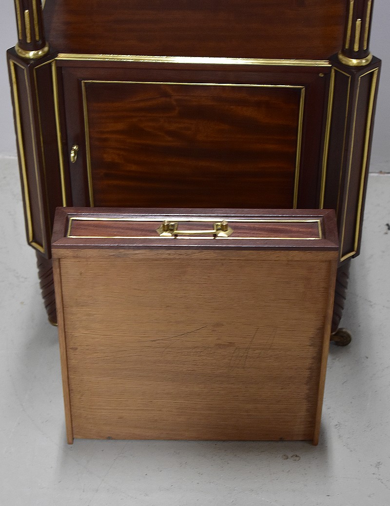 Elle ouvre par un petit tiroir panneauté en partie haute agrémenté d’une poignée en bronze et incrusté de filet de laiton.