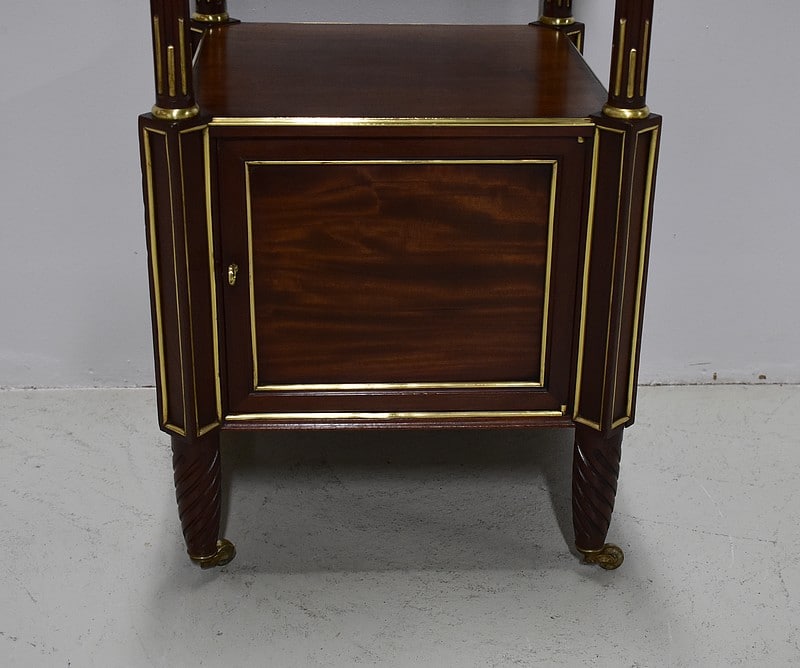 Les montants de forme rectangulaire en partie haute et basse sont à ressaut, alternant avec une partie du milieu cannelée et rudentée de laiton. Ils terminent en pieds tournés à cannelures torsadées montés sur roulettes.