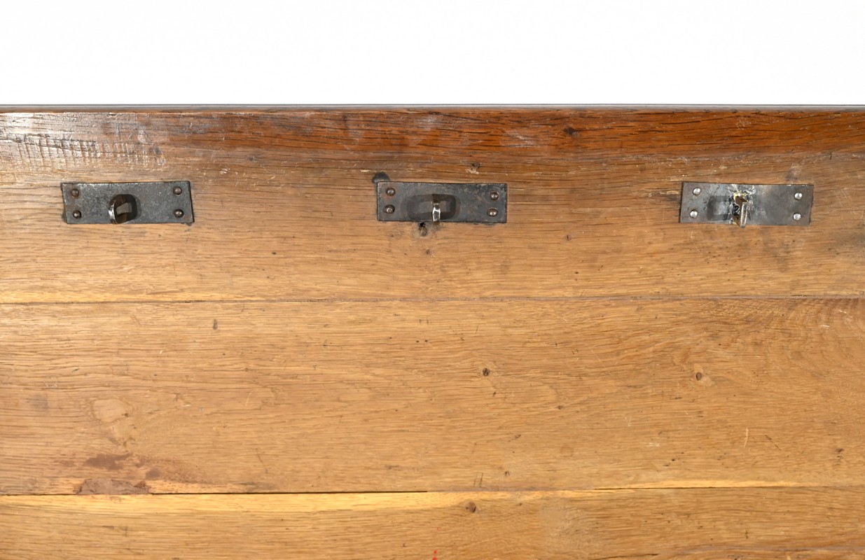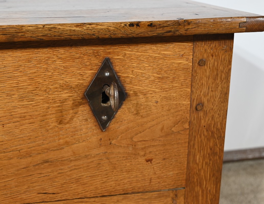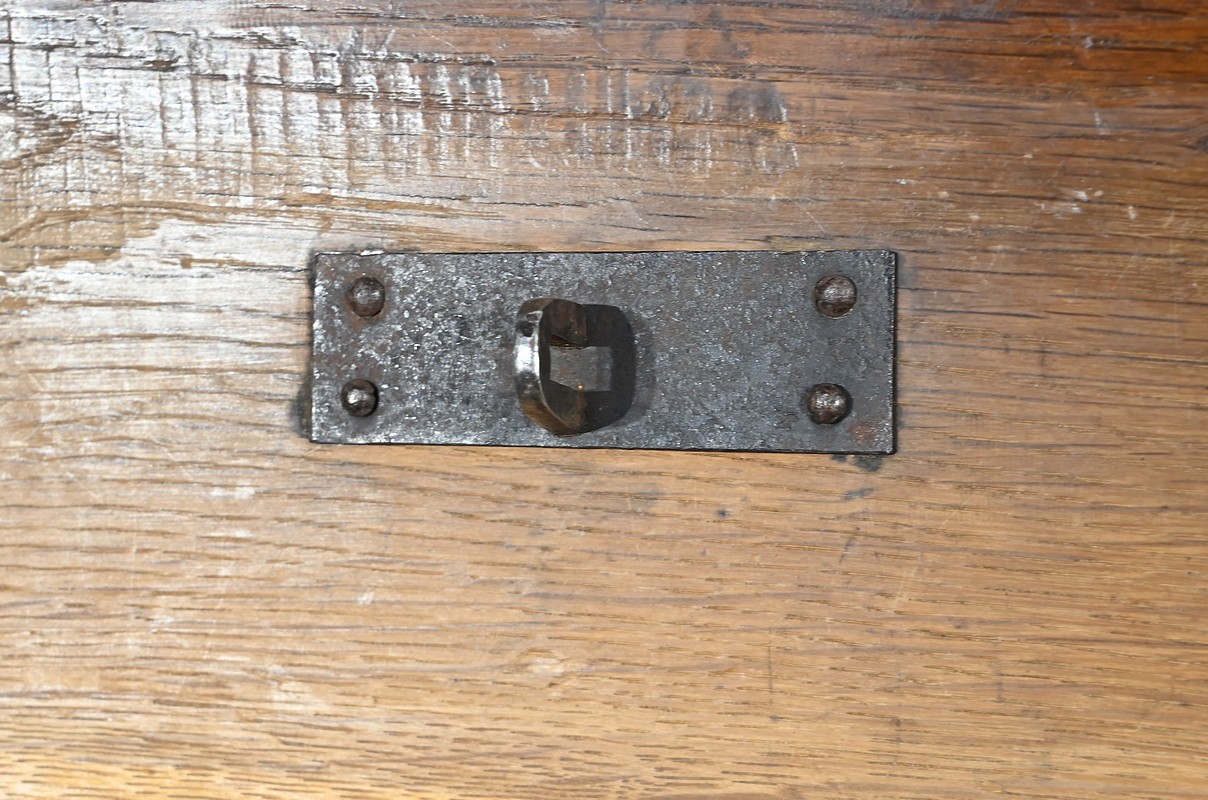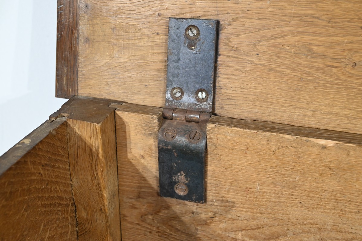 Ce coffre de communauté en chêne massif présente un couvercle monté sur charnières en fer et maintenu ouvert par un compas dit à genou.