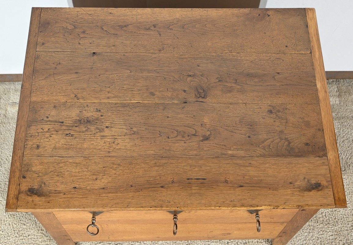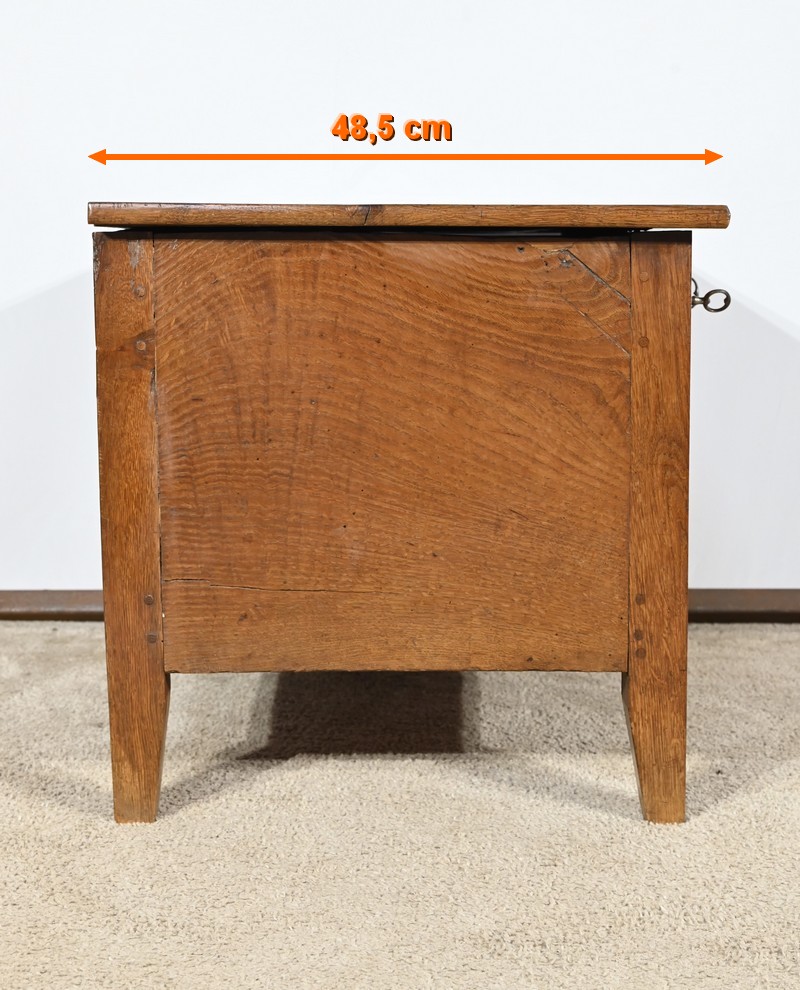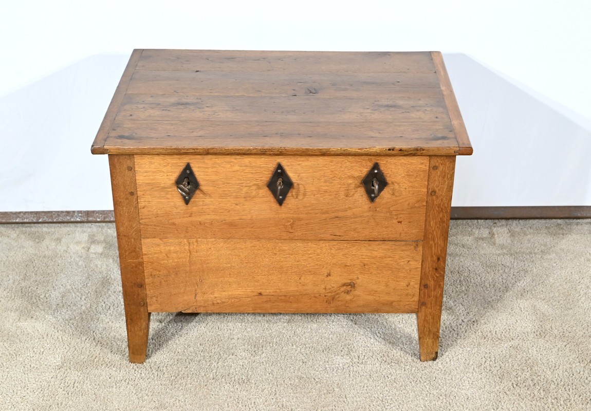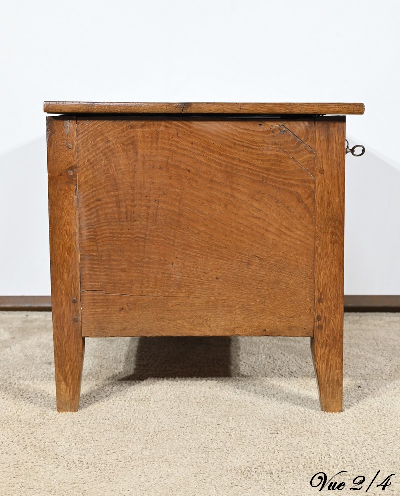 Ce coffre de communauté en chêne massif présente un couvercle monté sur charnières en fer et maintenu ouvert par un compas dit à genou.