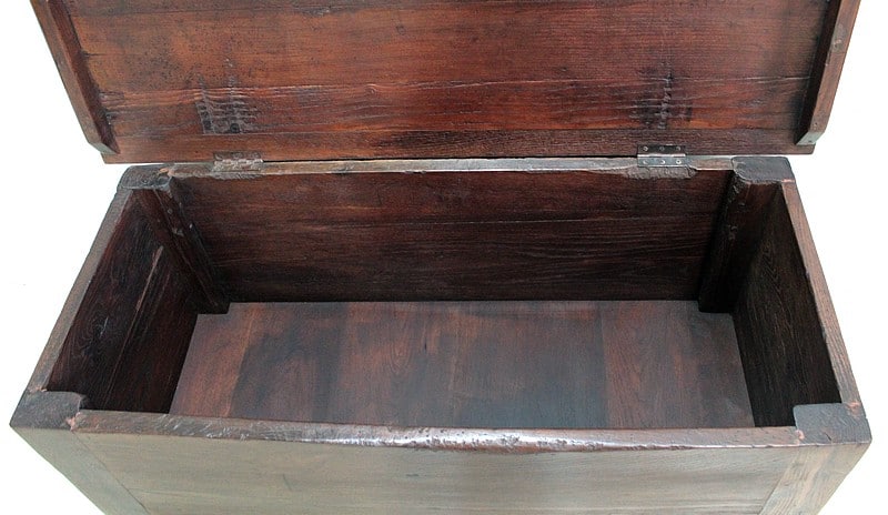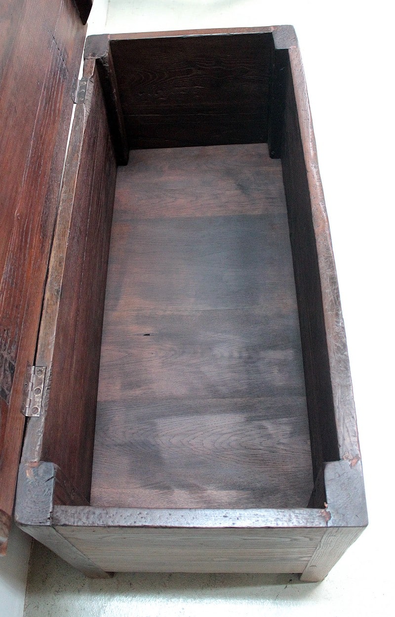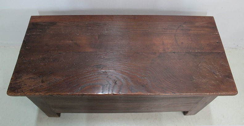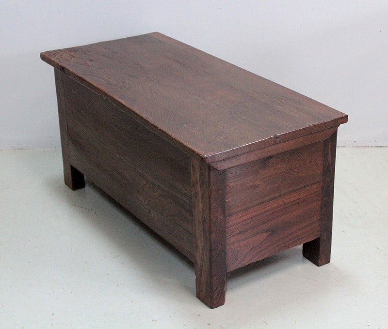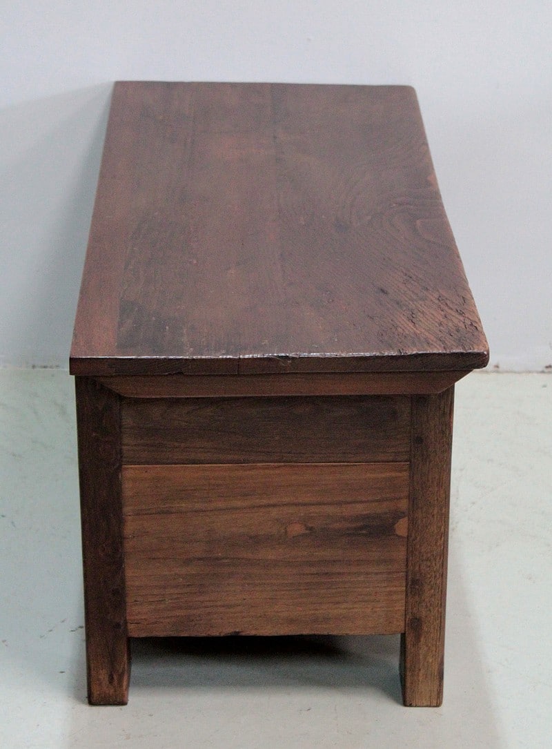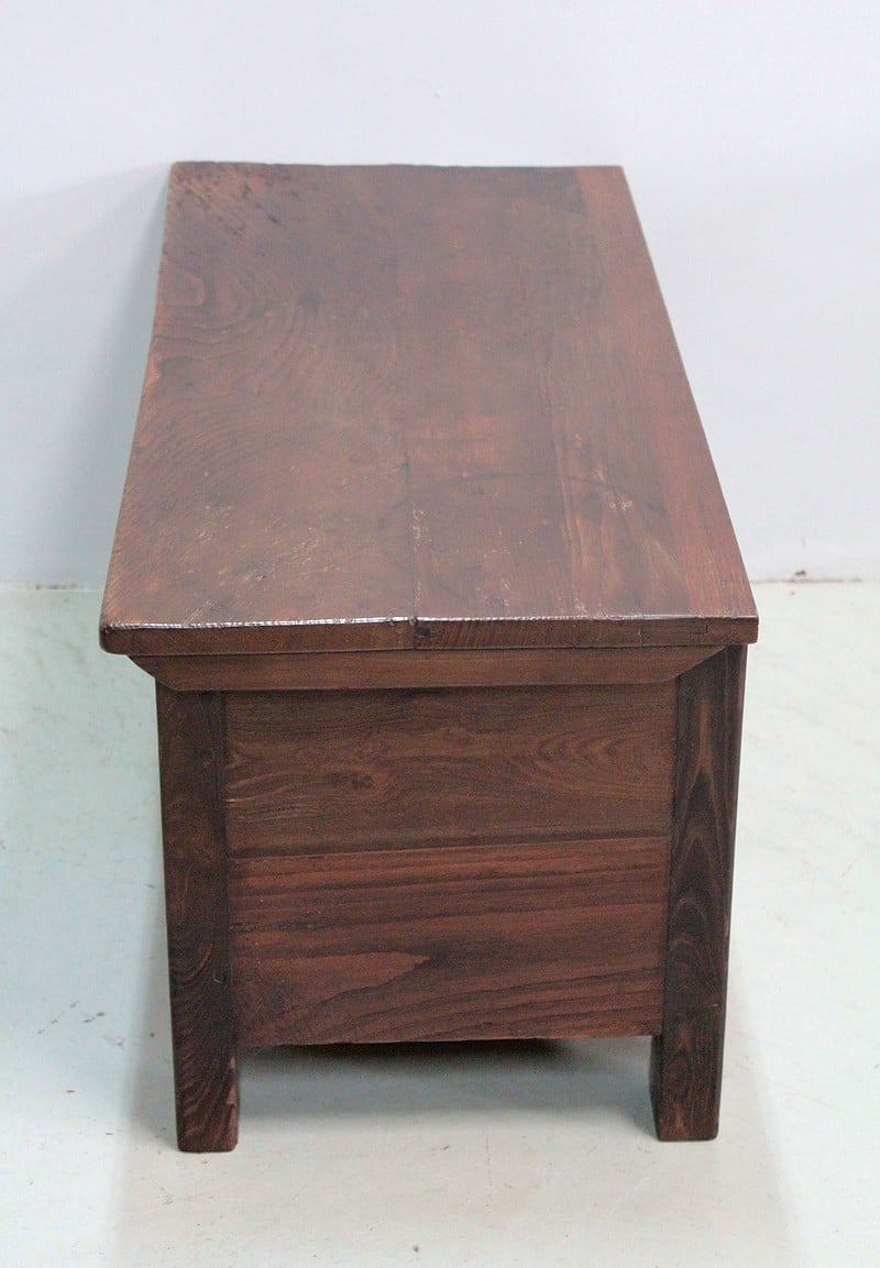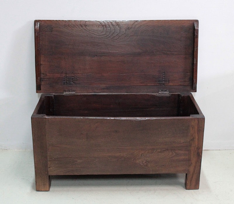 Beau coffre solide en châtaigner ouvrant par le dessus pouvant faire office de banc.