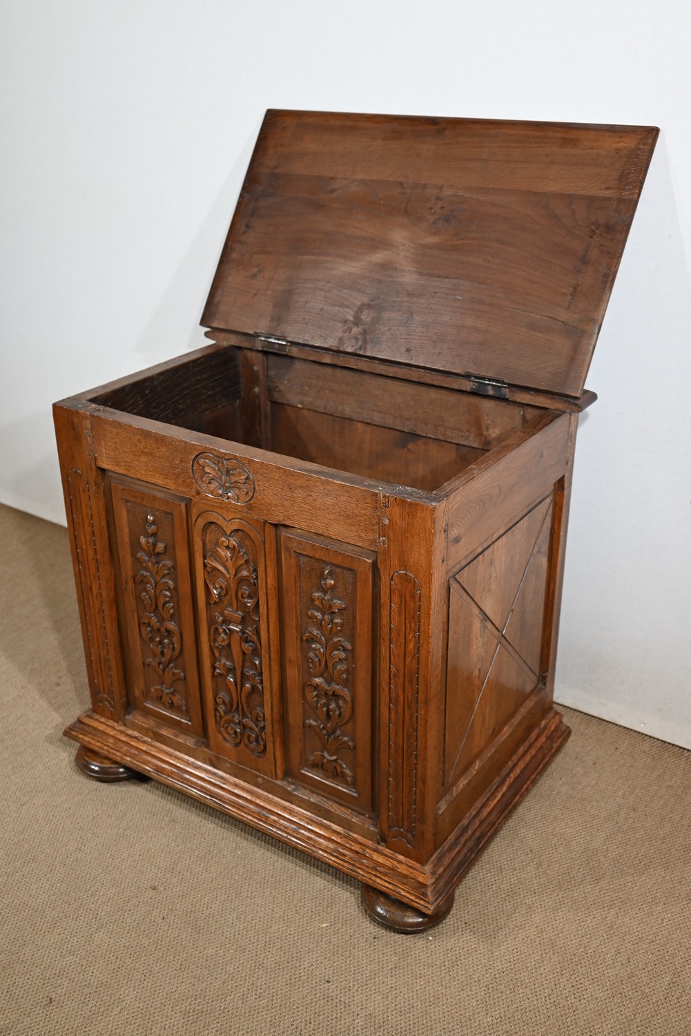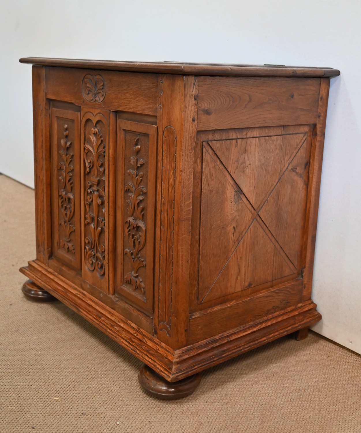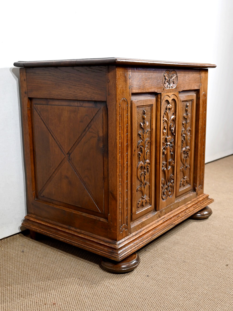 Ce petit coffre en chêne massif goût Renaissance possède une façade à deux panneaux latéraux, ornés de plates-bandes, et dont les motifs centraux, sculptés, sont des fleurs et feuillages. Au milieu, on retrouve cette même inspiration, encadrée par des volutes.