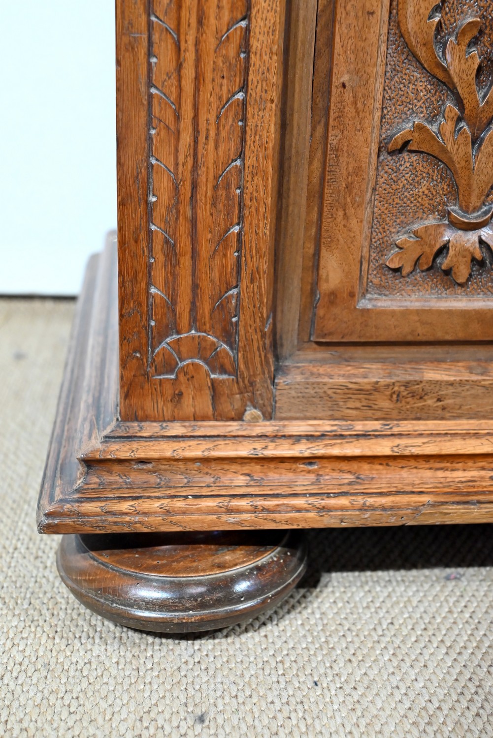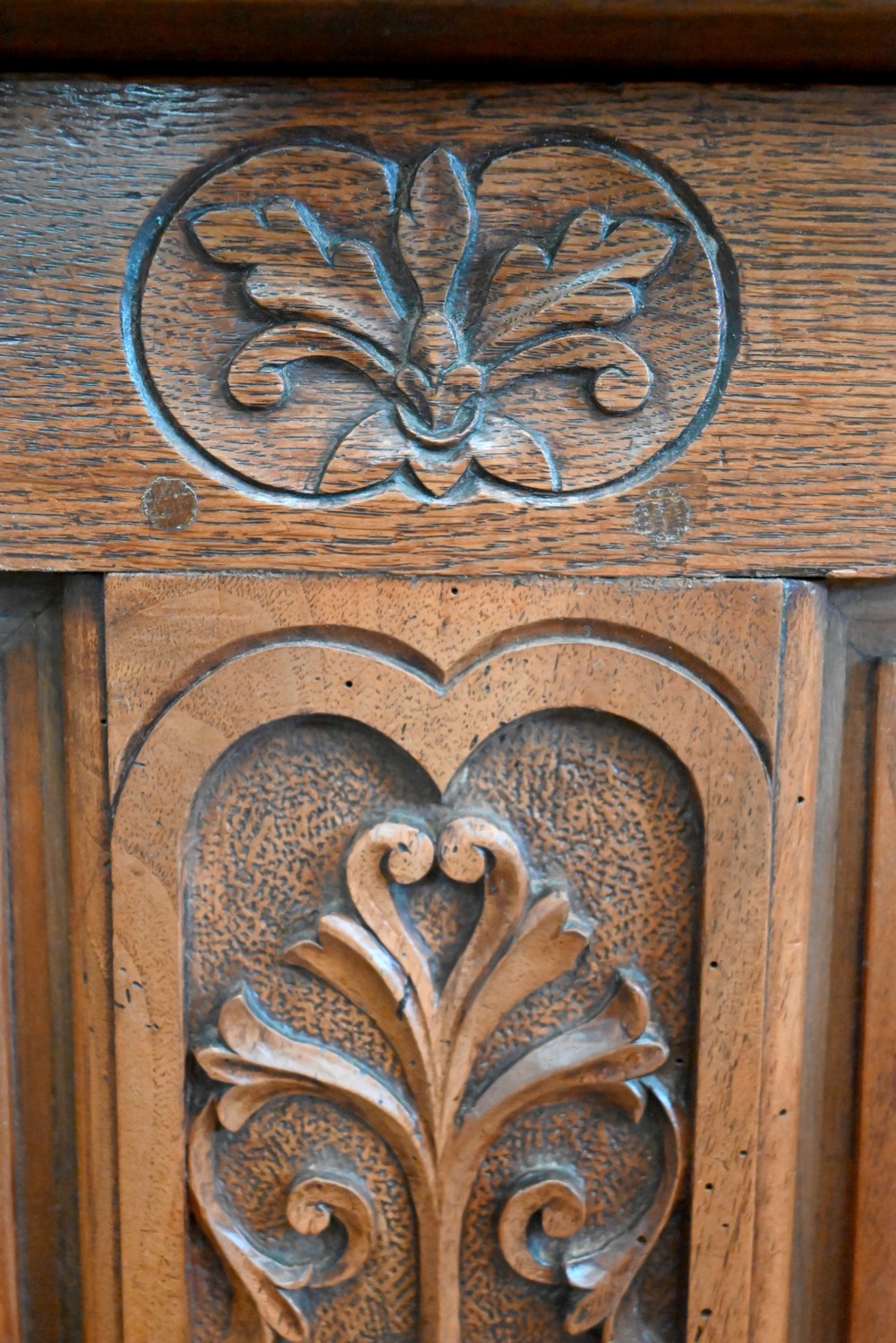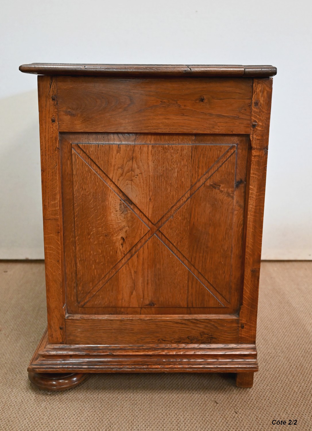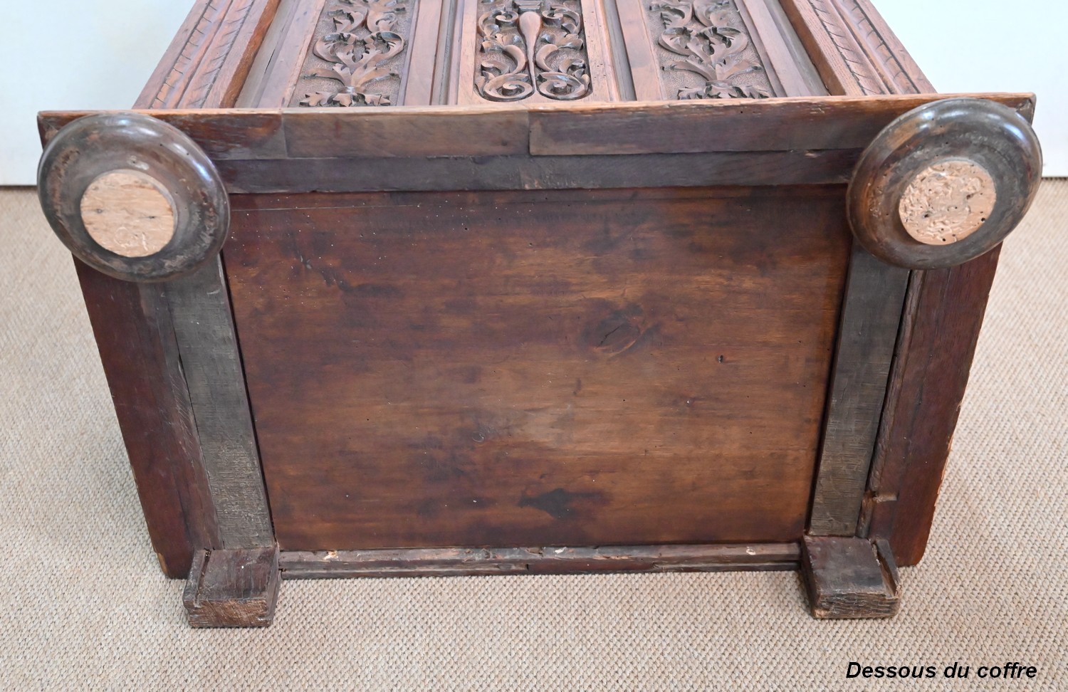 Ce petit coffre en chêne massif goût Renaissance possède une façade à deux panneaux latéraux, ornés de plates-bandes, et dont les motifs centraux, sculptés, sont des fleurs et feuillages. Au milieu, on retrouve cette même inspiration, encadrée par des volutes.