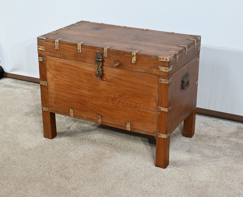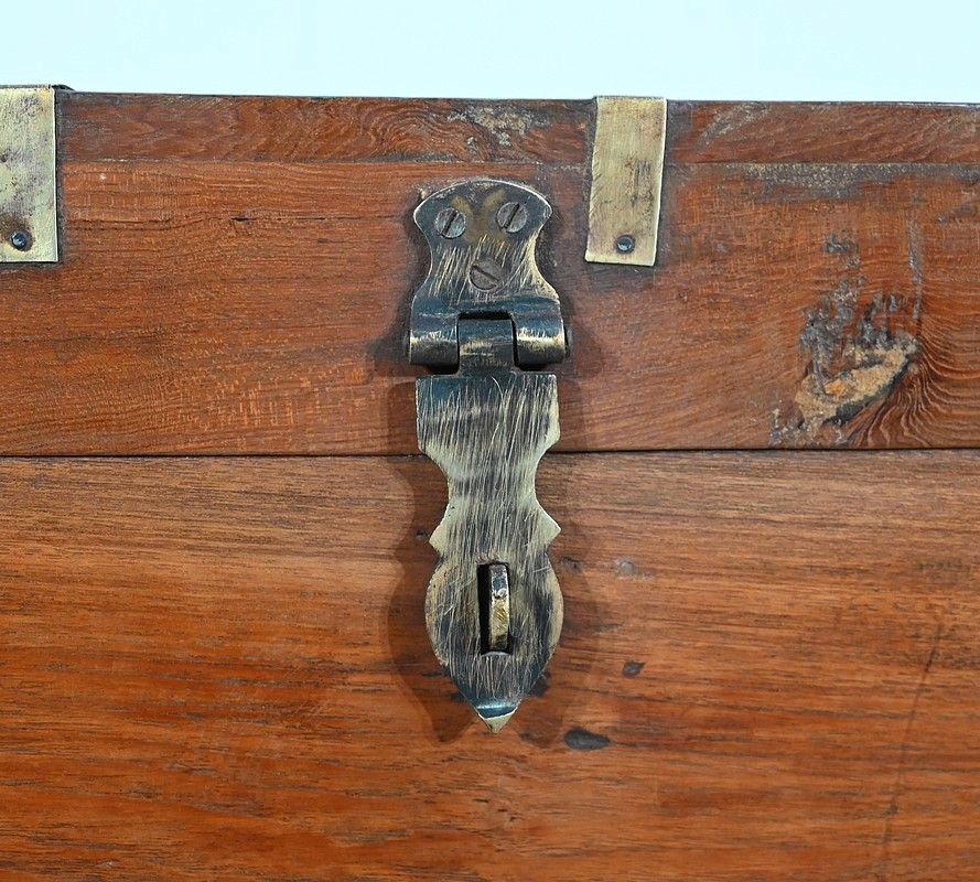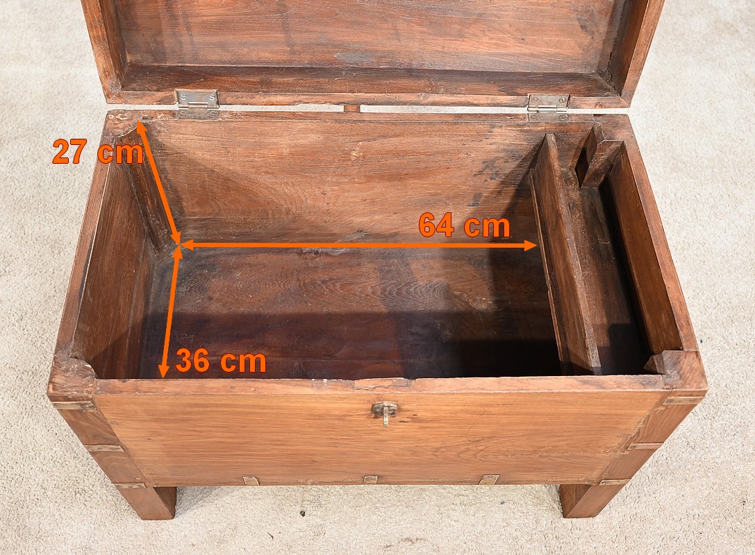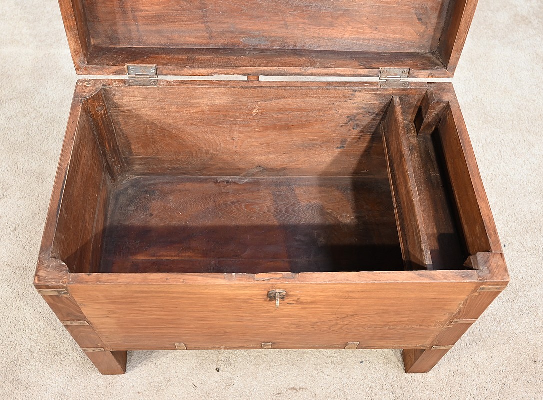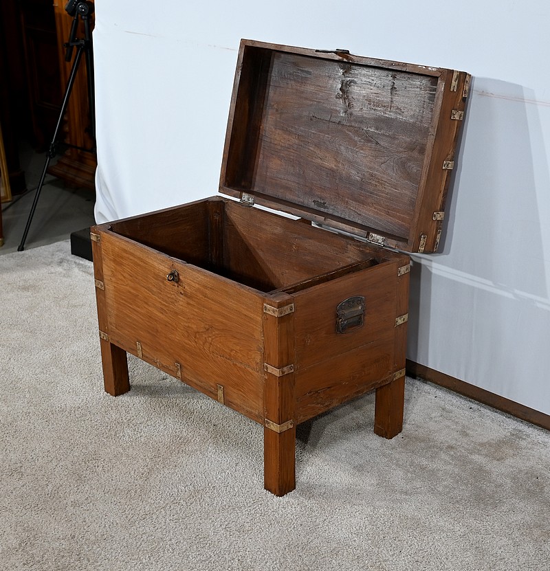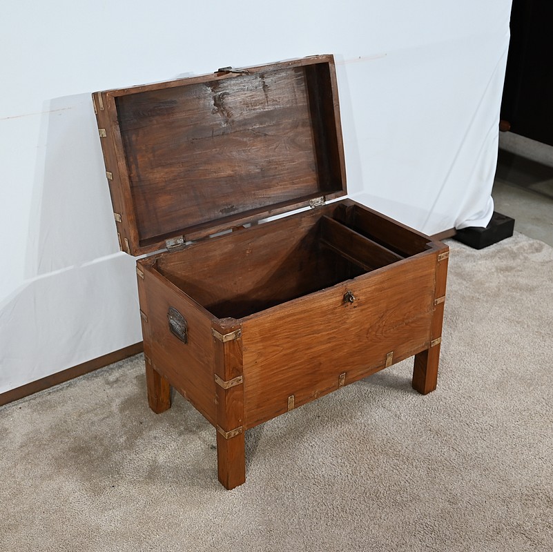 Cette malle montée sur quatre pieds, entièrement en teck massif se caractérise par ses nombreuses lanières cloutées en laiton affirmant son caractère. Ces dernières relient solidement toutes les faces du coffre. A l’ouverture, nous découvrons un grand espace de rangement avec un casier latéral. Son transport est rendu possible par la présence sur les côtés de poignées tombantes en fer. Un objet charismatique et authentique.