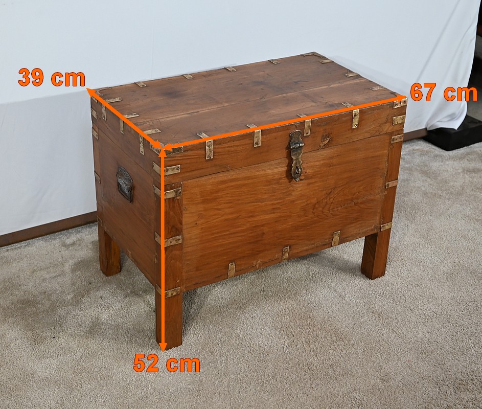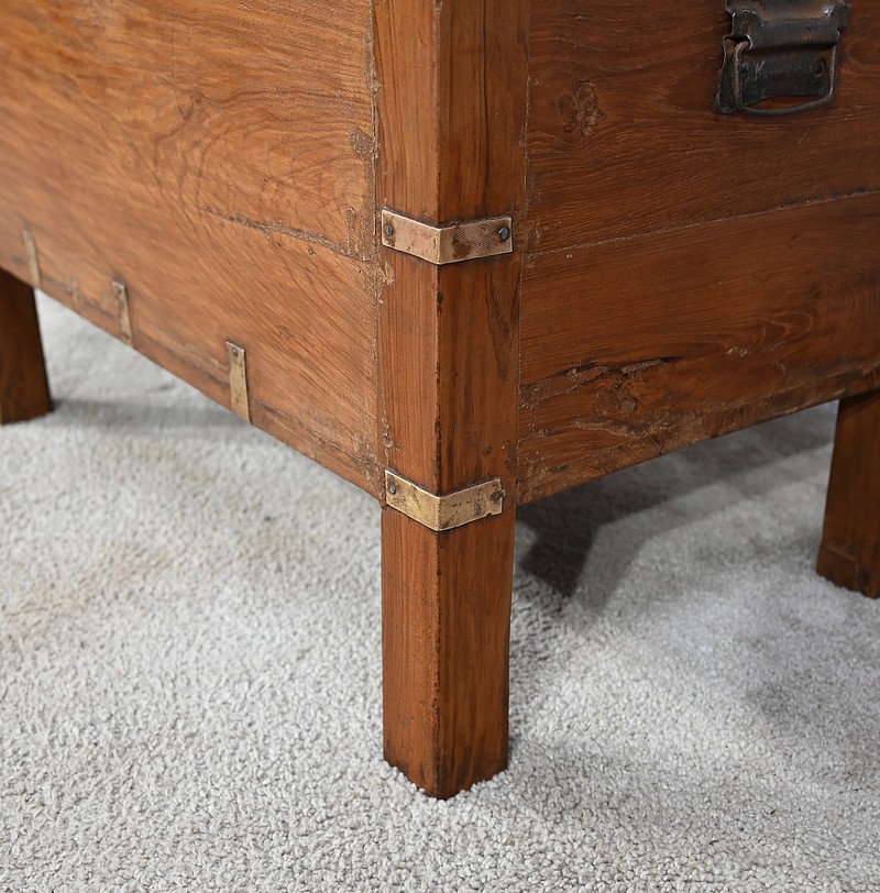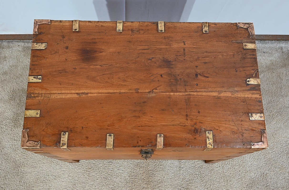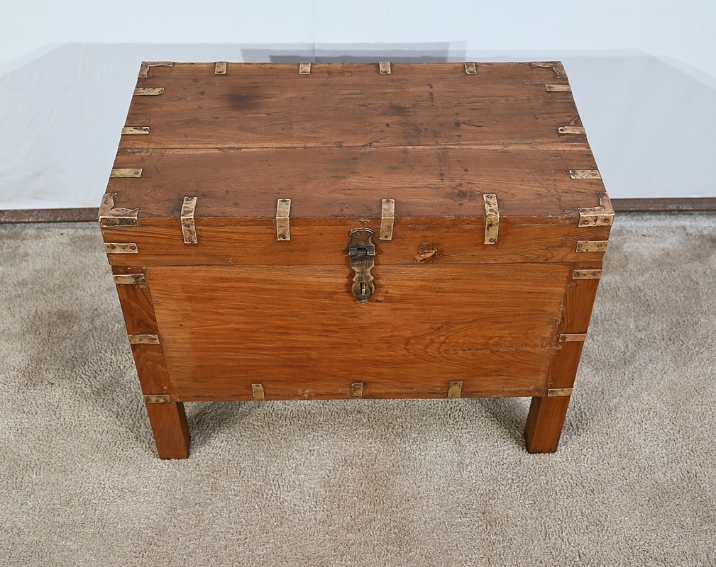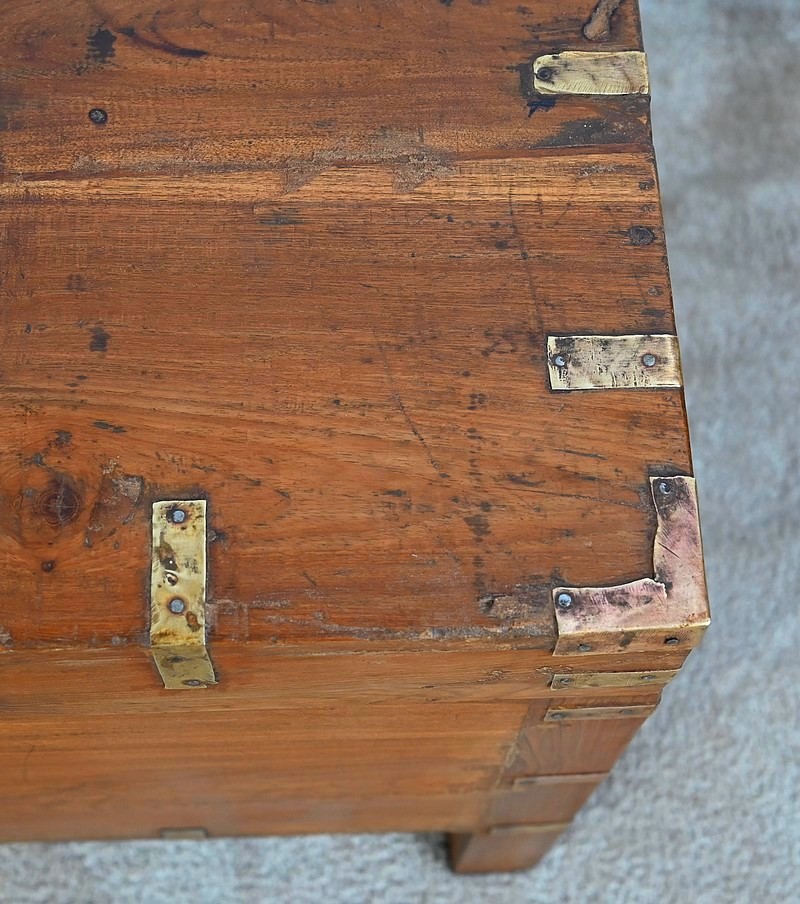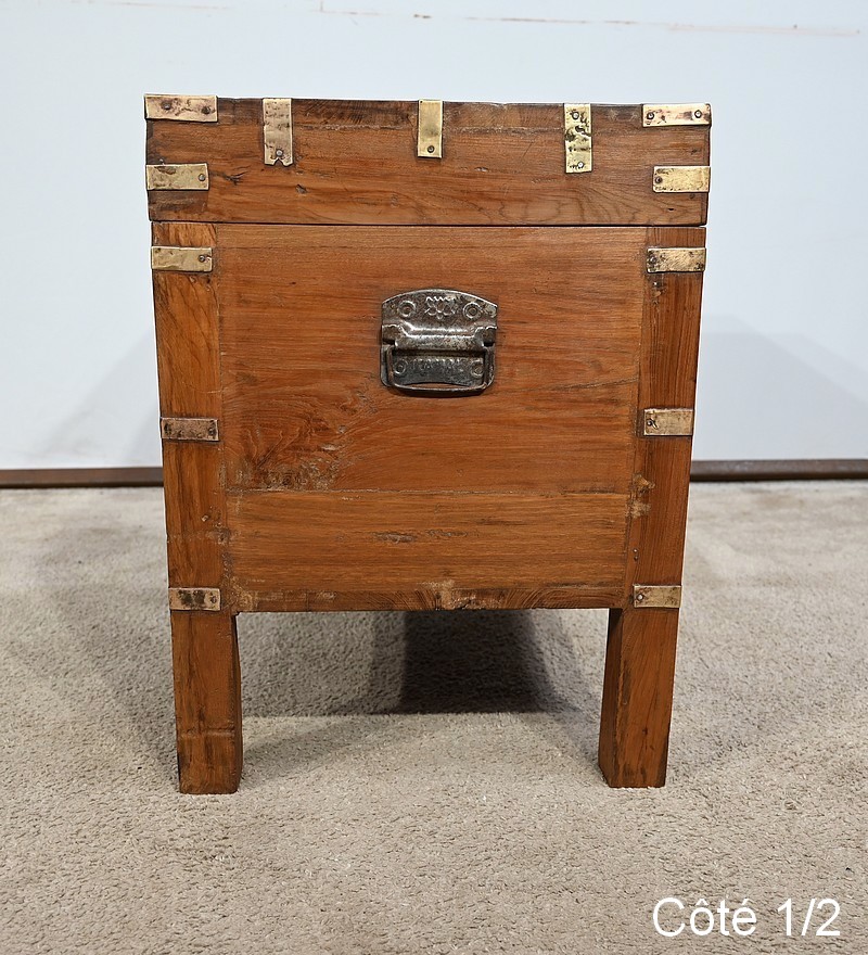 Cette malle montée sur quatre pieds, entièrement en teck massif se caractérise par ses nombreuses lanières cloutées en laiton affirmant son caractère. Ces dernières relient solidement toutes les faces du coffre. A l’ouverture, nous découvrons un grand espace de rangement avec un casier latéral. Son transport est rendu possible par la présence sur les côtés de poignées tombantes en fer. Un objet charismatique et authentique.
