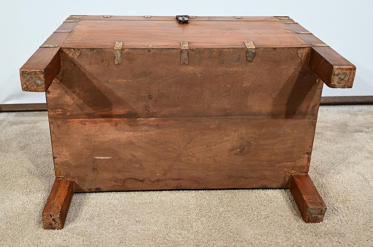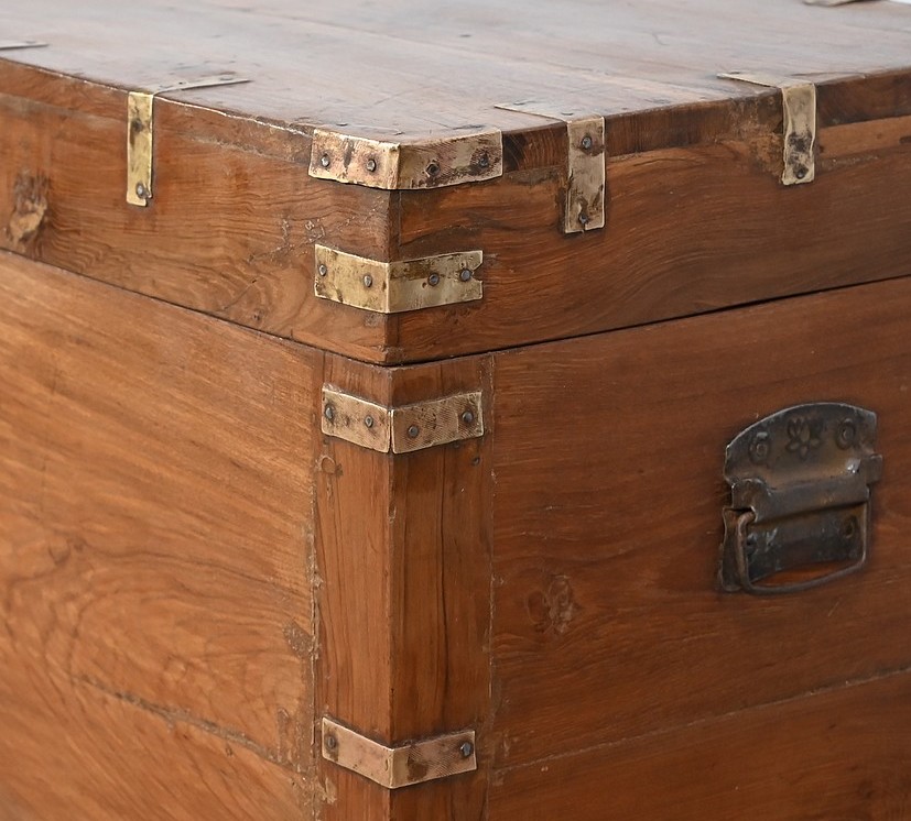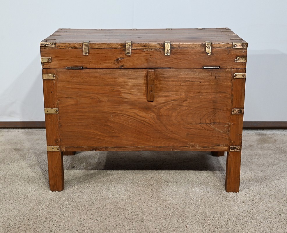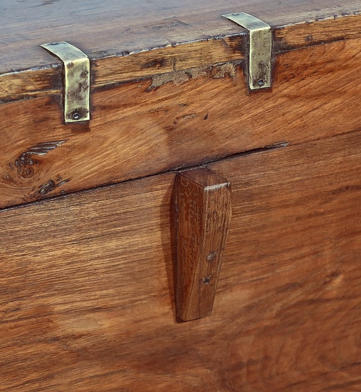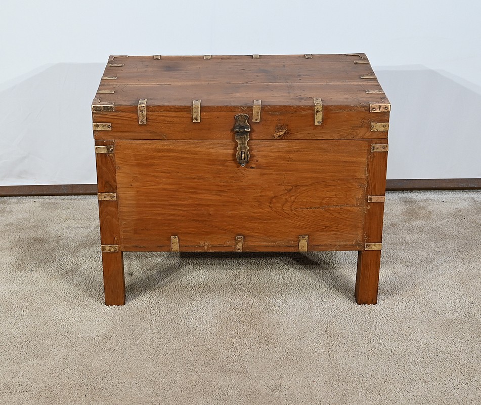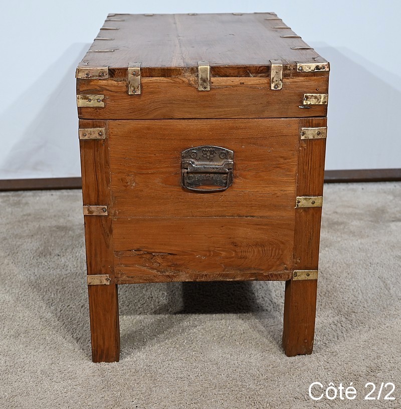 Cette malle montée sur quatre pieds, entièrement en teck massif se caractérise par ses nombreuses lanières cloutées en laiton affirmant son caractère. Ces dernières relient solidement toutes les faces du coffre. A l’ouverture, nous découvrons un grand espace de rangement avec un casier latéral. Son transport est rendu possible par la présence sur les côtés de poignées tombantes en fer. Un objet charismatique et authentique.