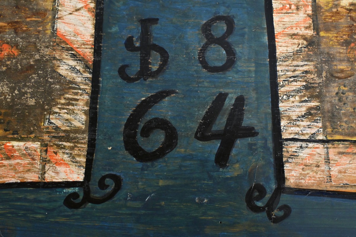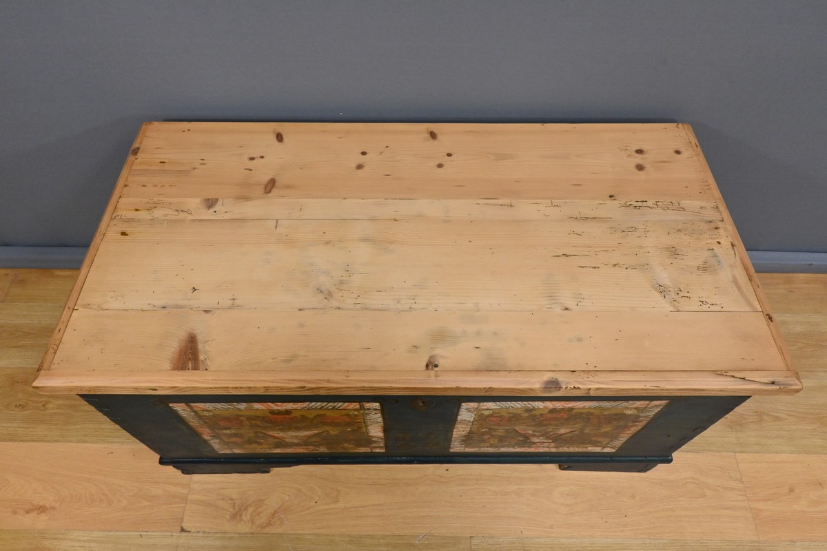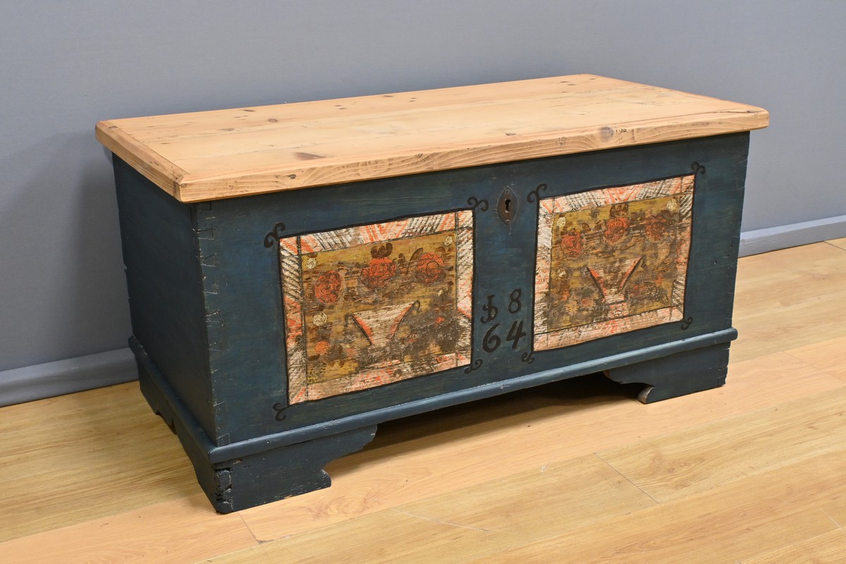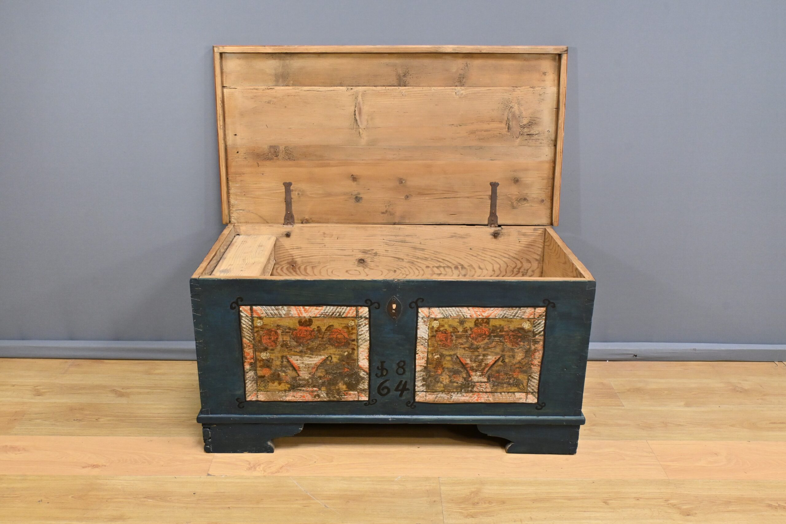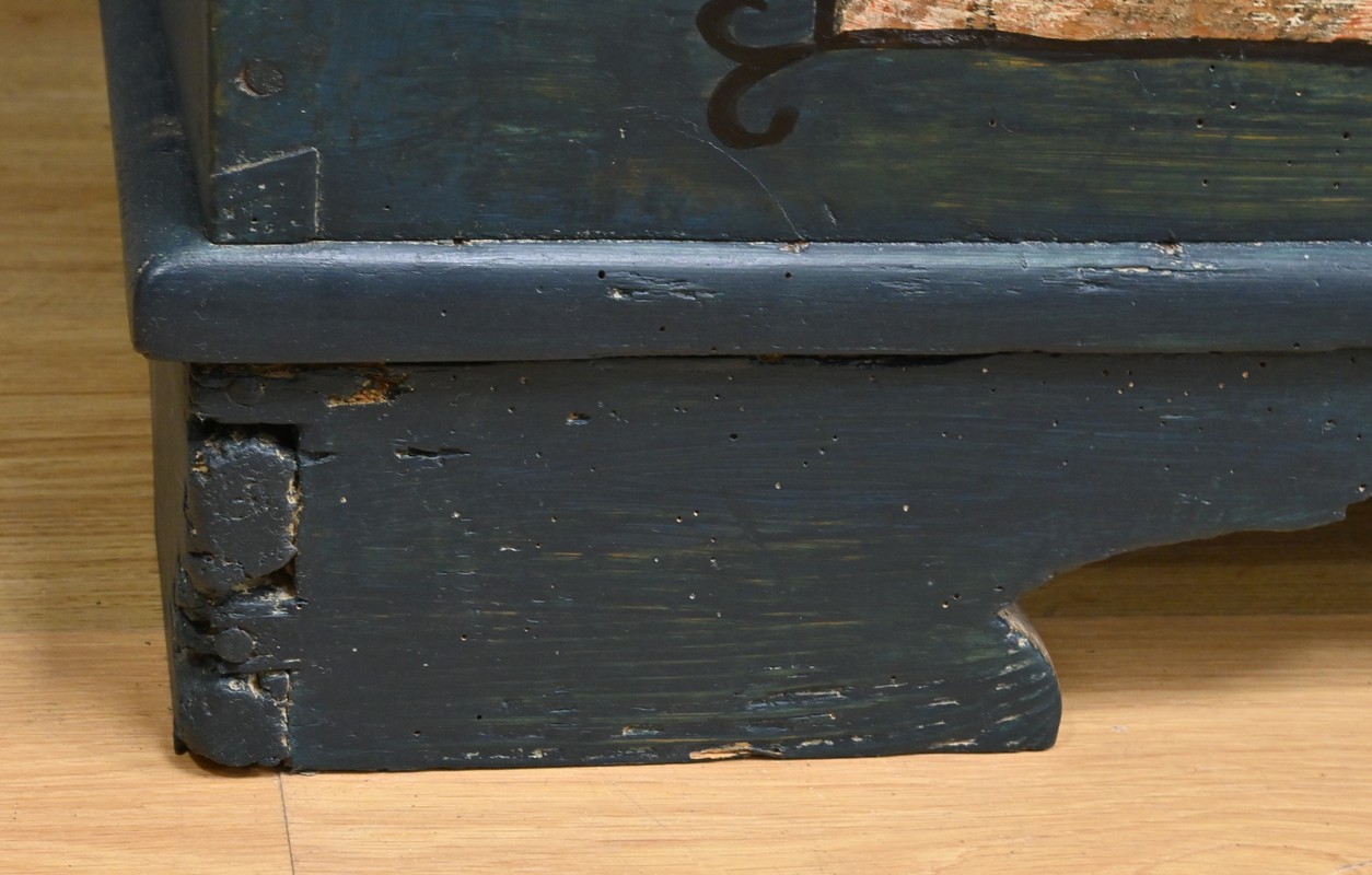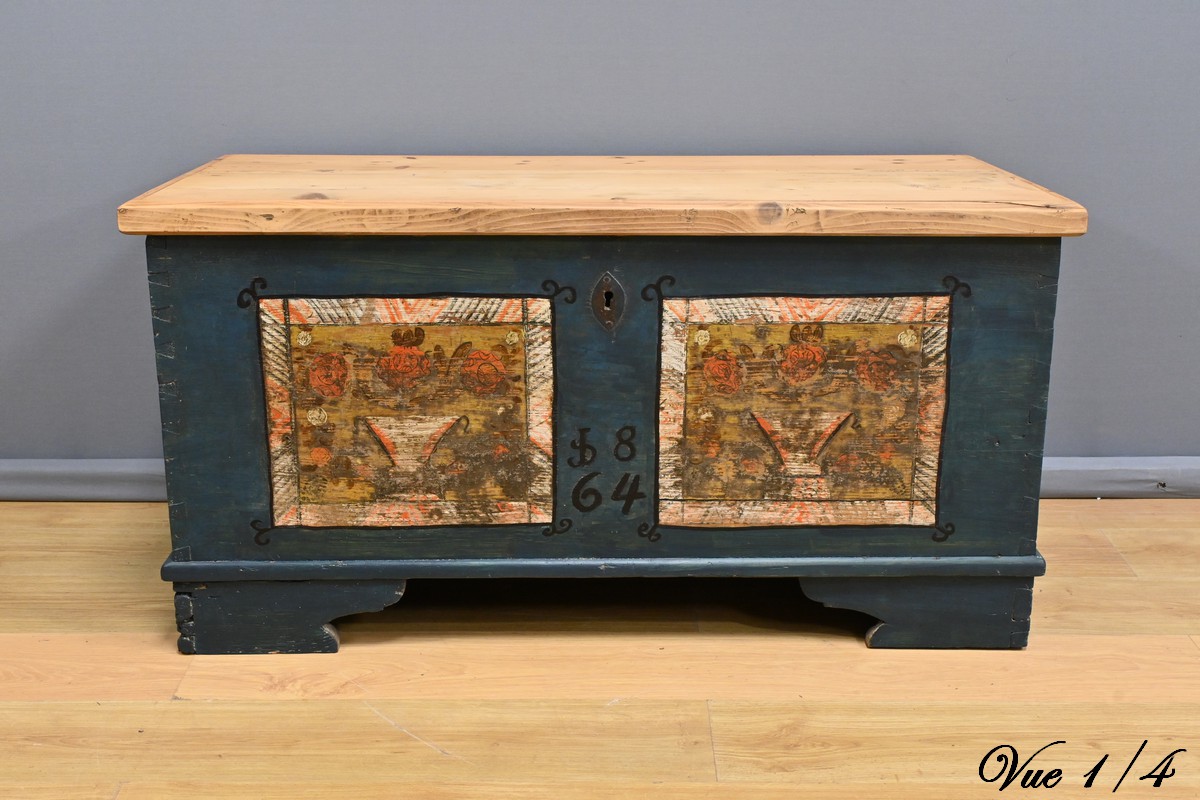 Peint sur fond bleu, ce coffre est décoré de motifs polychromes de fleurs stylisées, témoignant du savoir-faire artisanal de l’époque.