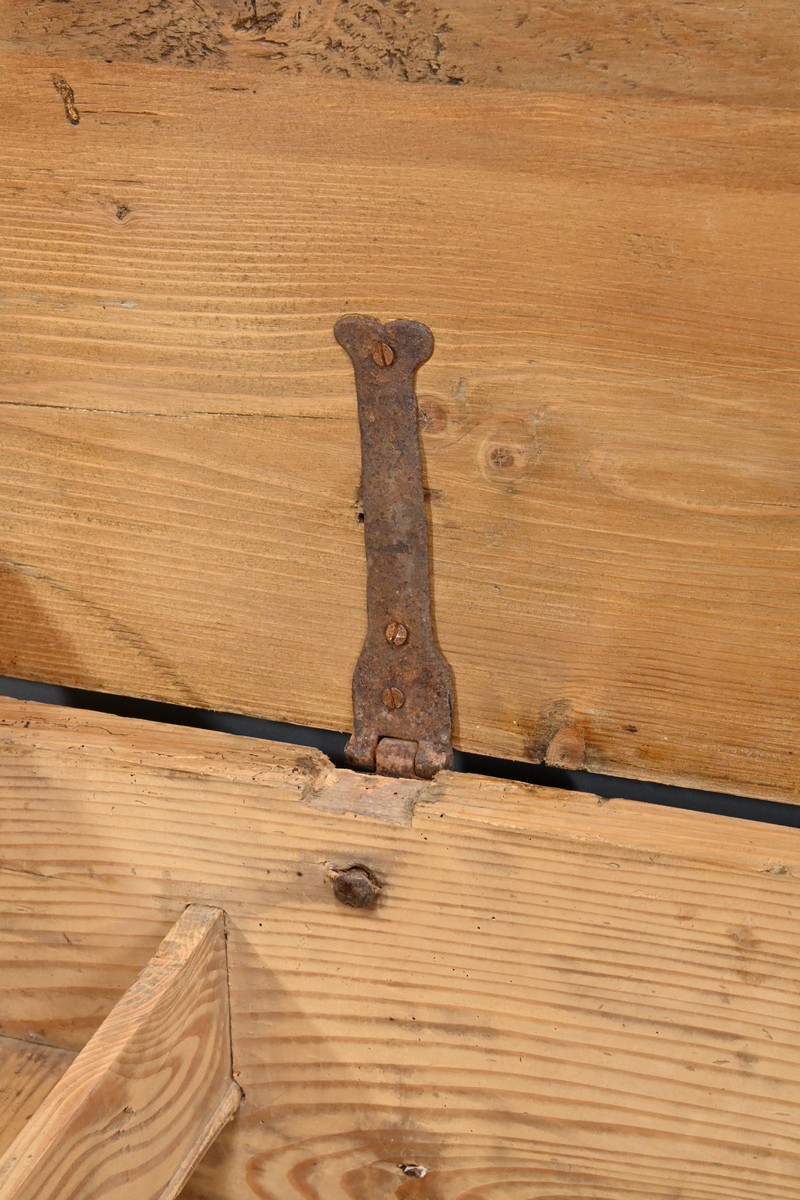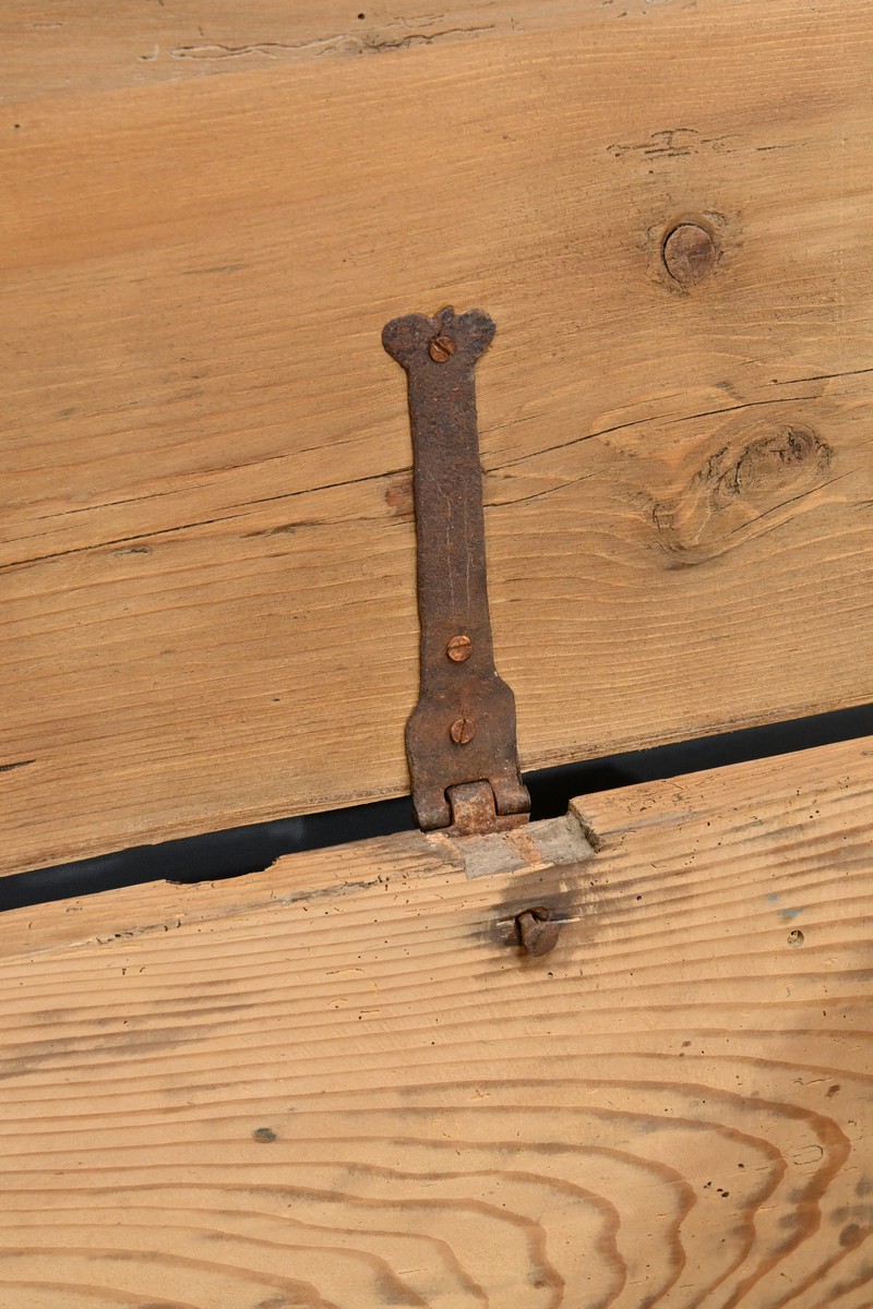 Le couvercle, monté sur des charnières en fer, s’ouvre pour révéler un grand espace de rangement, idéal pour stocker divers objets.